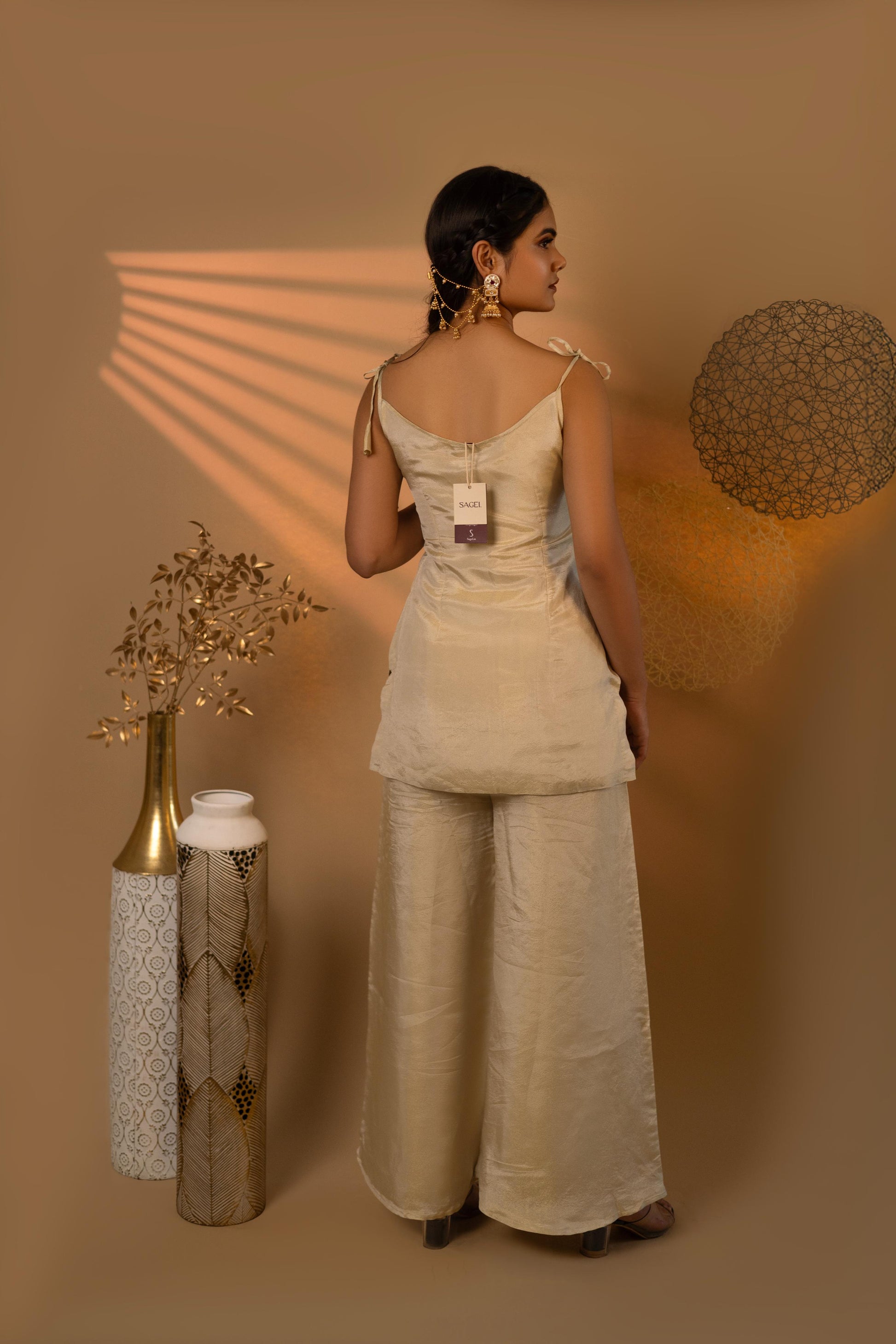 Elevate your festive look with the Beige Knotty Cosmosilk Co-ord Set, crafted in luminous Cosmosilk. Featuring a strappy tie-up top and flowy wide-leg pants, this elegant co-ord offers the ease of loungewear with the charm of occasionwear. Comes with an optional dupatta edged in gold for a touch of tradition.
