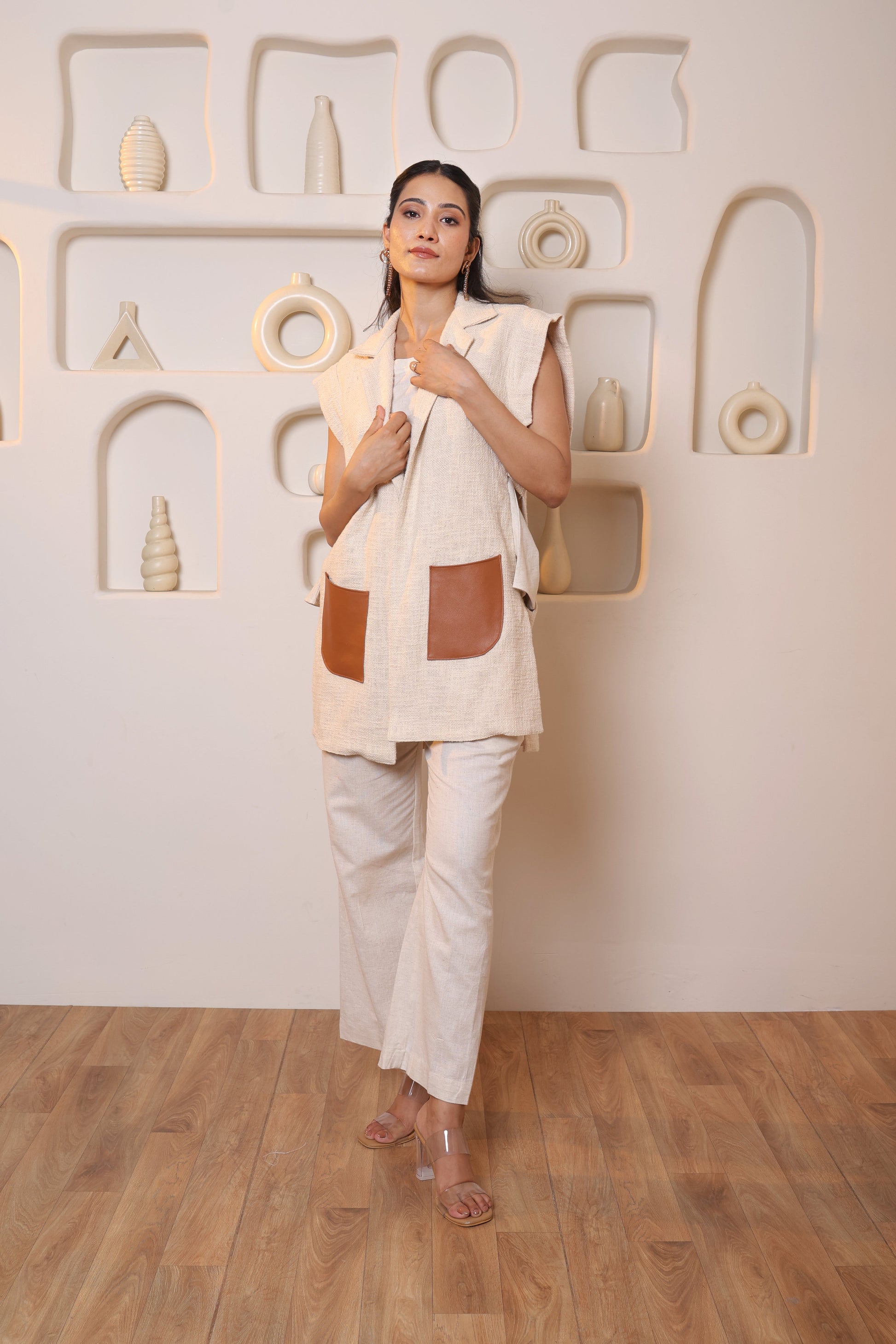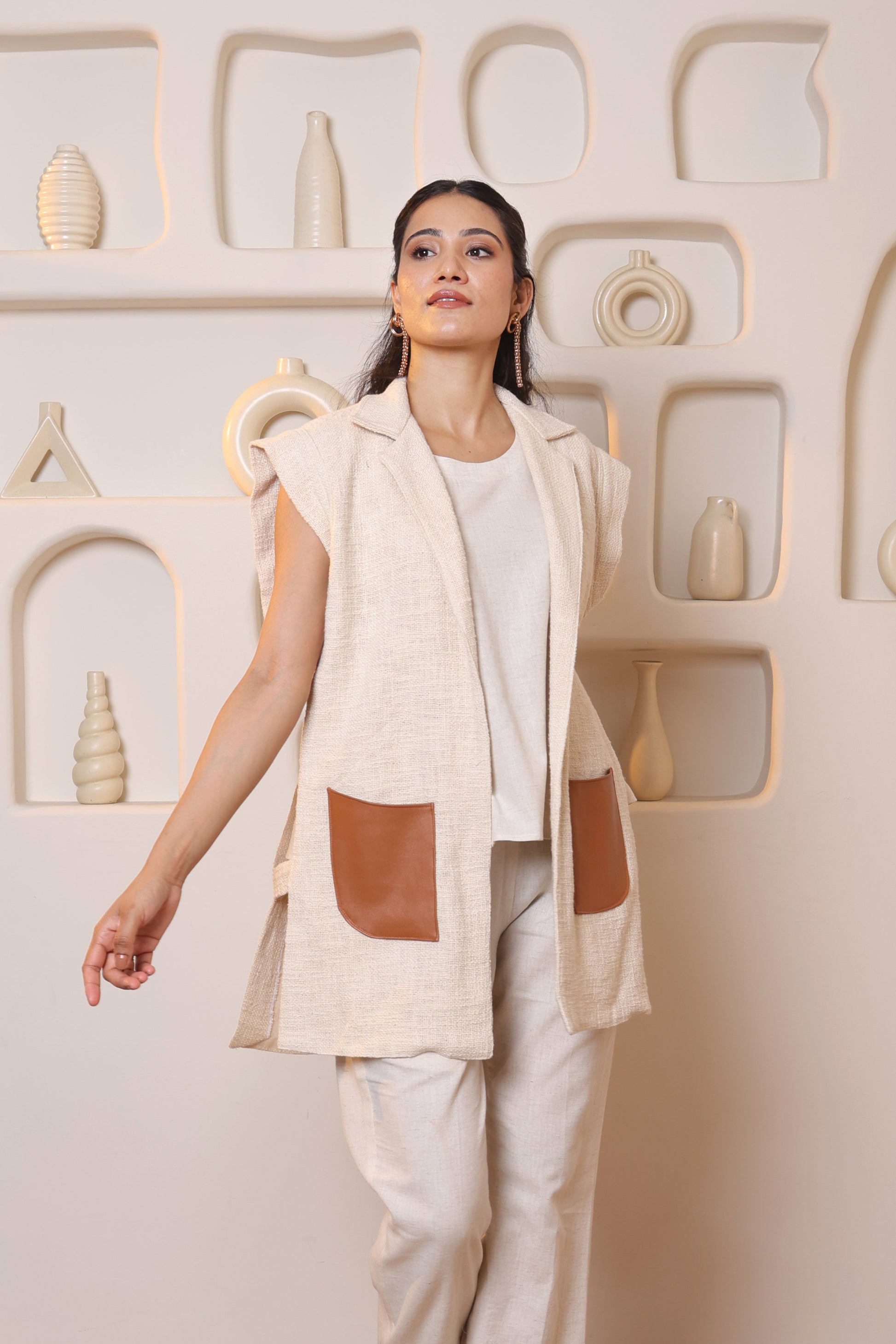 The Beige Leather Pocket Jacket is a perfect blend of sophistication and edgy charm. Designed for versatility, this jacket features a classic beige hue that exudes timeless elegance, while the leather pockets add a bold, contemporary touch.