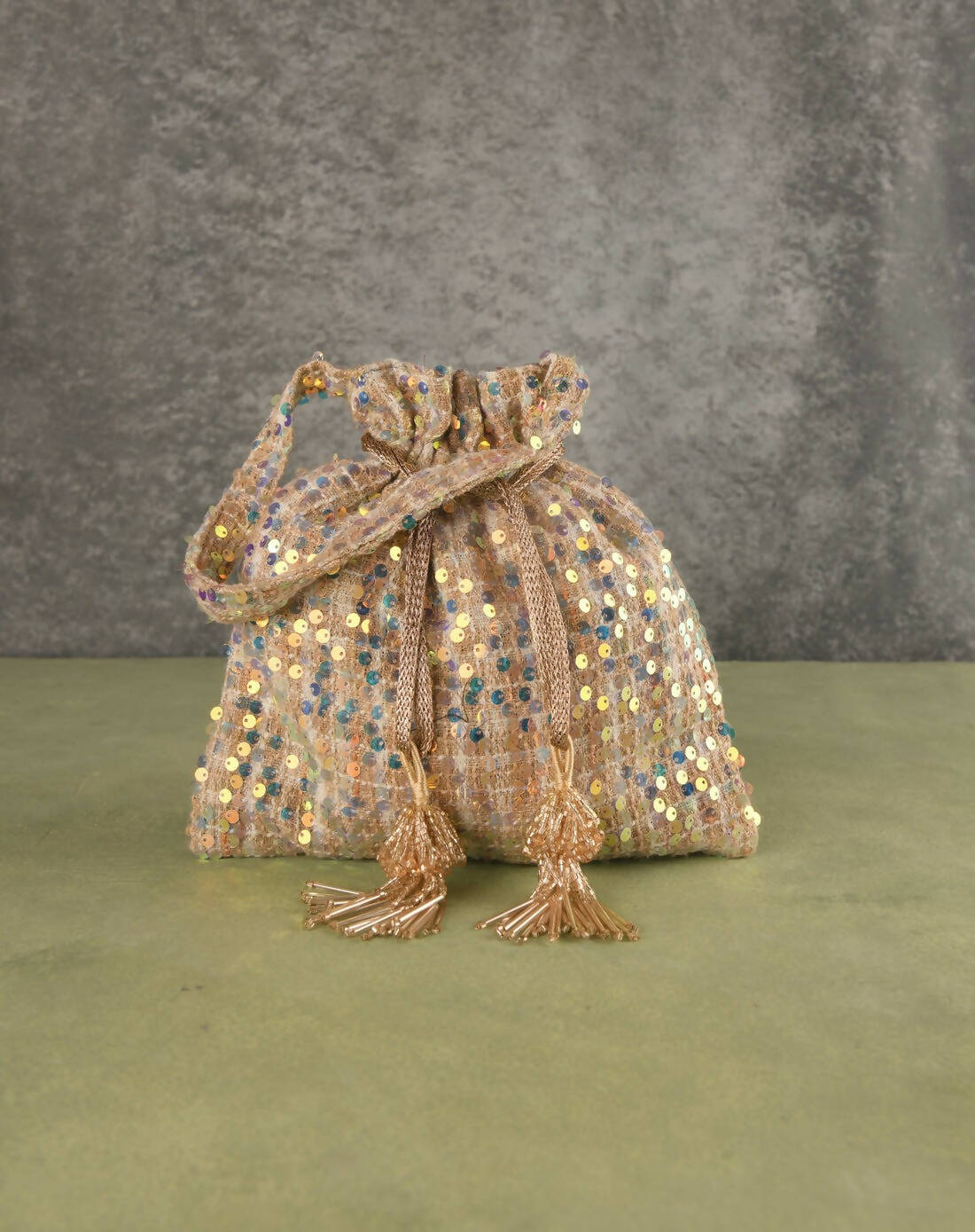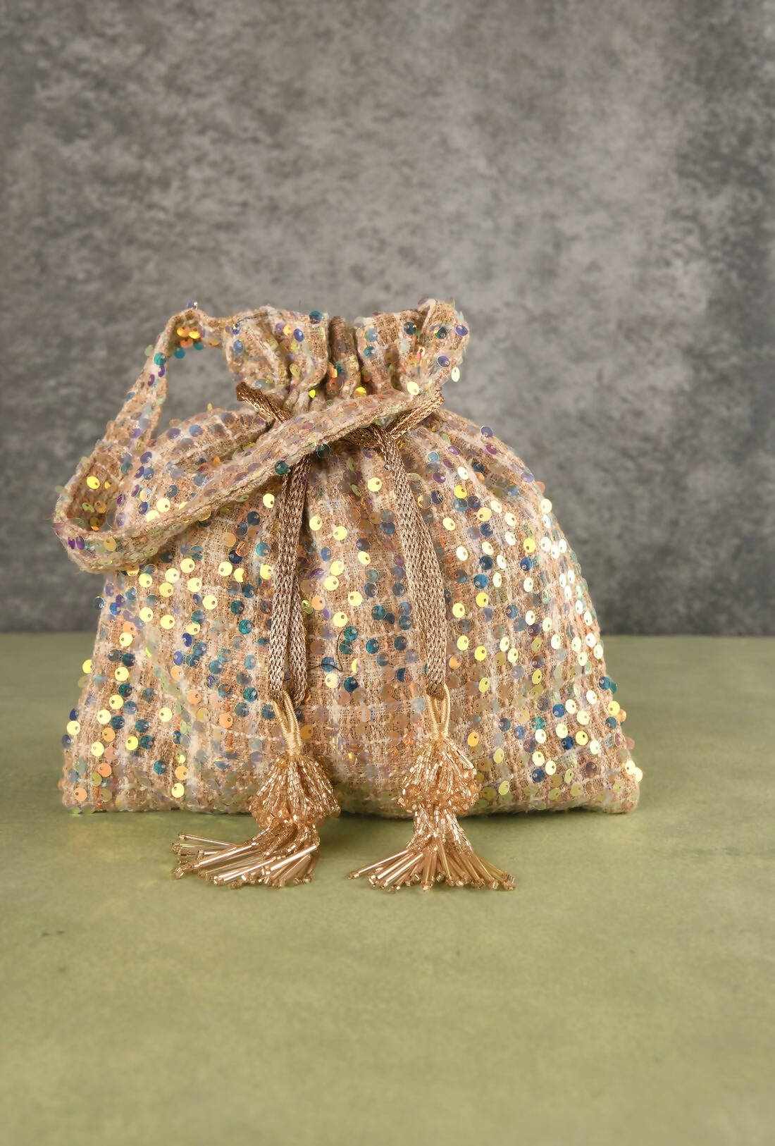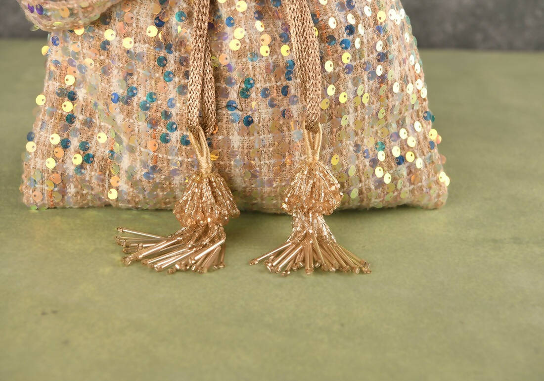 Elevate your festive or wedding attire with our exquisite Potli ethnic bag. Handcrafted, this bag is the perfect accessory to complement your traditional look. Its drawstring closure ensures your essentials are secure while you make a style statement. Made up of Cotton fabric with Sequined work and satin inner lining and handmade tassels.