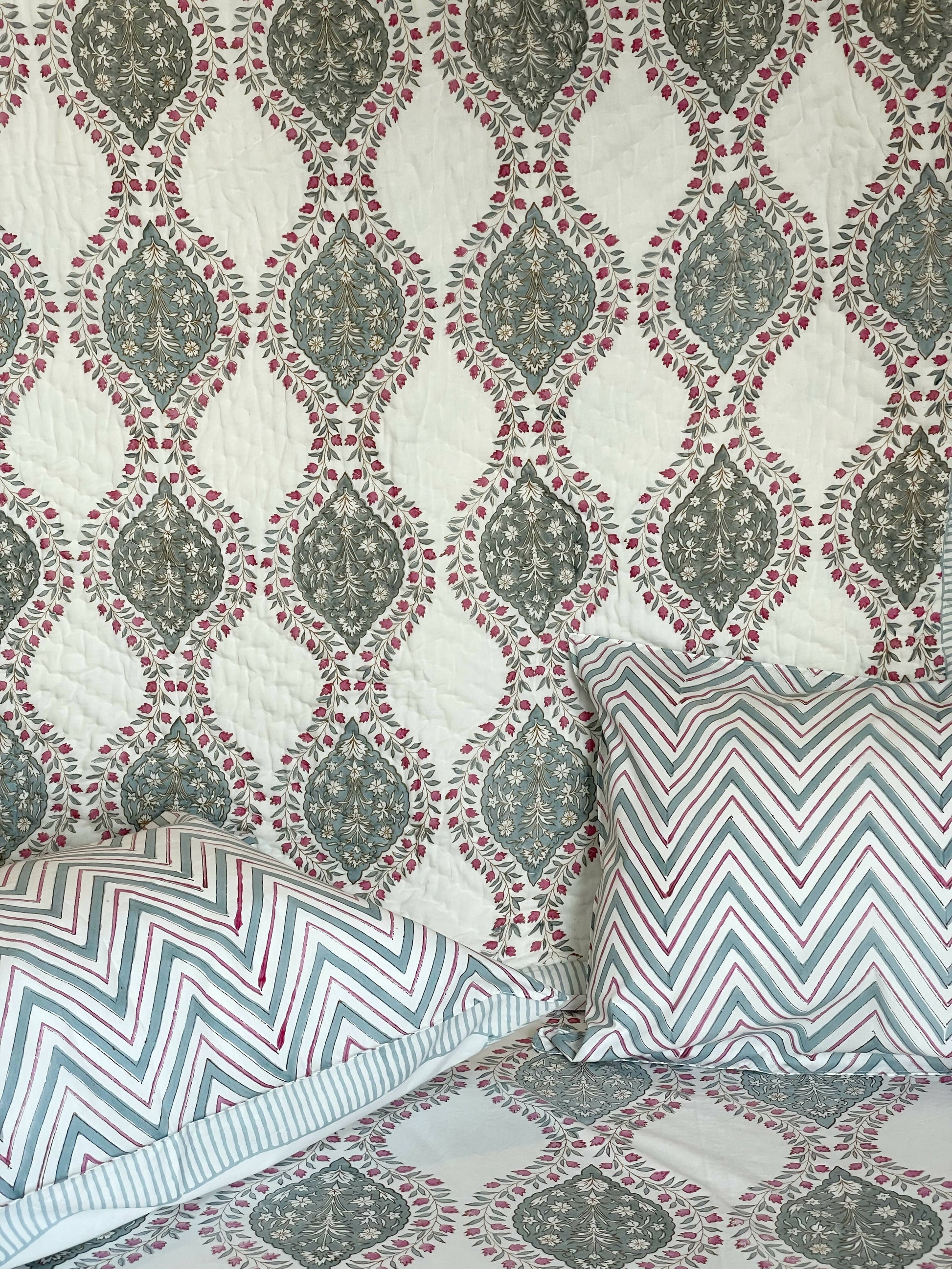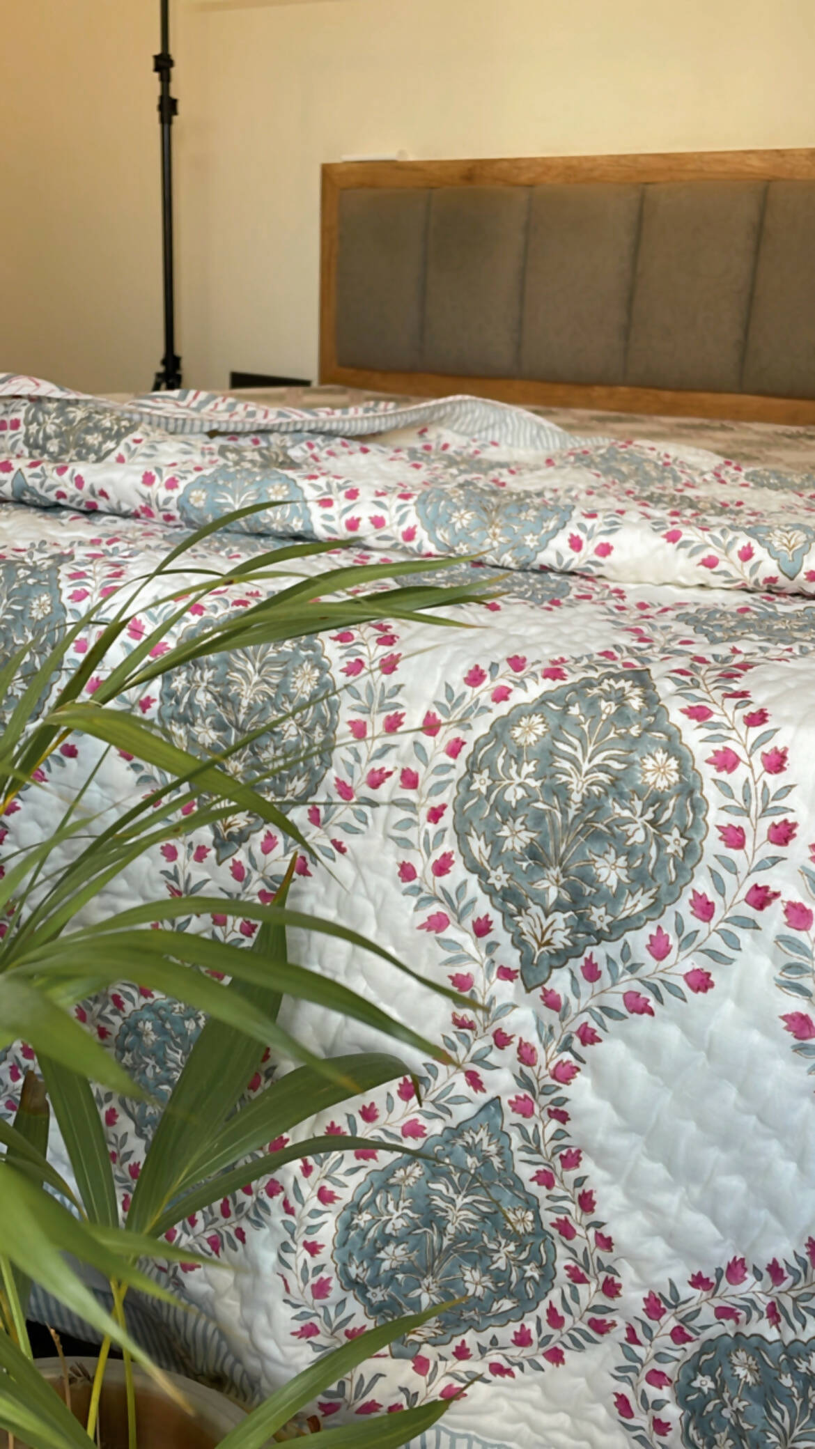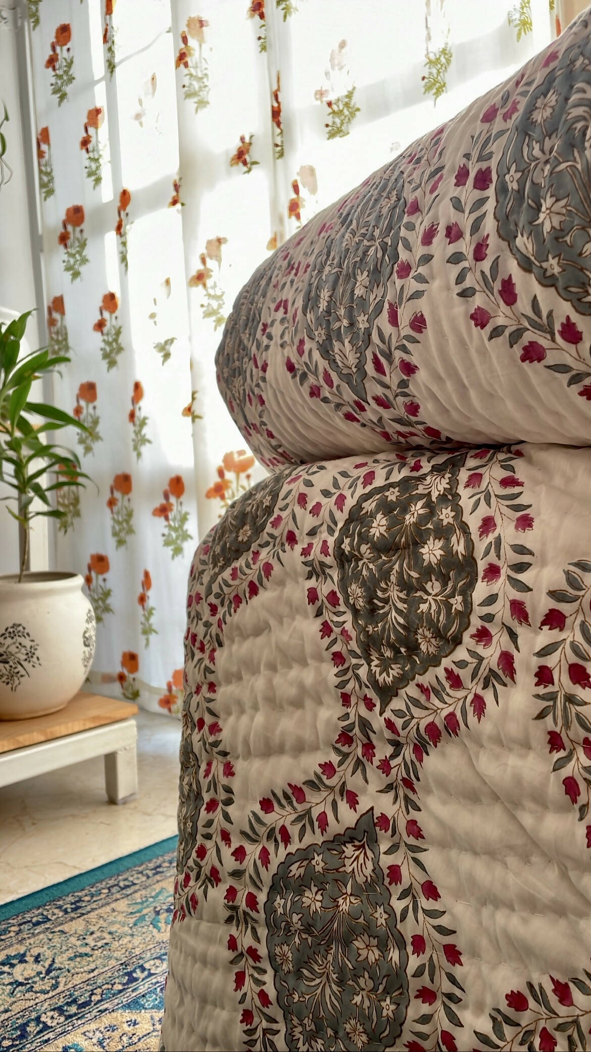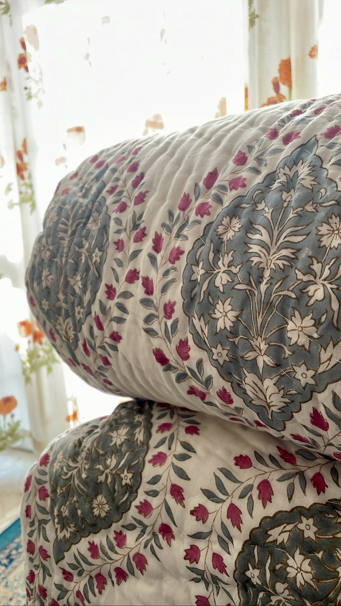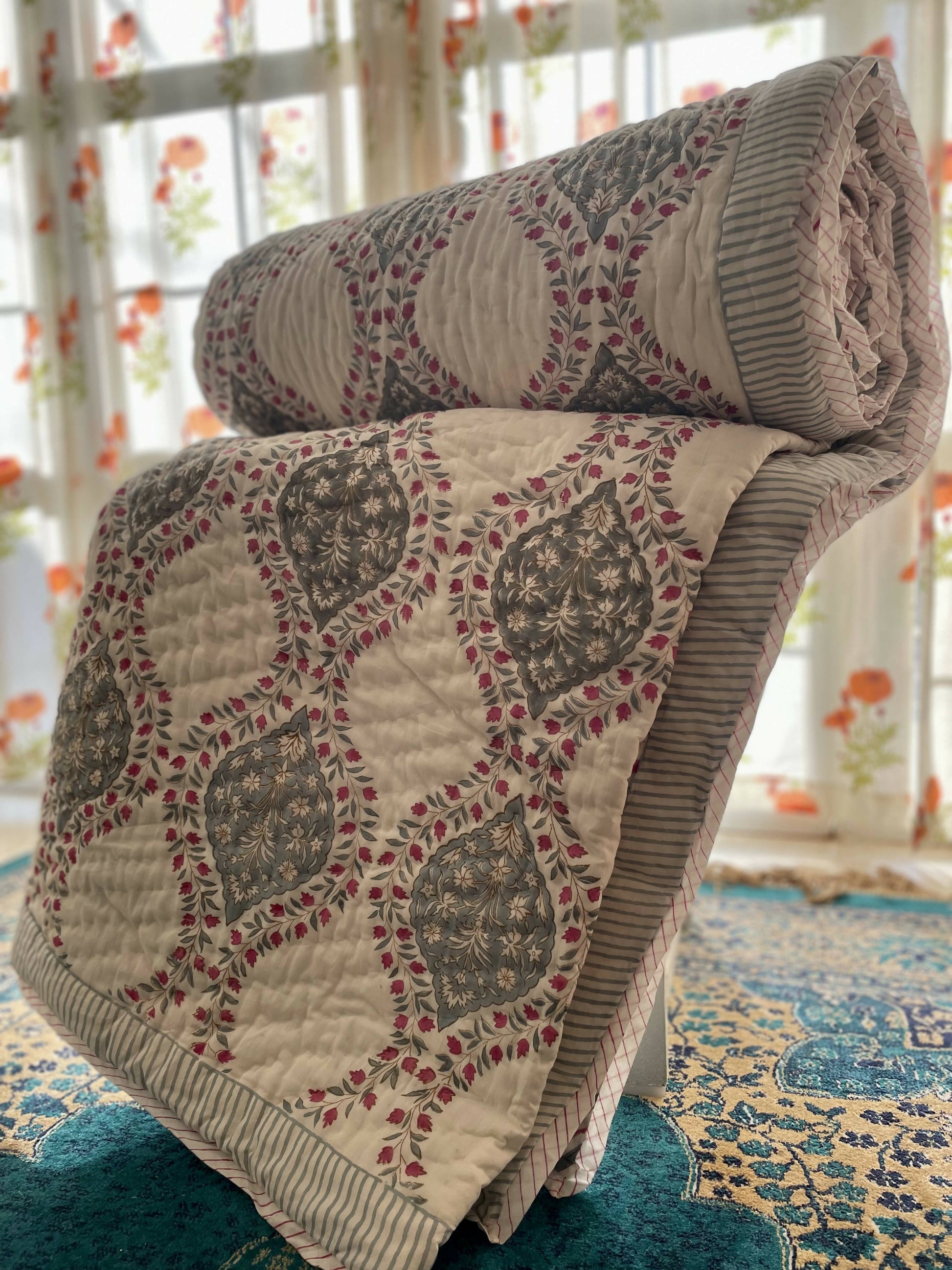 A fine hand quilted Jaipuri razai or quilt. This handmade product can be used as bedcover as well or a A/C comforter. 100% premium cotton sheets used inside out, this is a extremely light yet cozy handmade product. Hand block printed on both sides with different design.