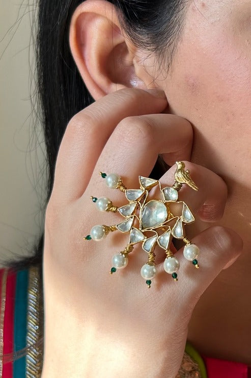The Bird Polki Ring is a striking fusion of elegance and nature-inspired beauty. Featuring a finely crafted bird motif and adorned with intricate Polki work, this ring exudes regal charm. Its unique design makes it perfect for special occasions, adding a touch of sophistication and artistry to any outfit.