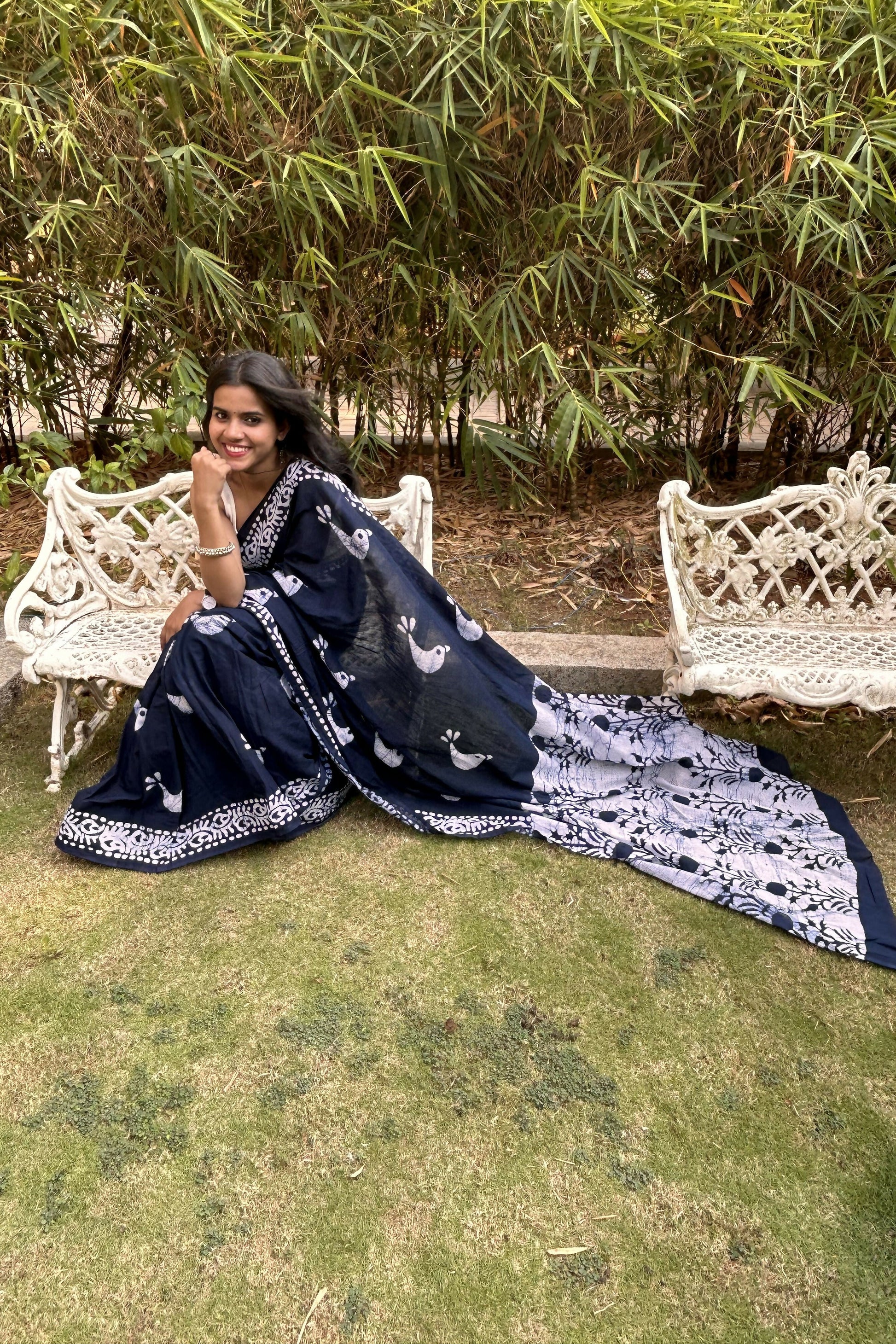 Ready to wear hassle-free handblock printed saree that can be worn within 30 seconds without any help. The saree comes with lining and has a hidden pocket attached to provide functionality and comfort.