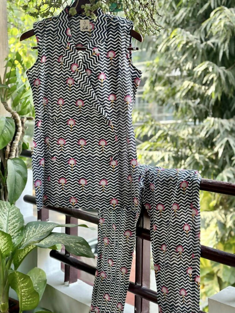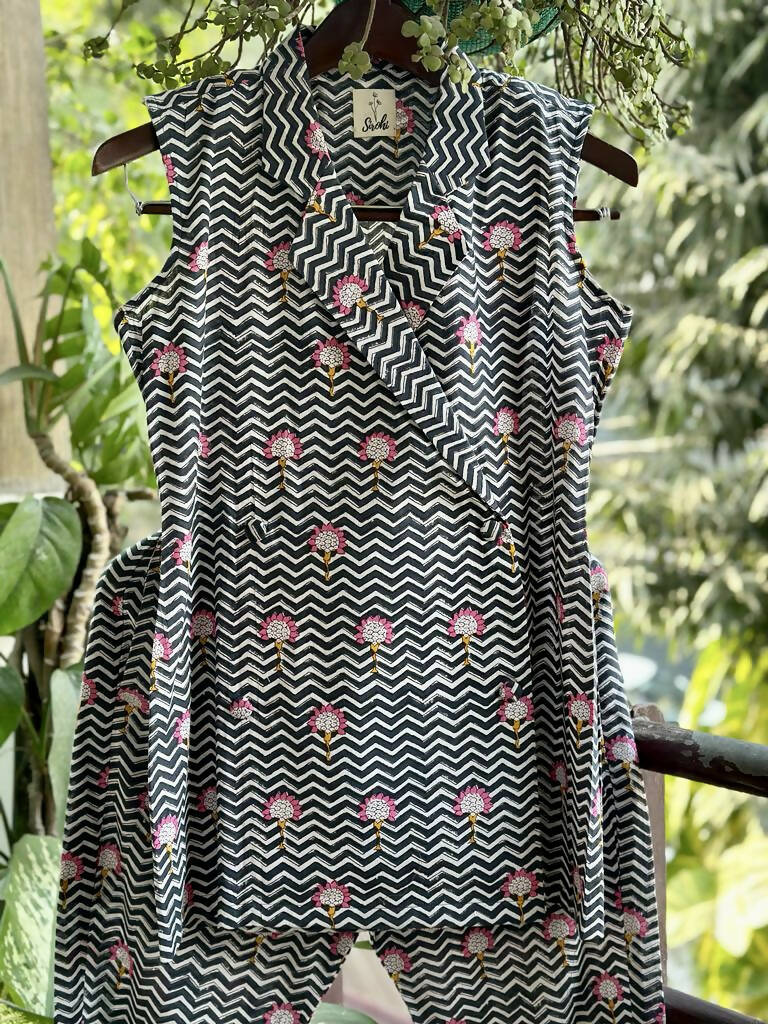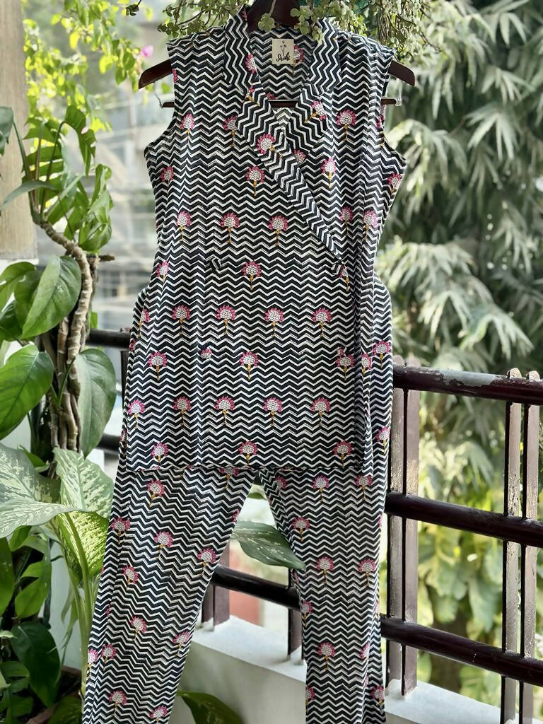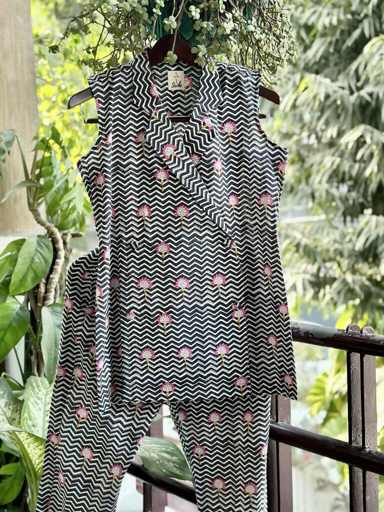 An eclectric Black and WHite Chevron with pink floral motifs Print turned into a Sleeveless Double Breast Long Blazer with Slim Fit Pants Co-ord set, for an classic chic vibe.