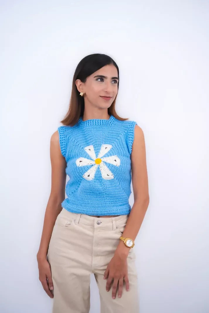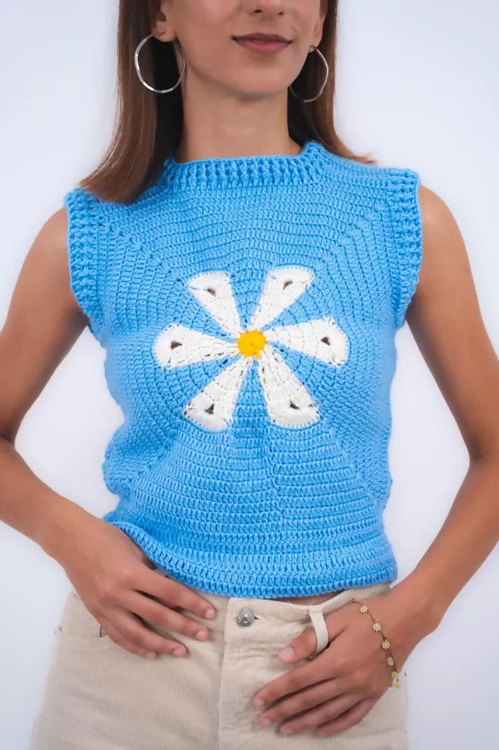 Embrace timeless style with our handcrafted crochet sweater vest. This stunning piece features a vibrant blue hue and intricate detailing that adds a touch of elegance. The focal point is a beautifully crocheted flower, adding a feminine charm to the design.