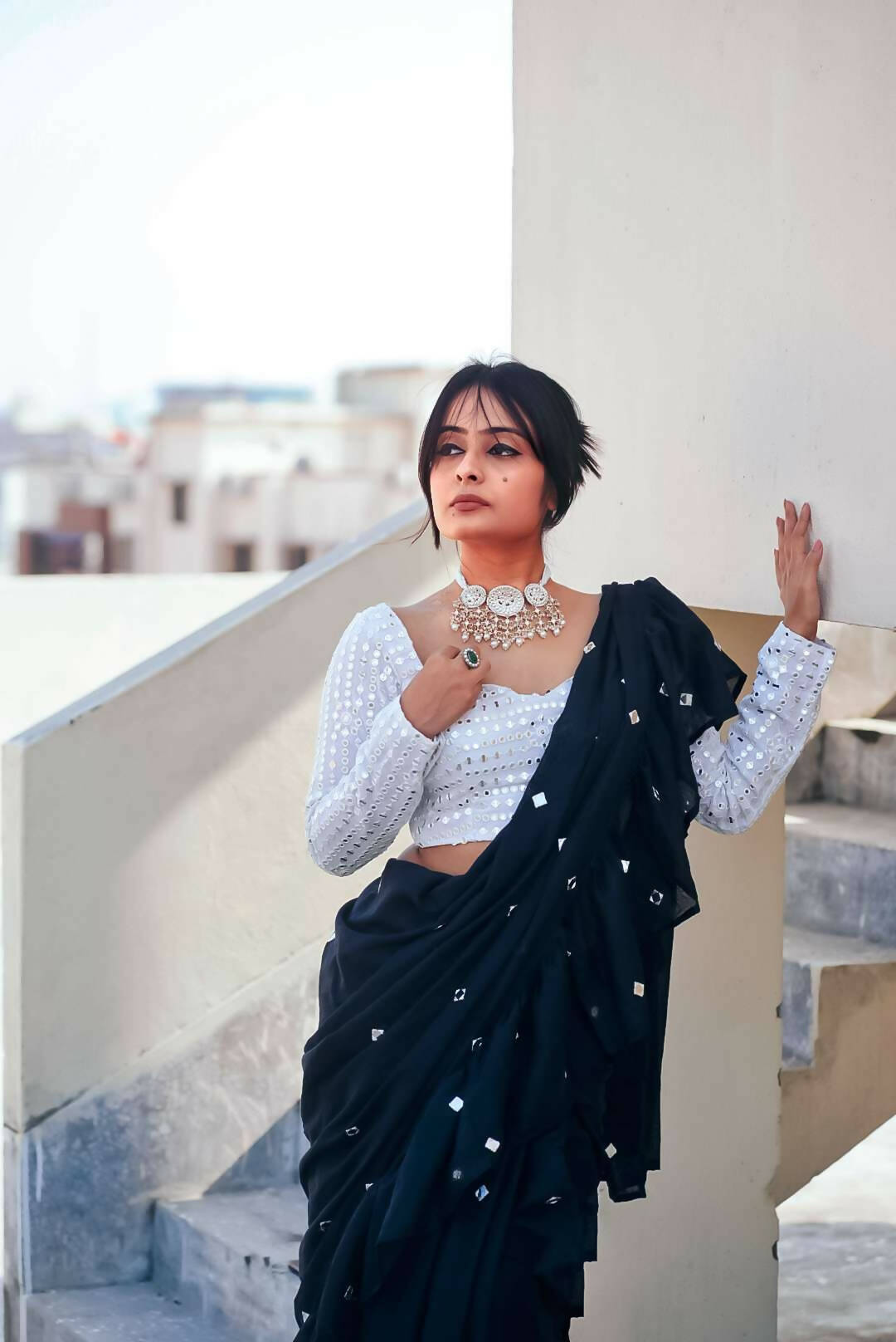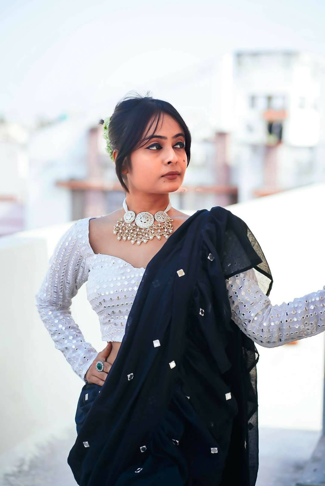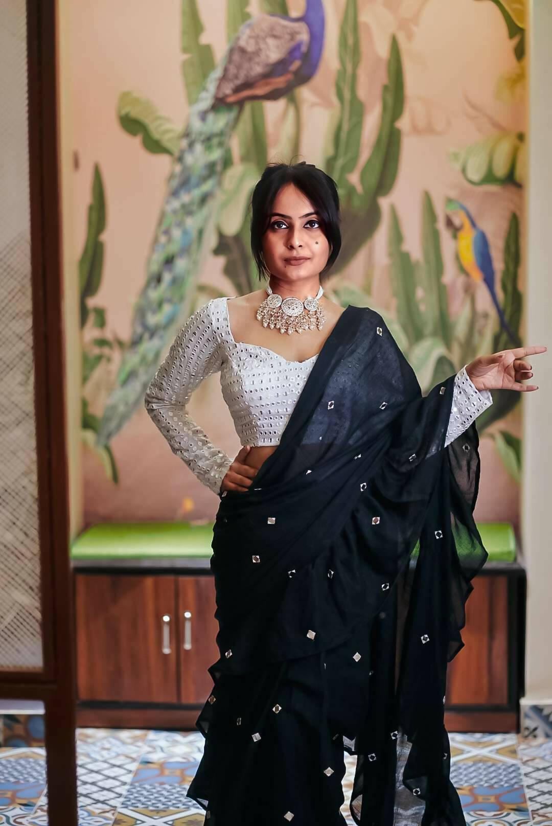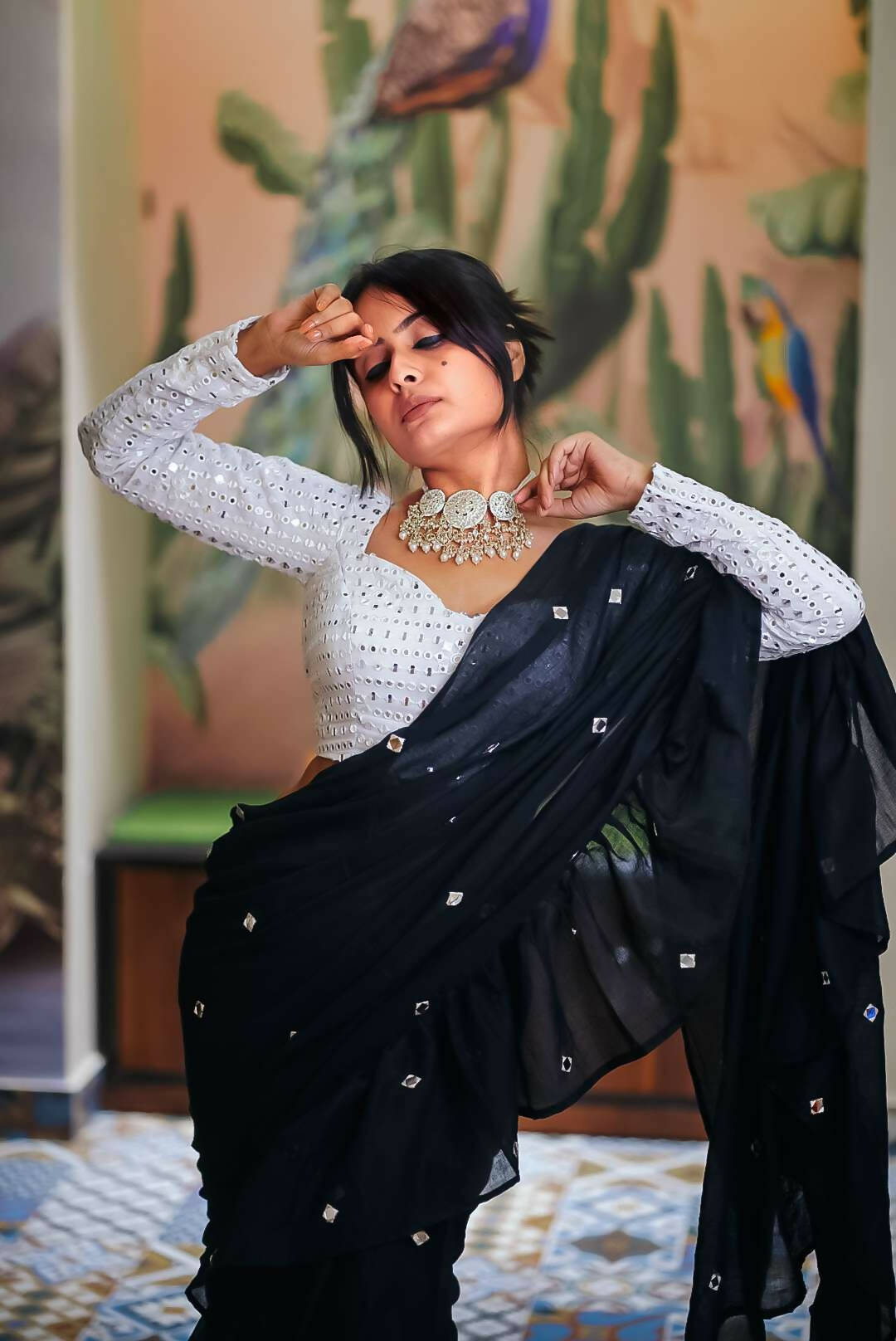 Elegantly designed to complement any saree, this blouse is a timeless fusion of tradition and style. And a perfect piece to add a statement to your attire! Pair it with a monotone saree or go all over by pairing it with a contrast saree. This one will surely will be a statement piece in your wardrobe.