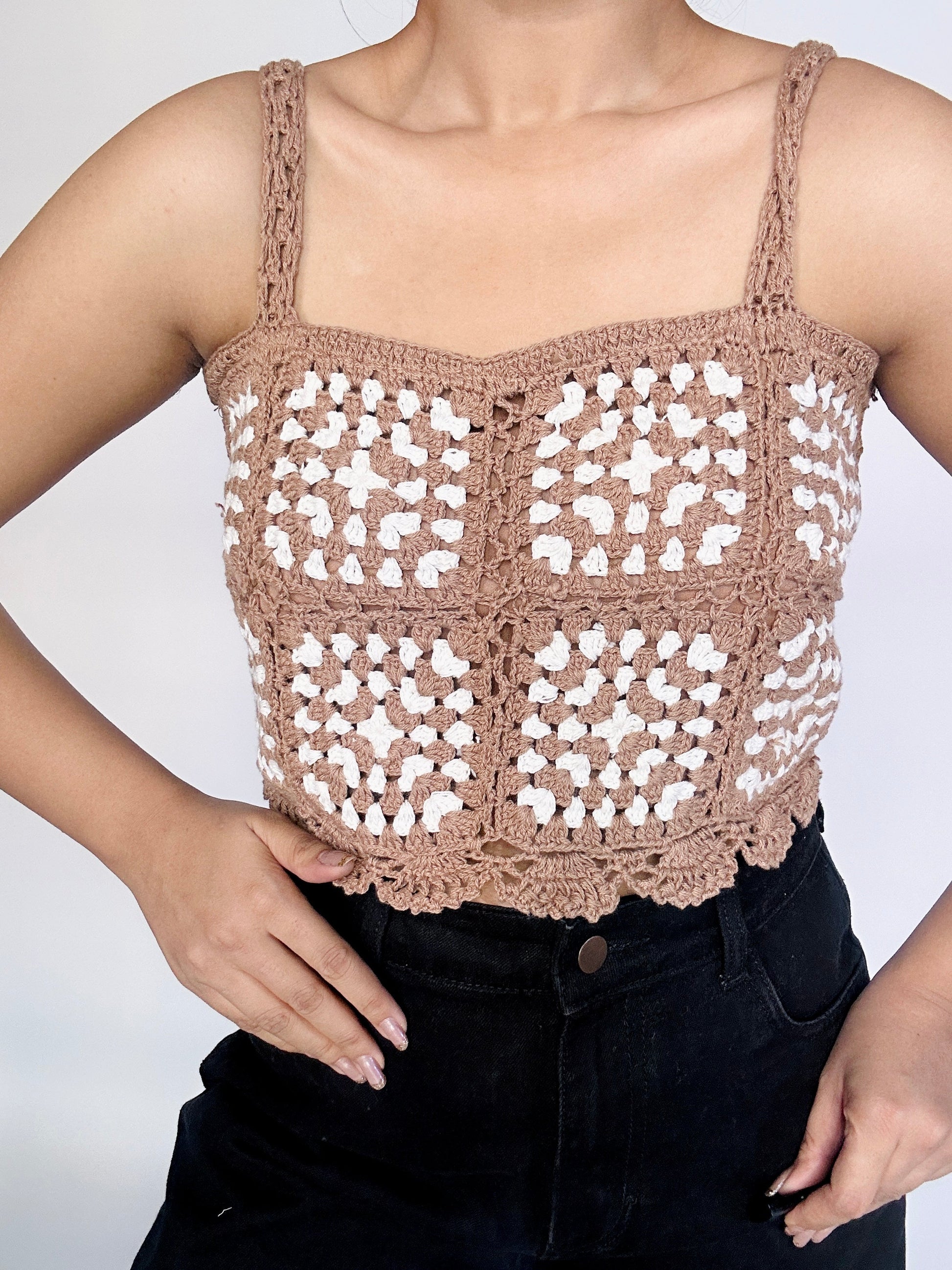 Update your wardrobe with this stylish, handmade Beige square crochet top from the sugercandy collection. Perfect for any casual or dressy occasion, this top adds a touch of elegance and uniqueness to any outfit. Crafted with care, it showcases the beauty of crochet and provides a comfortable yet fashionable look.