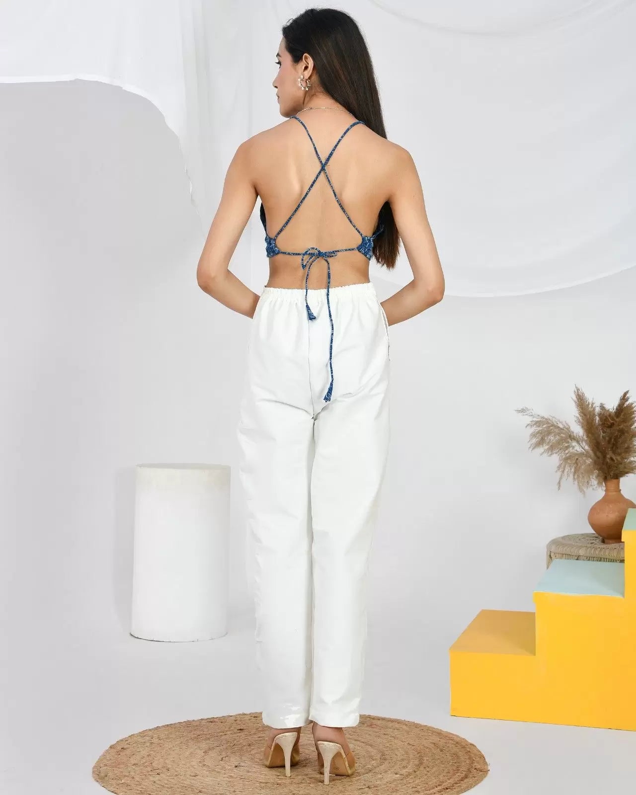 The Berry Blue Cotton Kantha Bralette offers a flattering fit while embracing the timeless artistry of Kantha work fabric, making it a versatile addition to any wardrobe—ideal for both casual and dressy occasions. The rich berry blue tone enhances its elegance, making it a perfect blend of tradition and modern style.