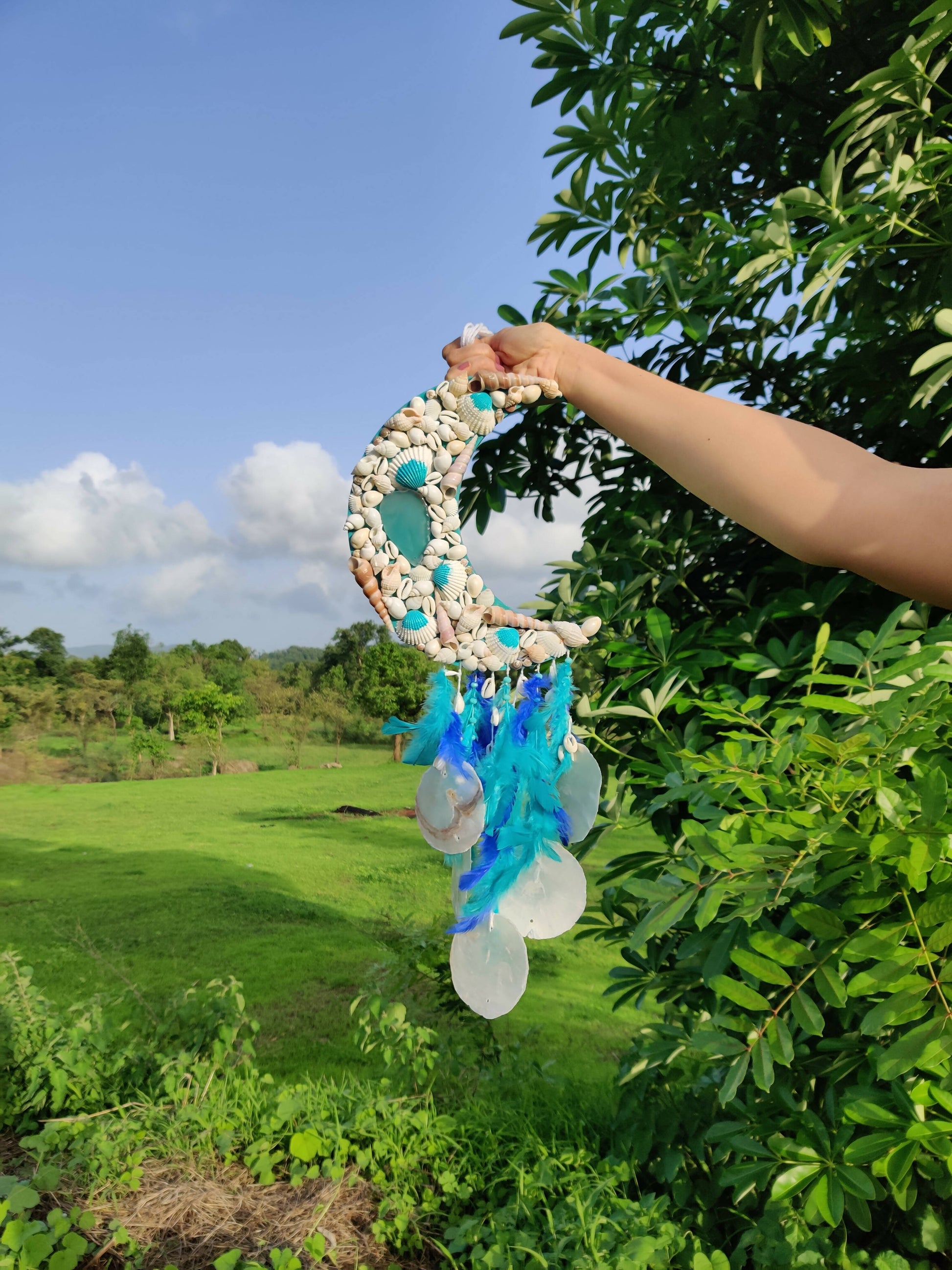 Our Moon Dreamcatcher comes with beautiful sea shells and a calming sound that will instantly lift up your space. Handcrafted by women artisans in Bombay.