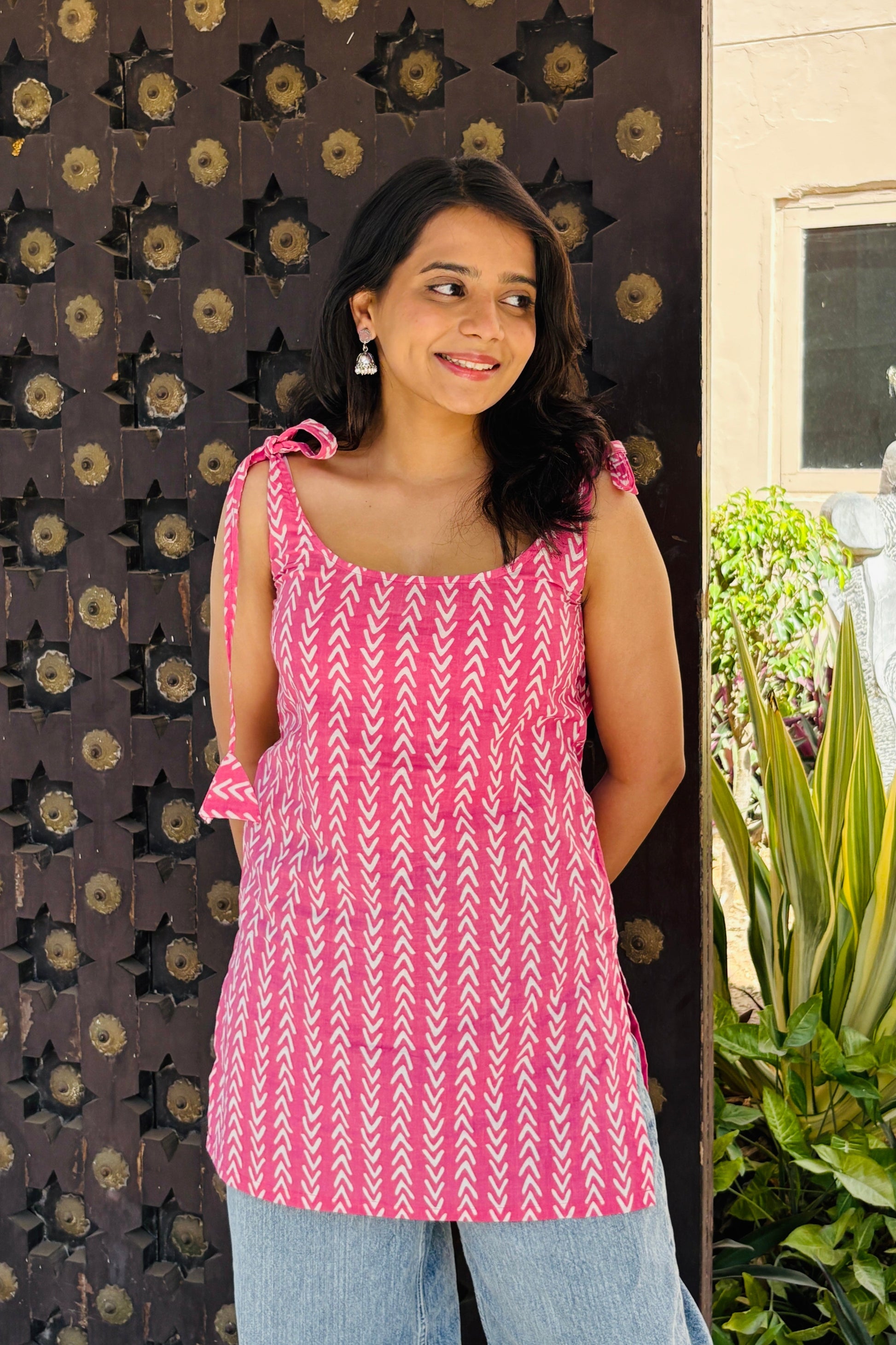 A blend of elegance and ease, this tie-strap kurta in blush pink is crafted from soft cotton with delicate white arrow prints. The adjustable shoulder ties add a playful touch, making it a versatile pick for casual outings. Pair it with denim or breezy palazzos for an effortlessly stylish look.
