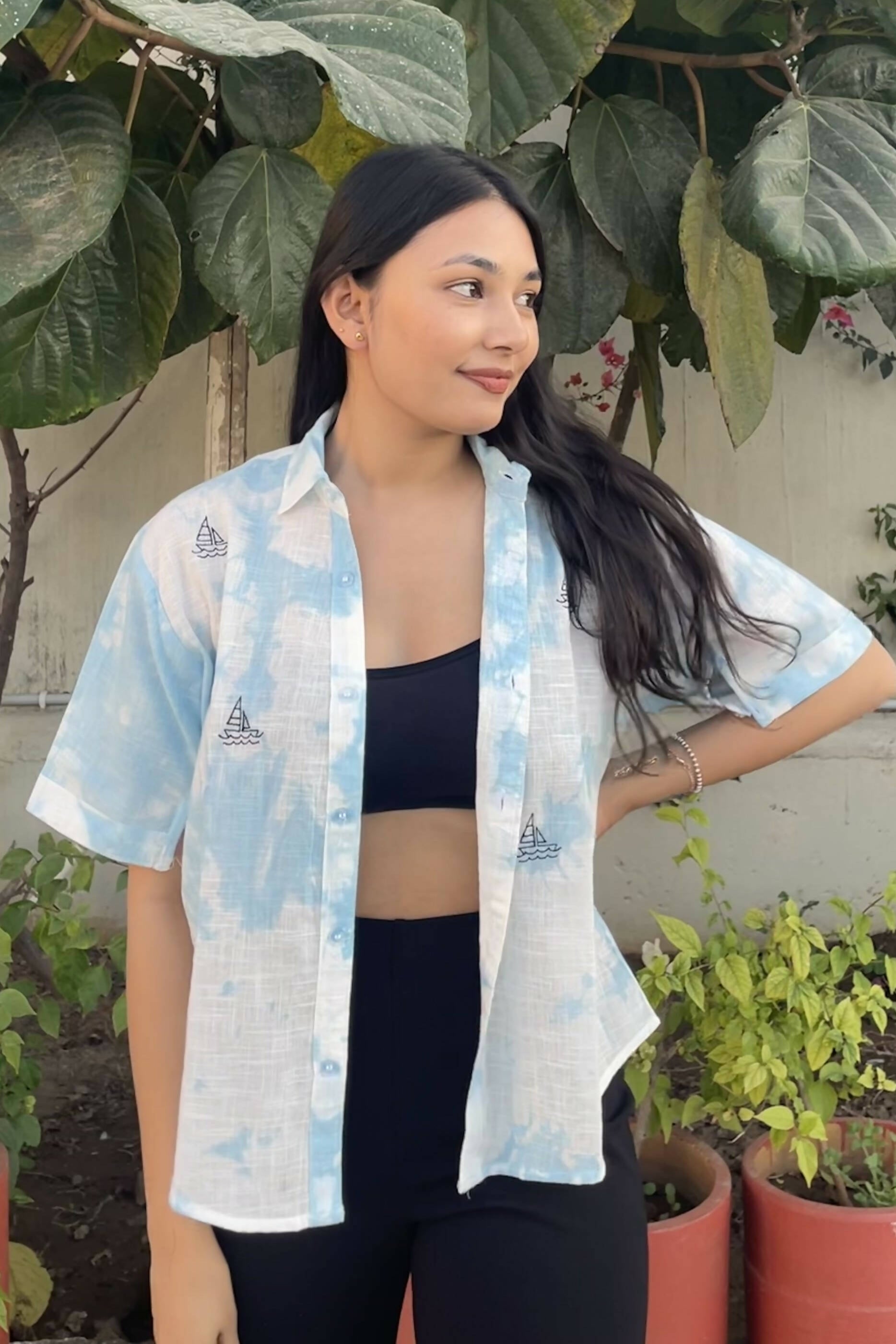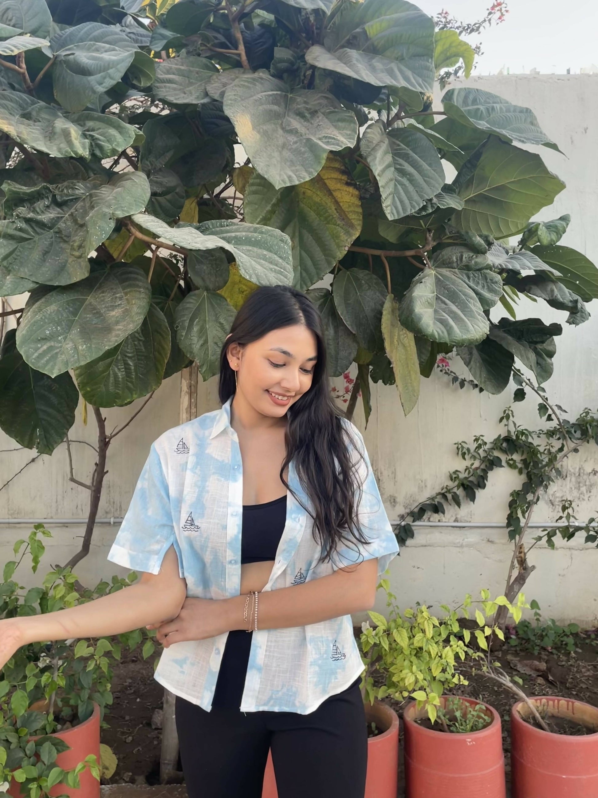 Shirt made of slub cotton. Slot collar and short sleeves. Contrast embroidery detail. Button-up front.