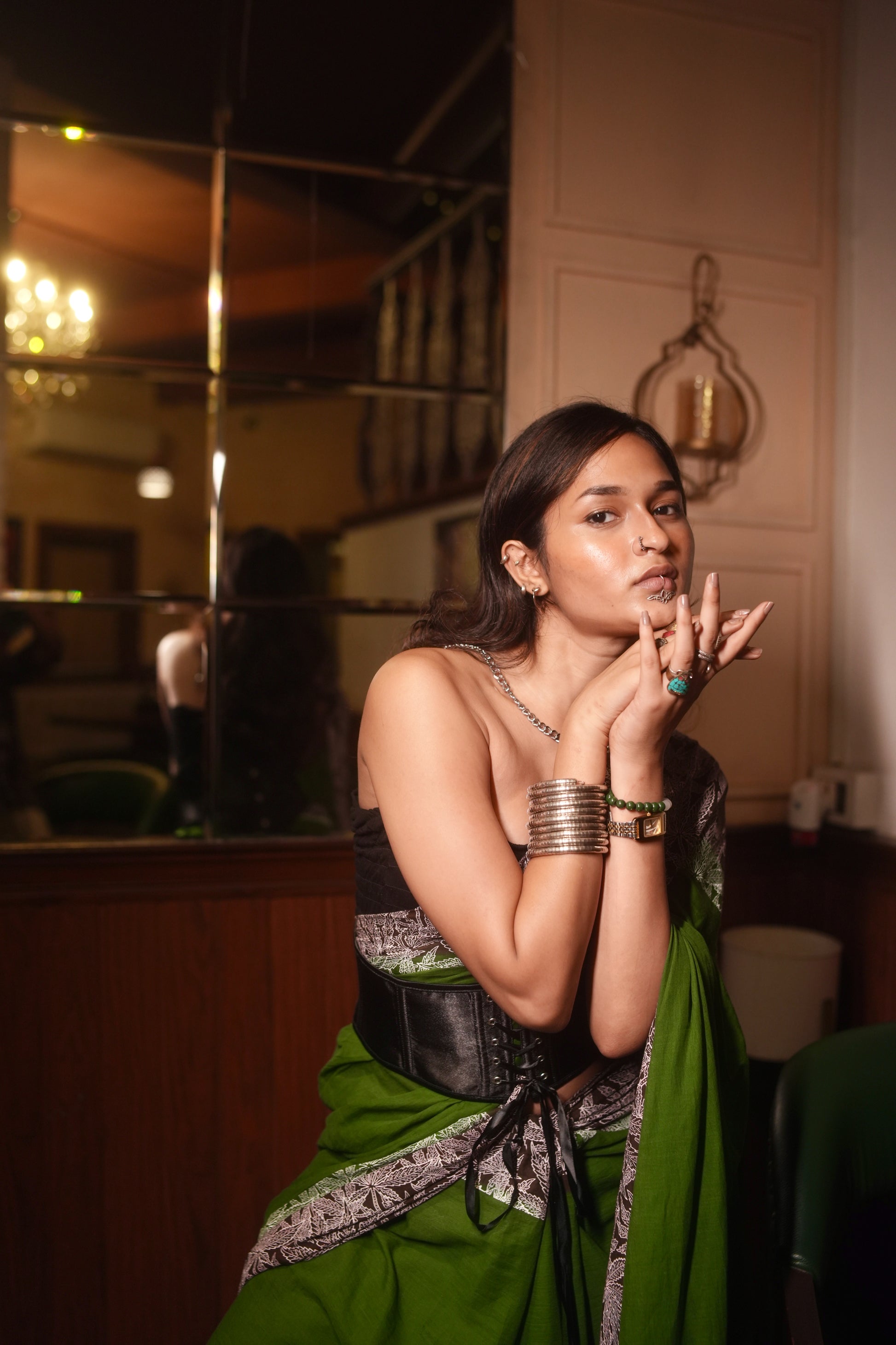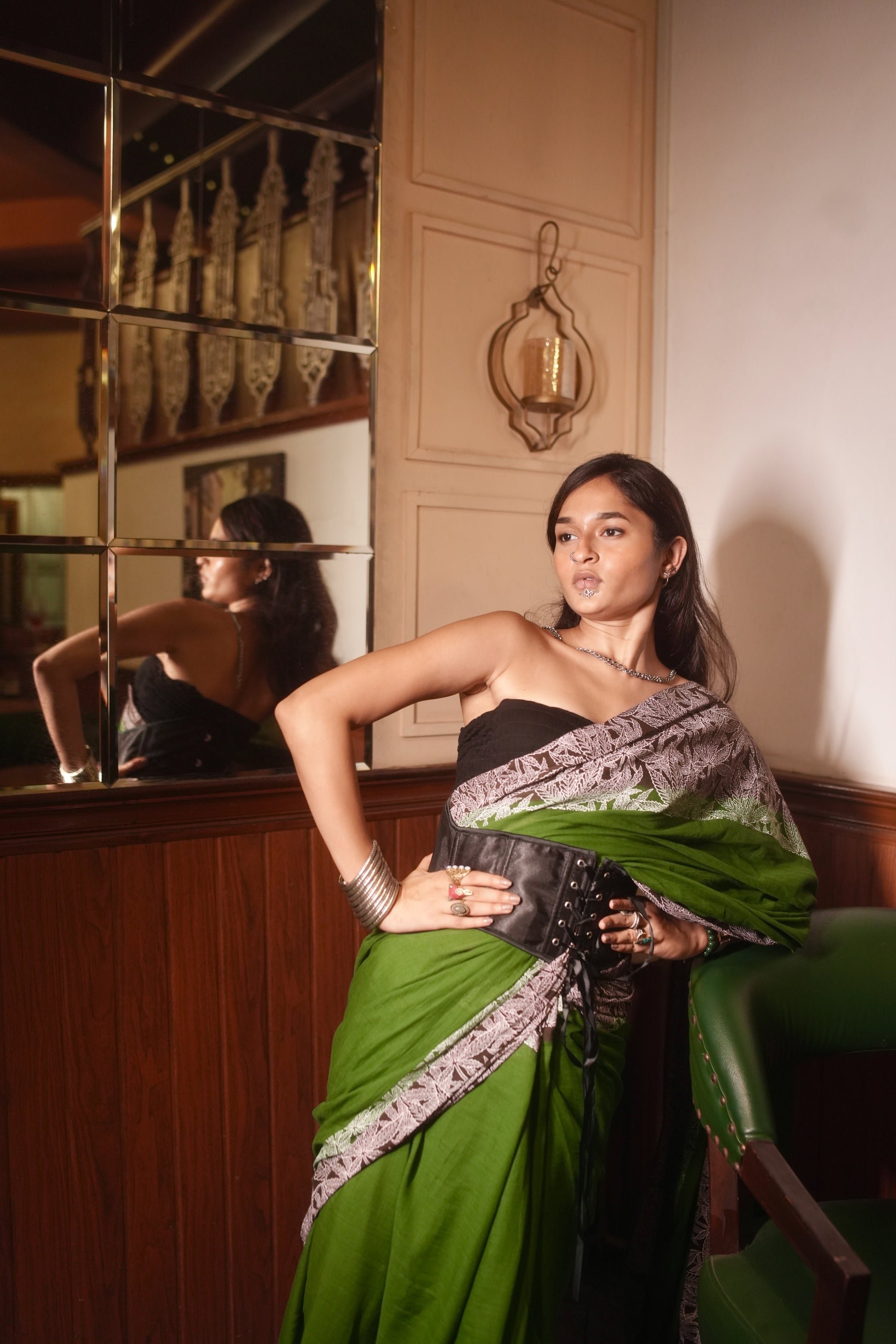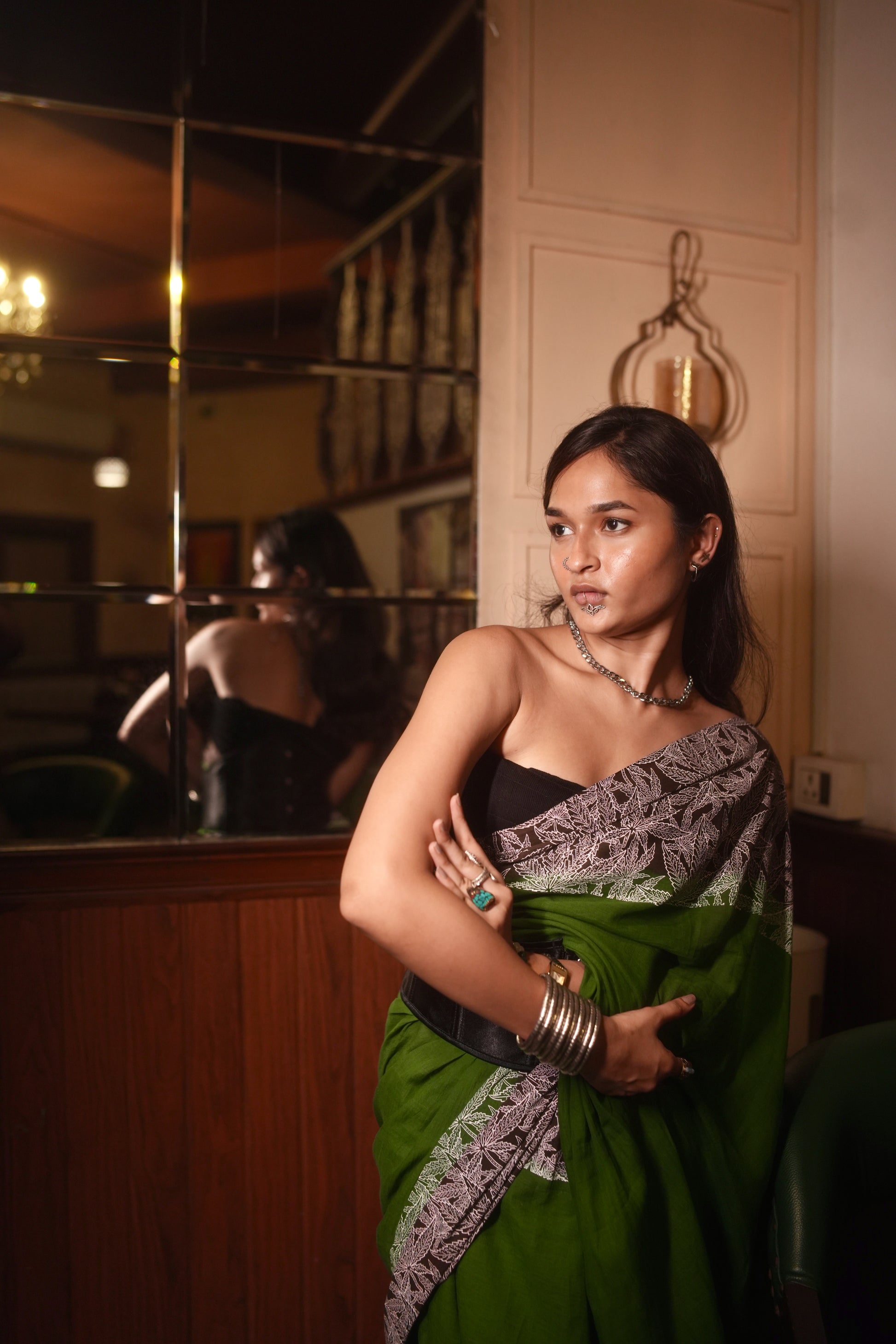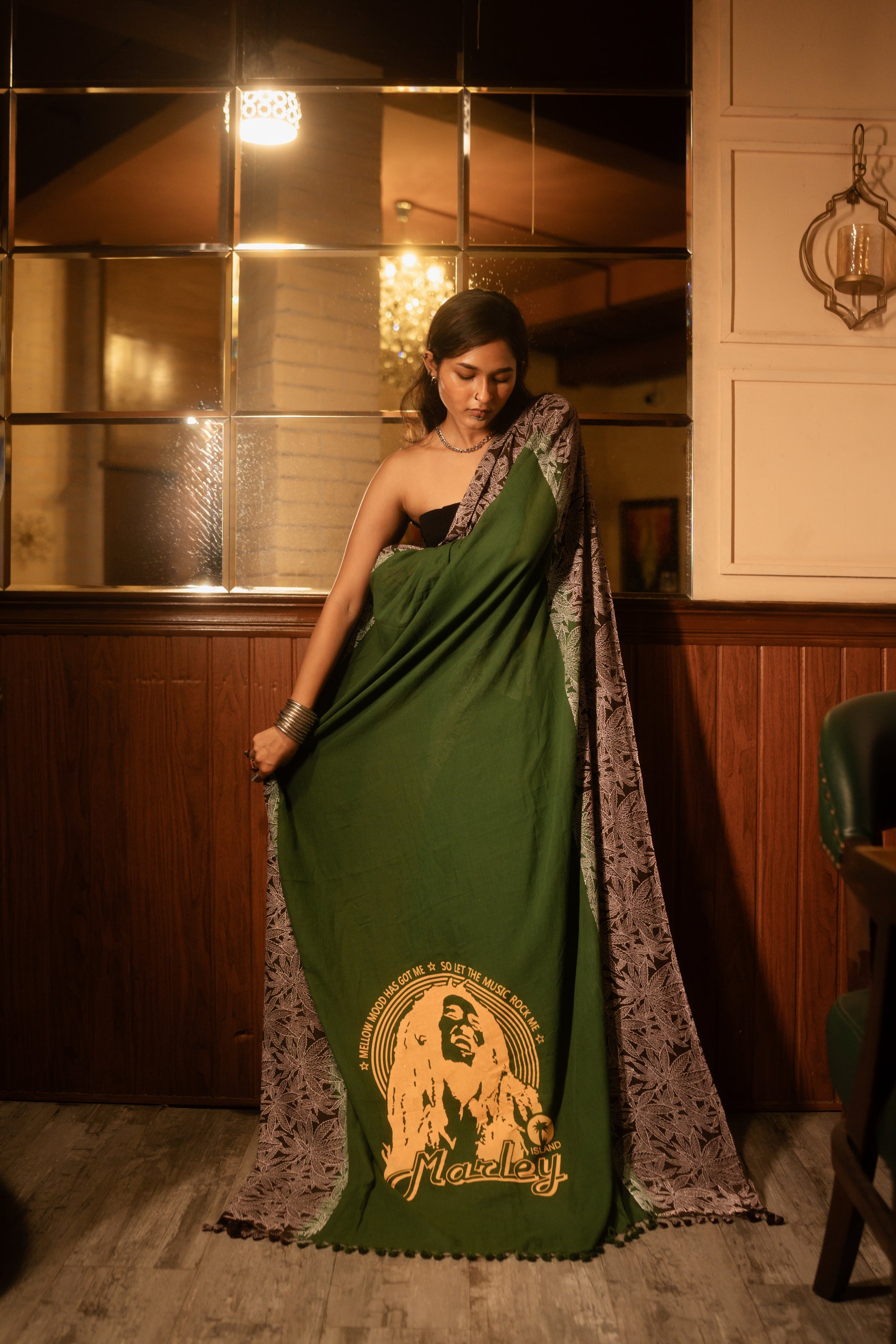 Bob Marley elevated reggae to a global phenomenon, with timeless hits like "I Shot the Sheriff" and "One Love" that still resonate today. Embrace his iconic spirit with this exquisite green saree featuring a distinctive, modern print. Perfect for sophisticated evenings, this saree pairs elegantly with statement jewelry for a refined, stylish look.