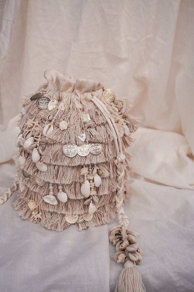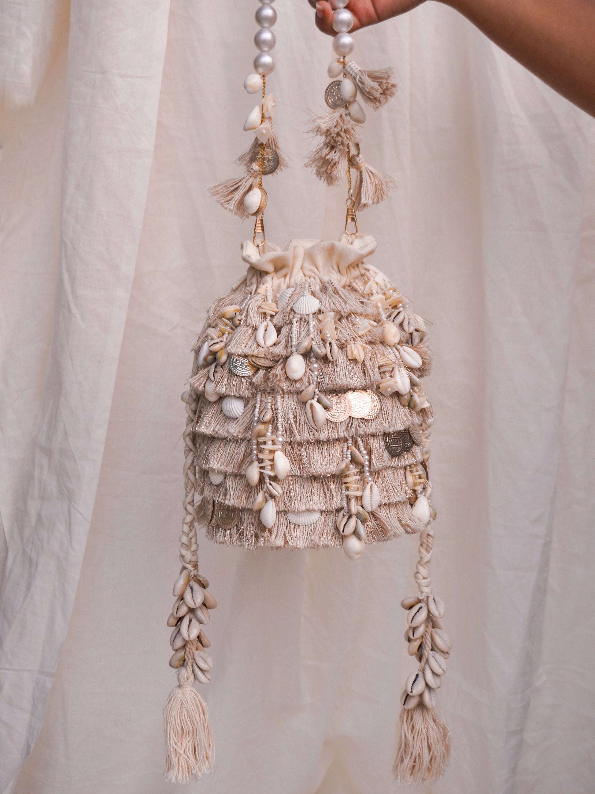 Our all new addition 'BOHEMIAN RHAPSODY' as the name suggests the Bohemian Fantasy or the free spirit, it is the perfect bag to add the boho touch to any of your outfits. Handcrafted with a mix of ingredients like sea shells, pearls, coin charms, on a textured thread tassel lace. The handle has been completed with the same elements used in the bag. It's quintessential for an unconventional lifestyle.