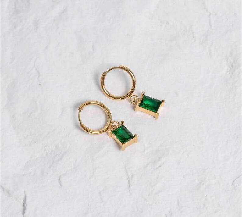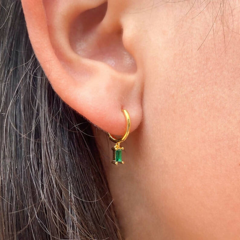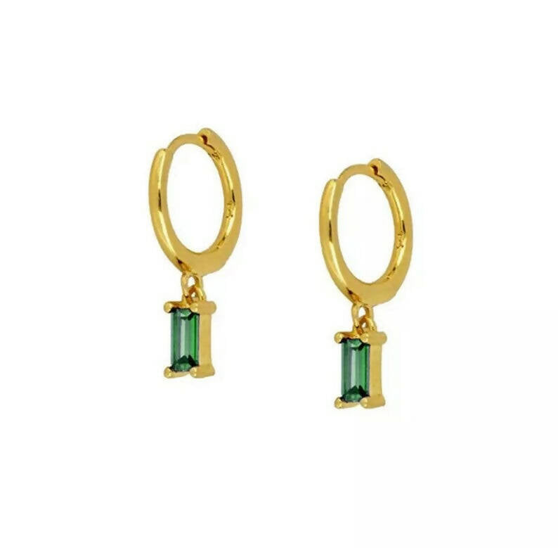 Beautiful dainty and minimalist gold hoops with green cz baguette.