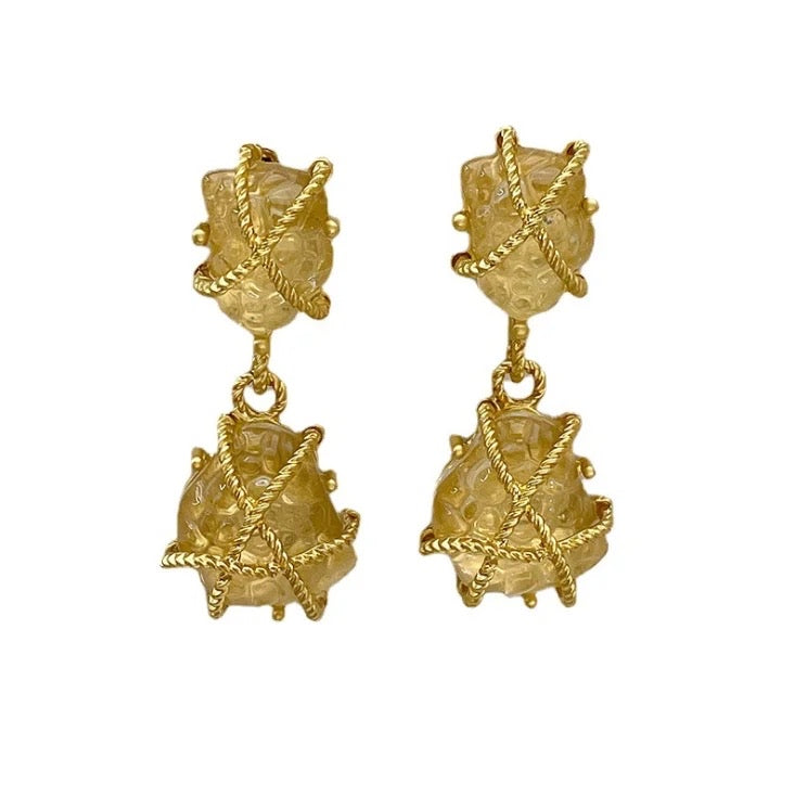 Transport yourself to a bygone era with our vintage medieval court inspired earrings. These exquisite treasures, crafted from 18K gold-plated copper, showcase transparent druzy stones with a captivating jelly-like appearance. Elevate your style with the allure of the past, re-imagined for the modern connoisseur.