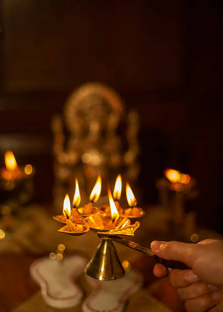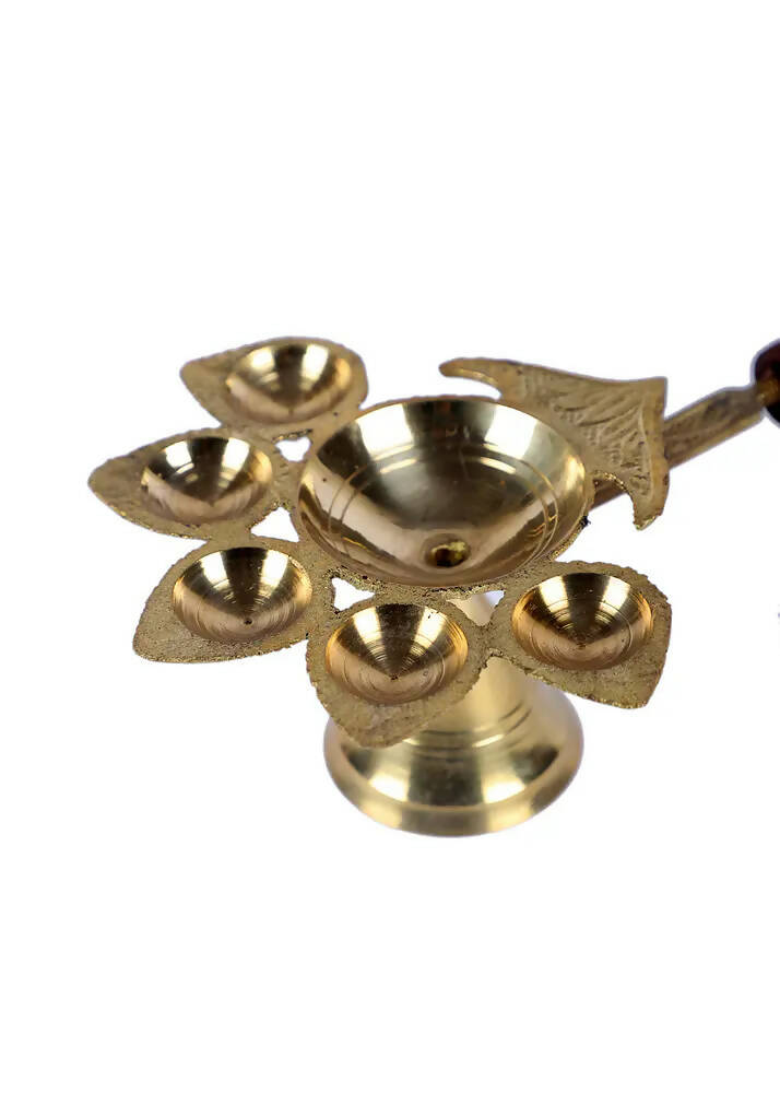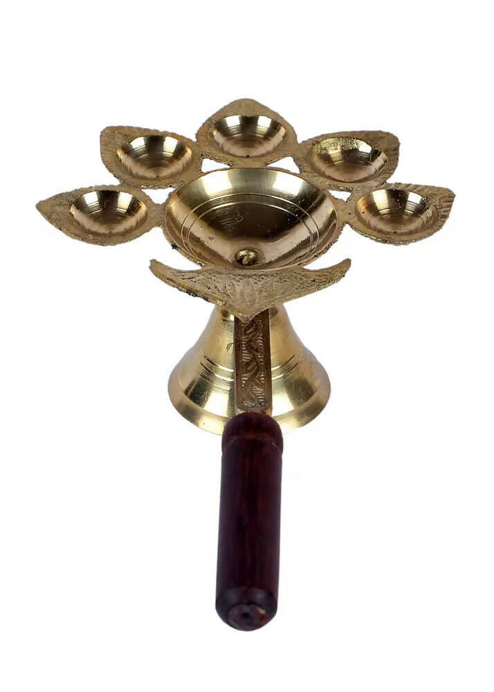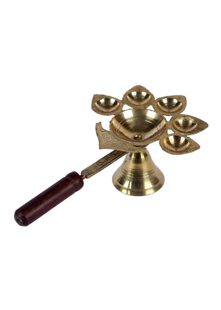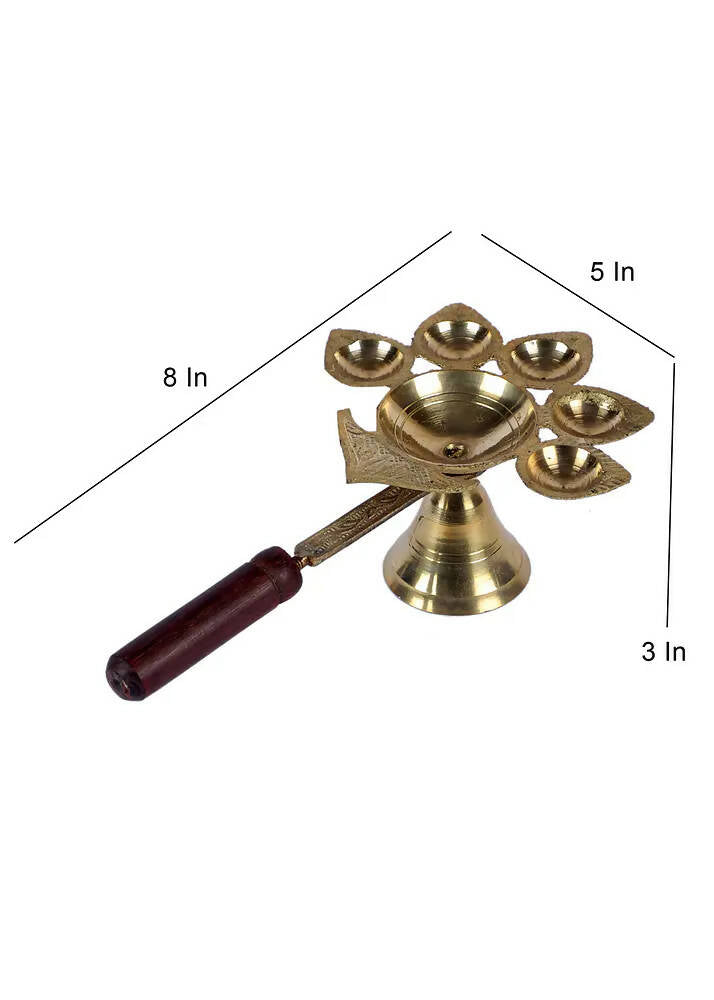 Brass Panch Aarti with Wooden Handle