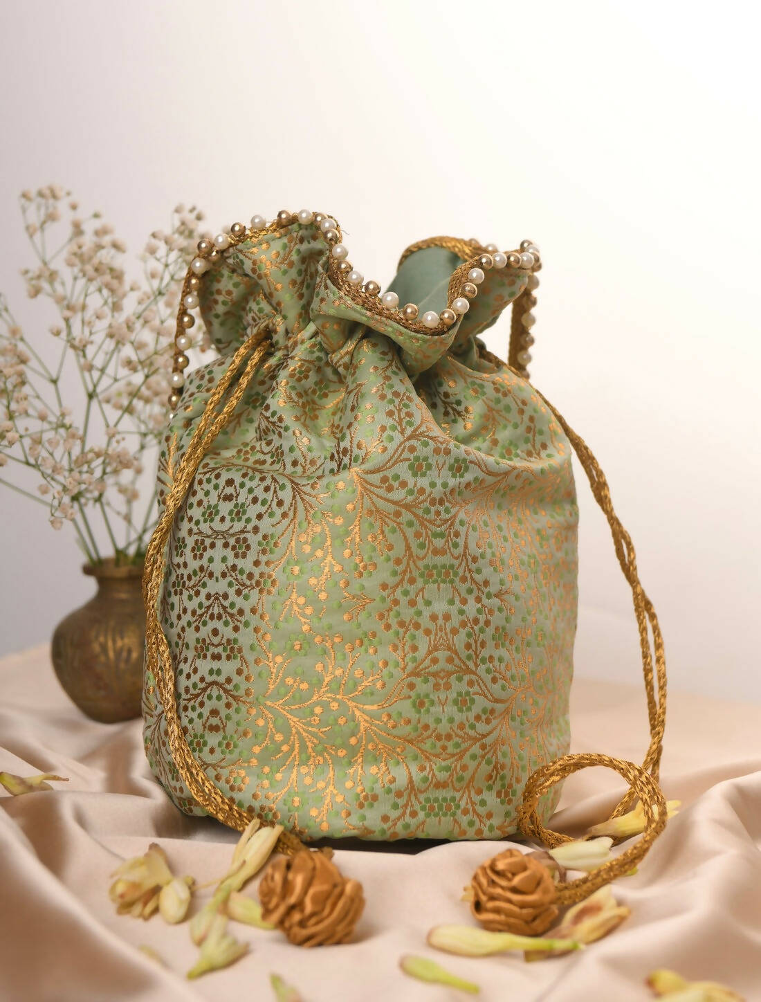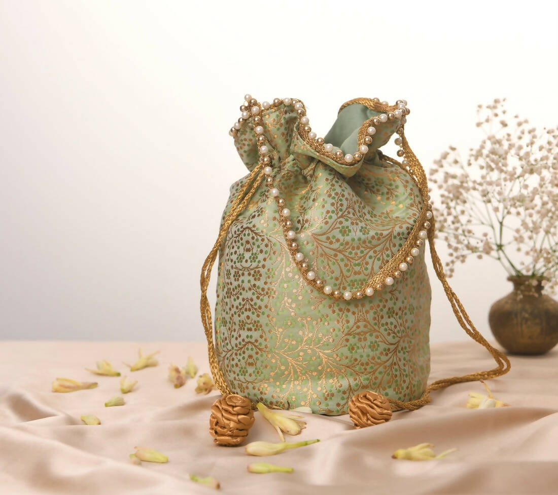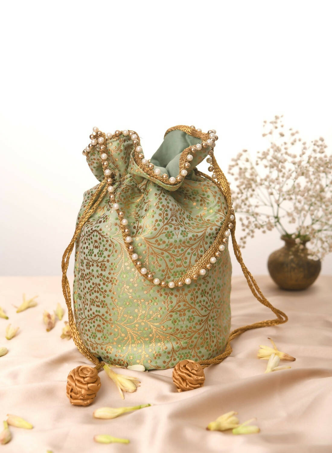 Elevate your festive or wedding attire with our exquisite Potli ethnic bag. Handcrafted, this bag is the perfect accessory to complement your traditional look. Hand made gold satin tassels with beaded handle, pista green and gold brocade fabric.