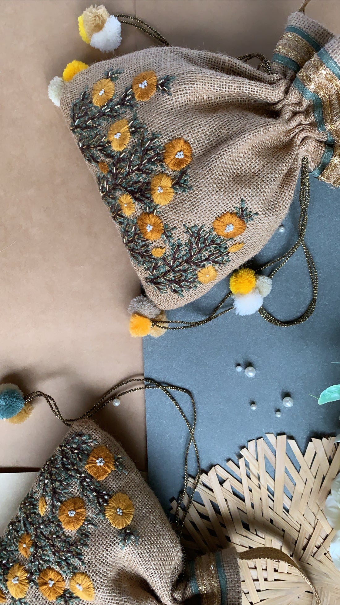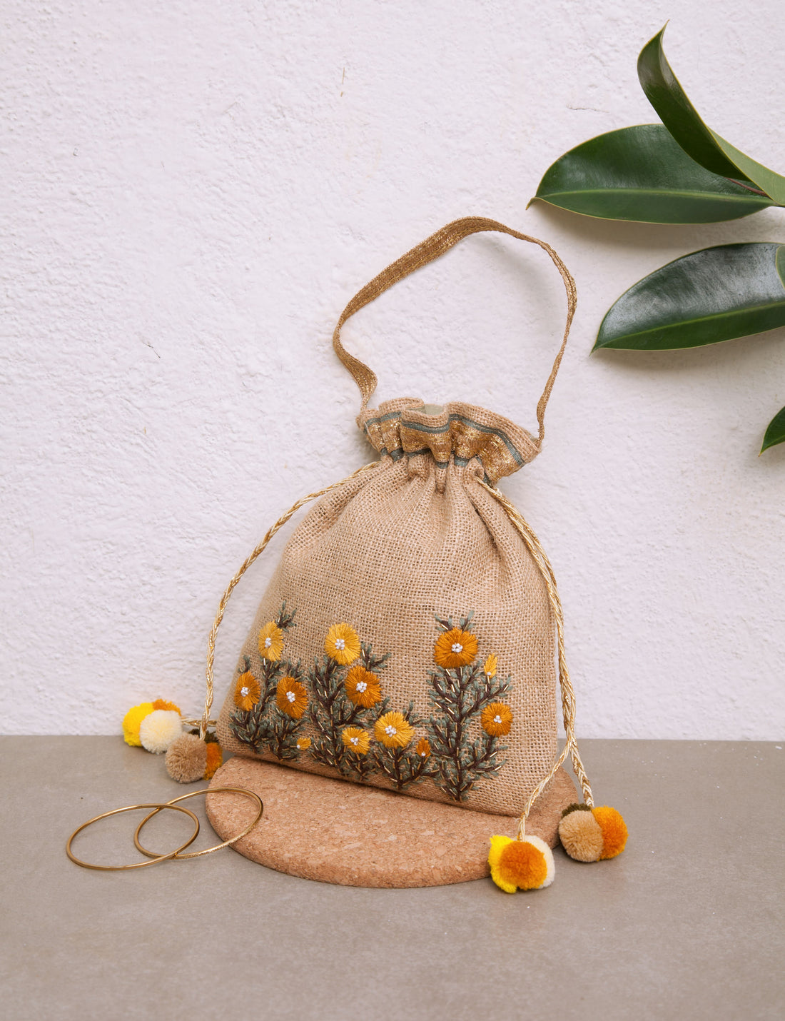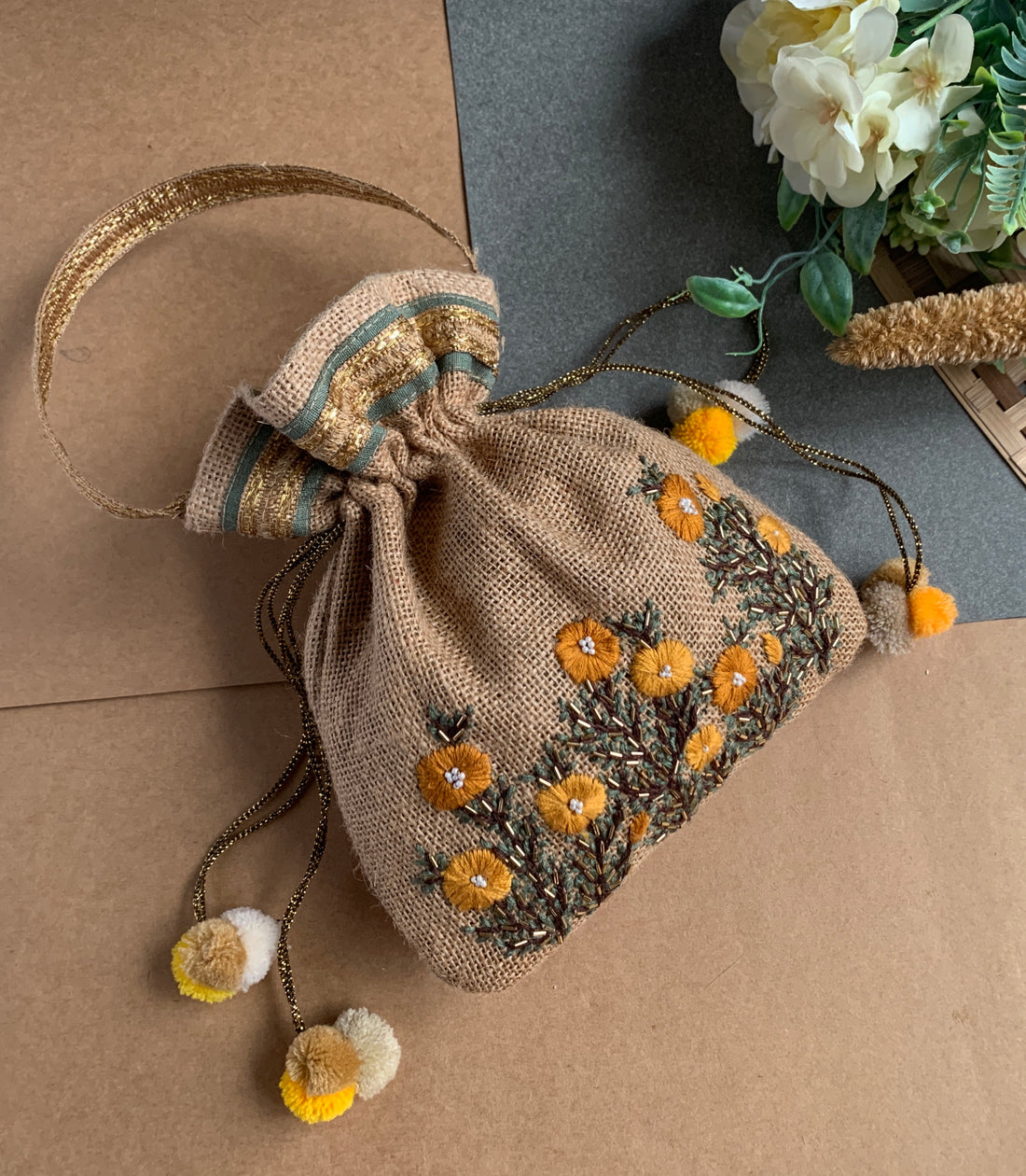 Buttercup flowers hand-embroidered on Jute potli, detailed with bugle beads to add the subtle luxe sheen, and pom poms adding to the final finishing touches.