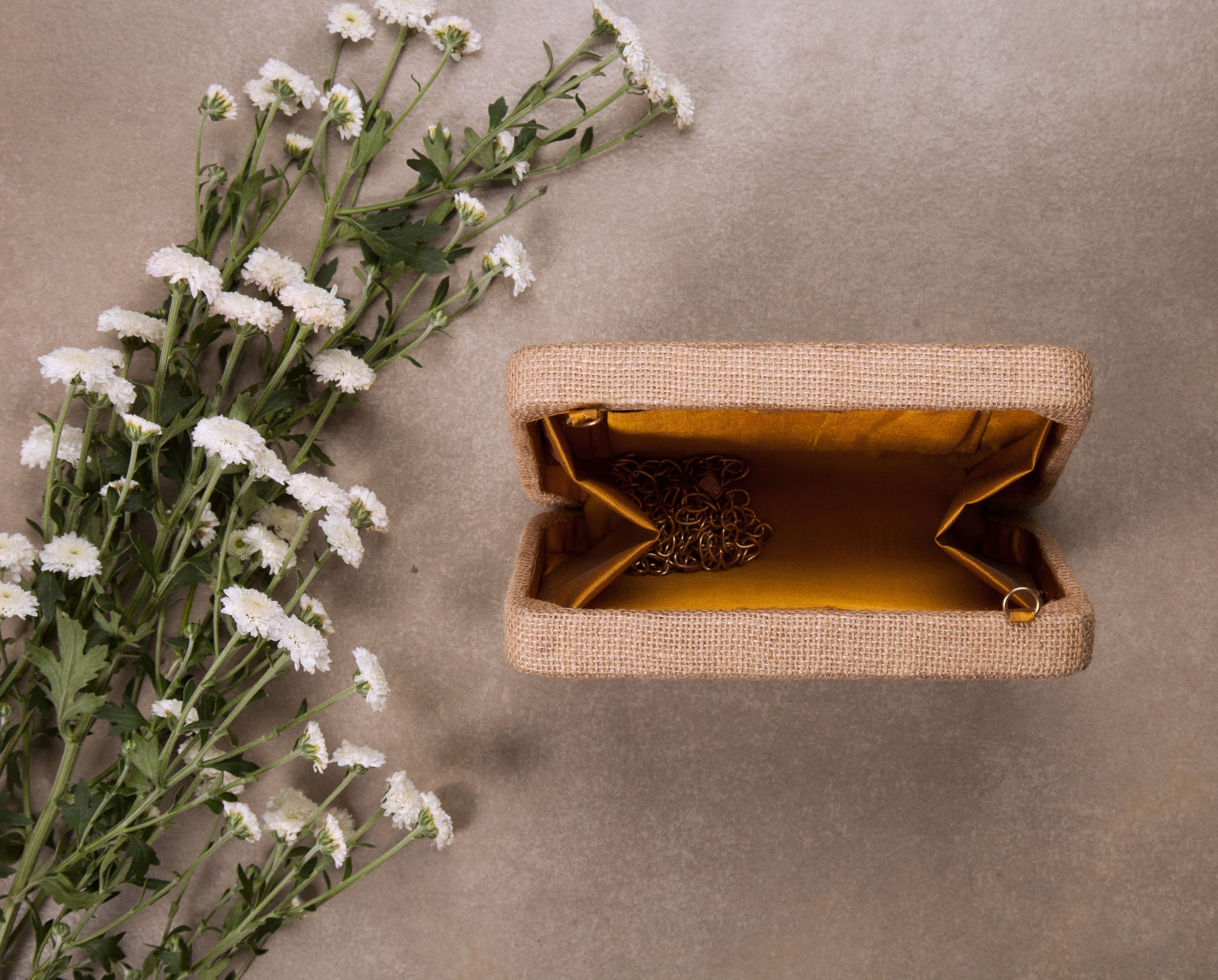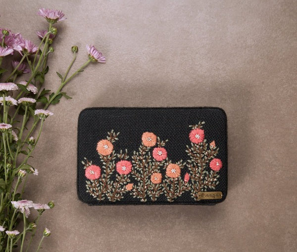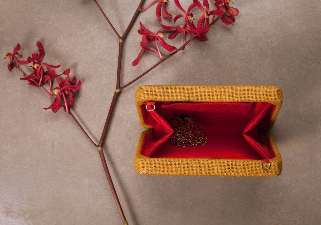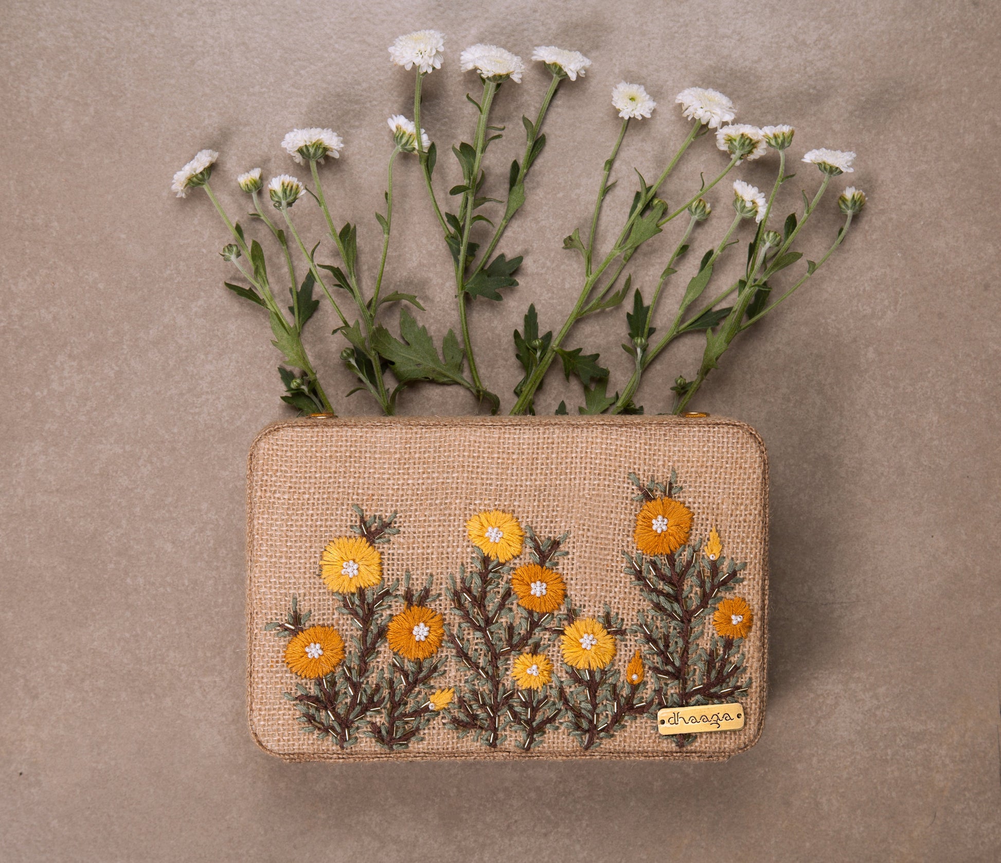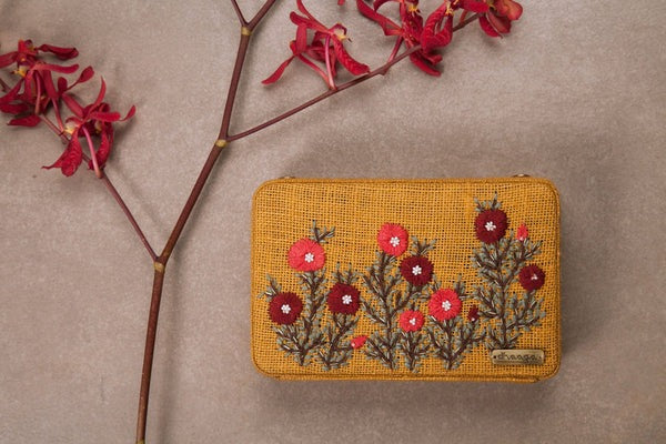 This box clutch is a statement piece to adorn for daytime affairs. It has been put together by a team of highly skilled women. This beige hand embroidered clutch is enticed with buttercups in shades of yellow and orange, highlighted with bugle beads and a metal box chain. Add an eccentric edge to your ethnic wear with this quintessential clutch. From brunch dates to family get-togethers, carry this one-of-a-kind accessory to look your absolute best.