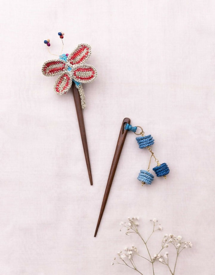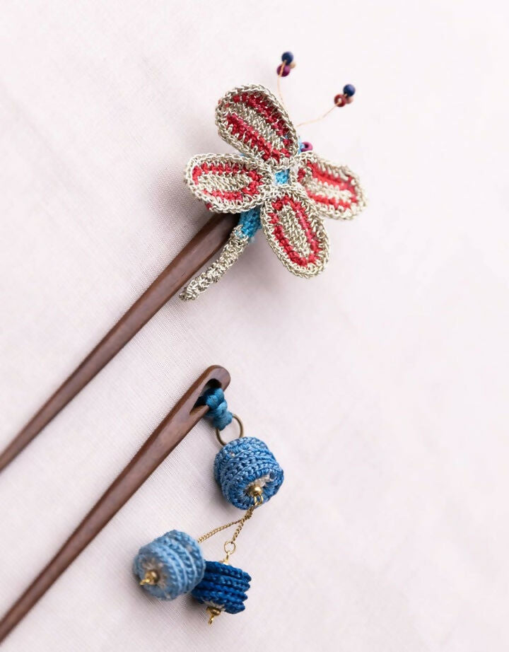 Materials: Viscose Thread, Wooden Hair Stick, Metallic Thread, Wooden Beads