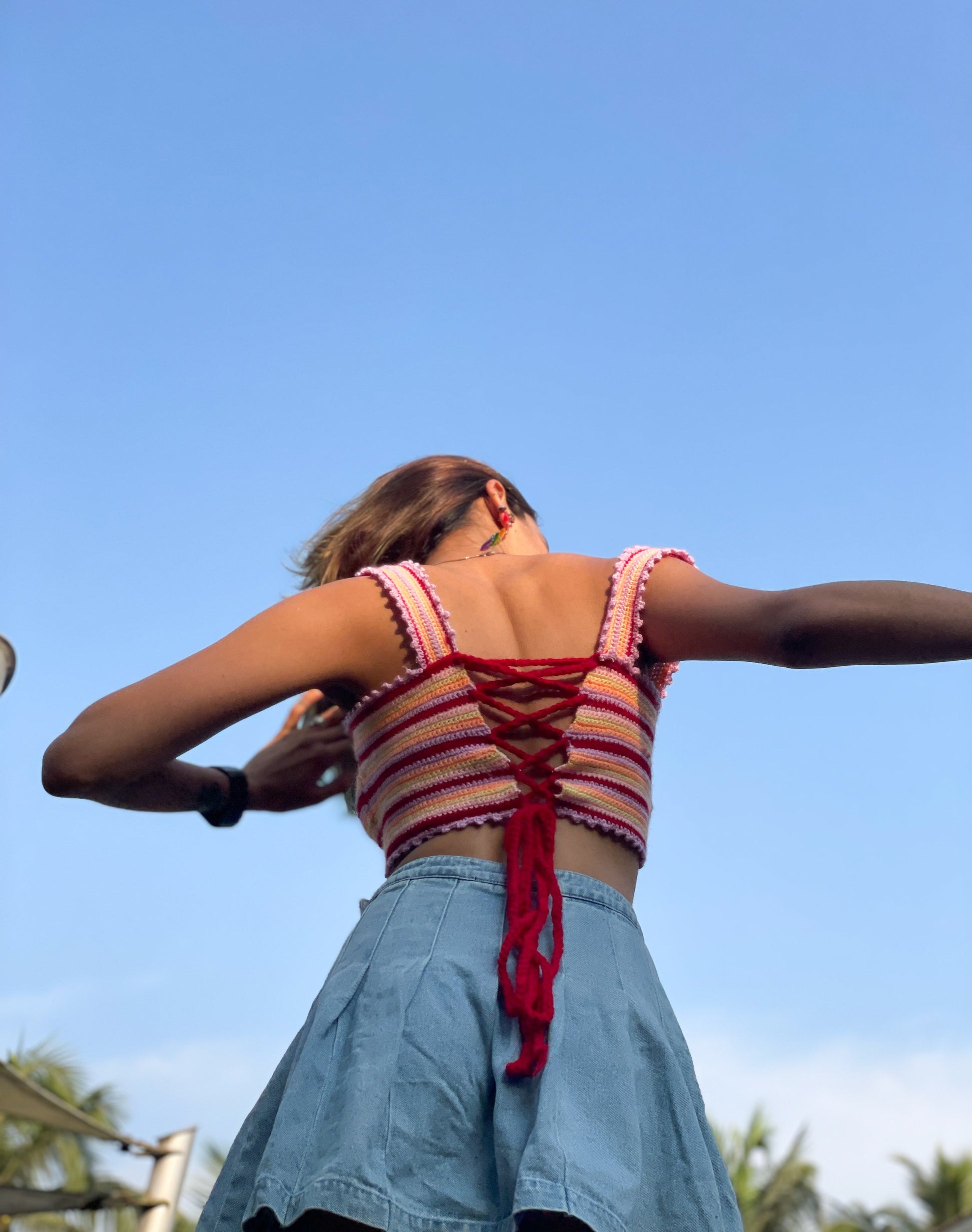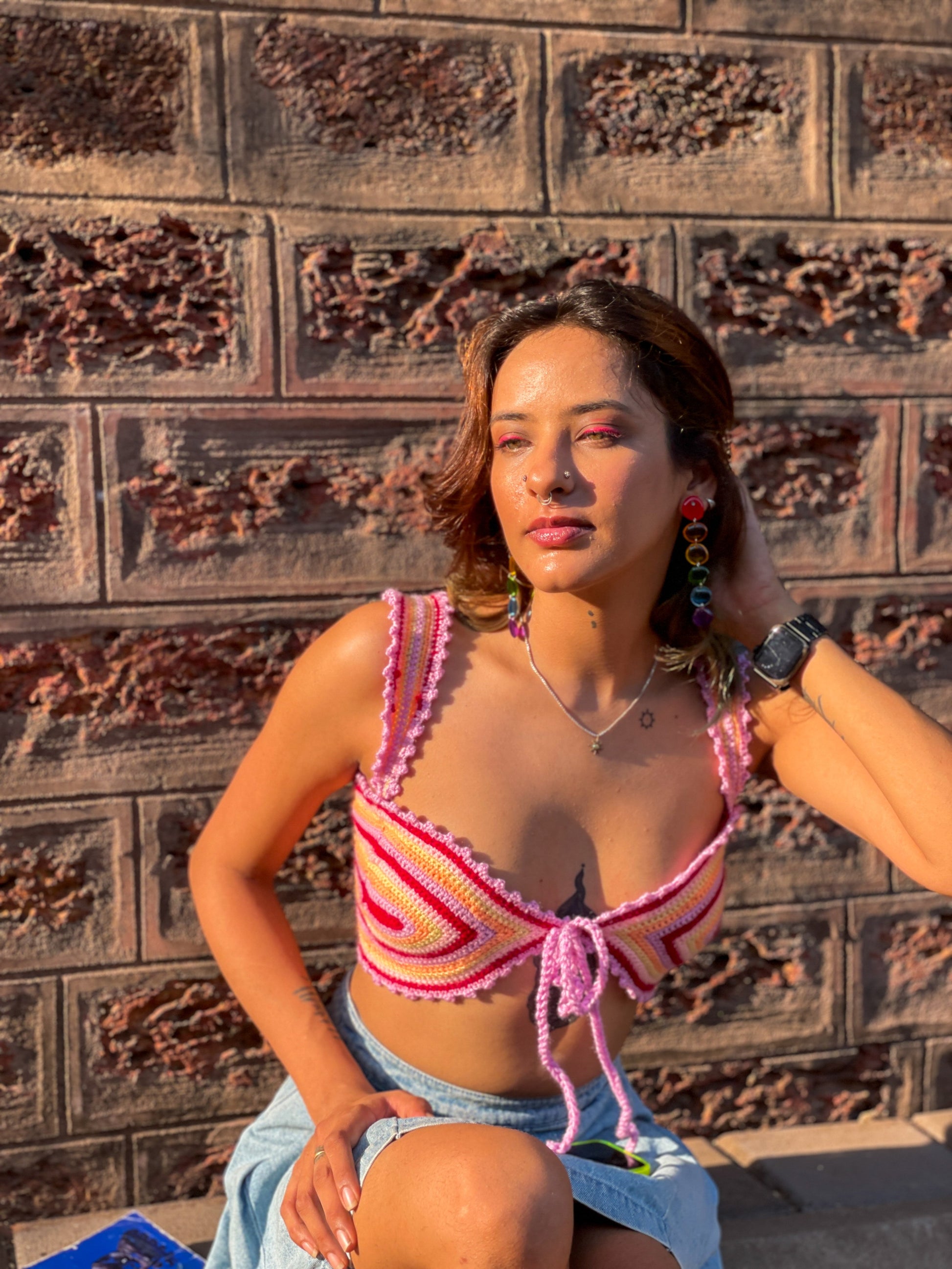 Add a burst of color to your wardrobe with this handmade crochet top. Crafted from soft 100% acrylic yarn, it features a vibrant mix of hues and a stylish, adjustable front tie for a customizable fit. Padded for comfort and a flattering silhouette, this unique, artisanal piece is perfect for elevating everyday wear or adding flair to special occasions.