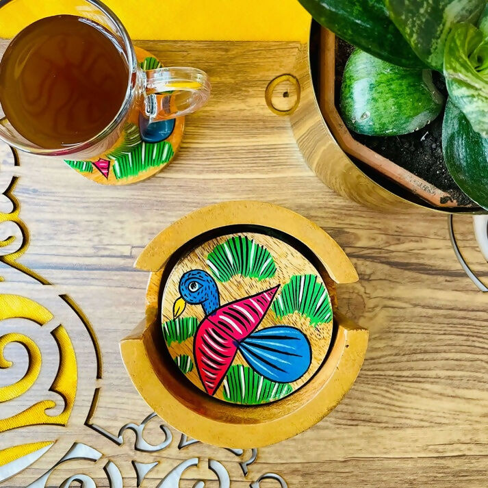 The wooden coasters capture two incredible artworks of India. Mirroring the woodwork of Saharanpur, the coaster is a depiction of excellent craftsmanship. The embellishment done with Pattachitra motifs perfectly holds the intricate hand movements of Pattachitra artists.Carved from native mango wood, the handcrafted wooden coasters, completely plastic-free and metal-free, give a sustainable and artistic twist to your personal space