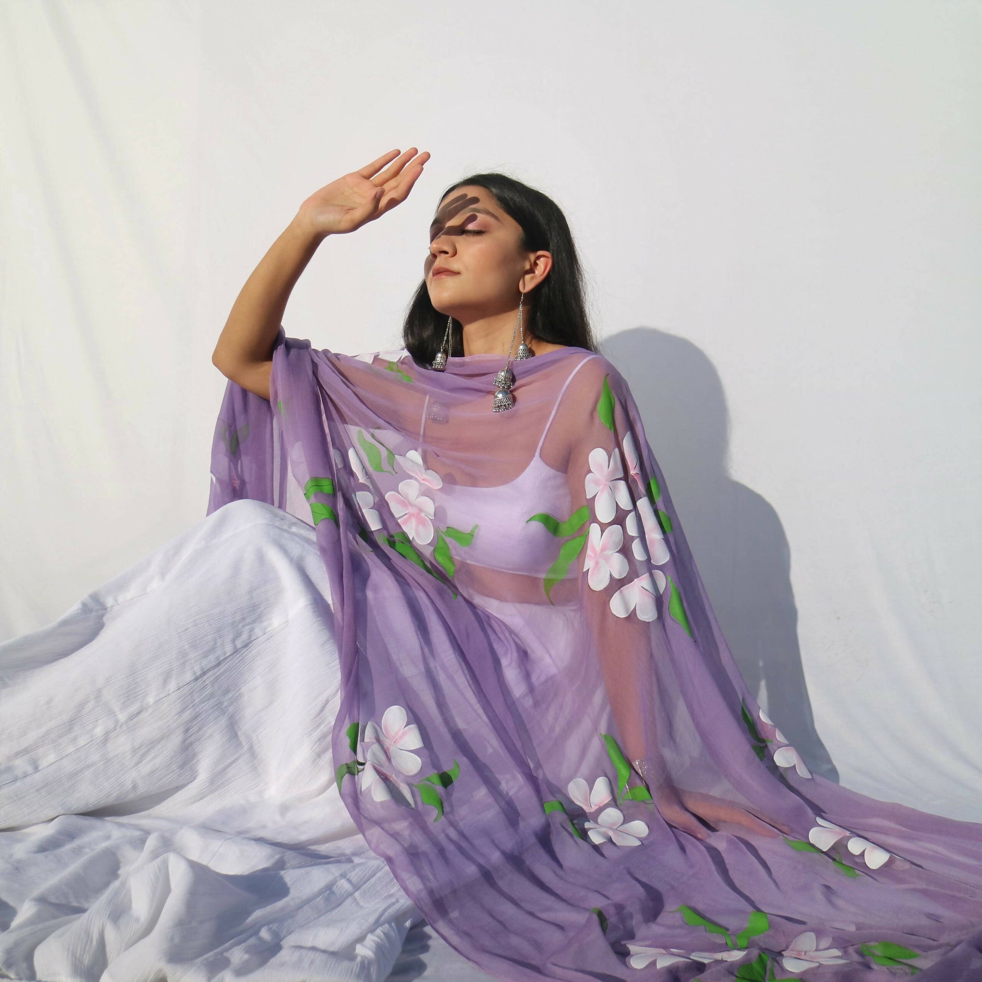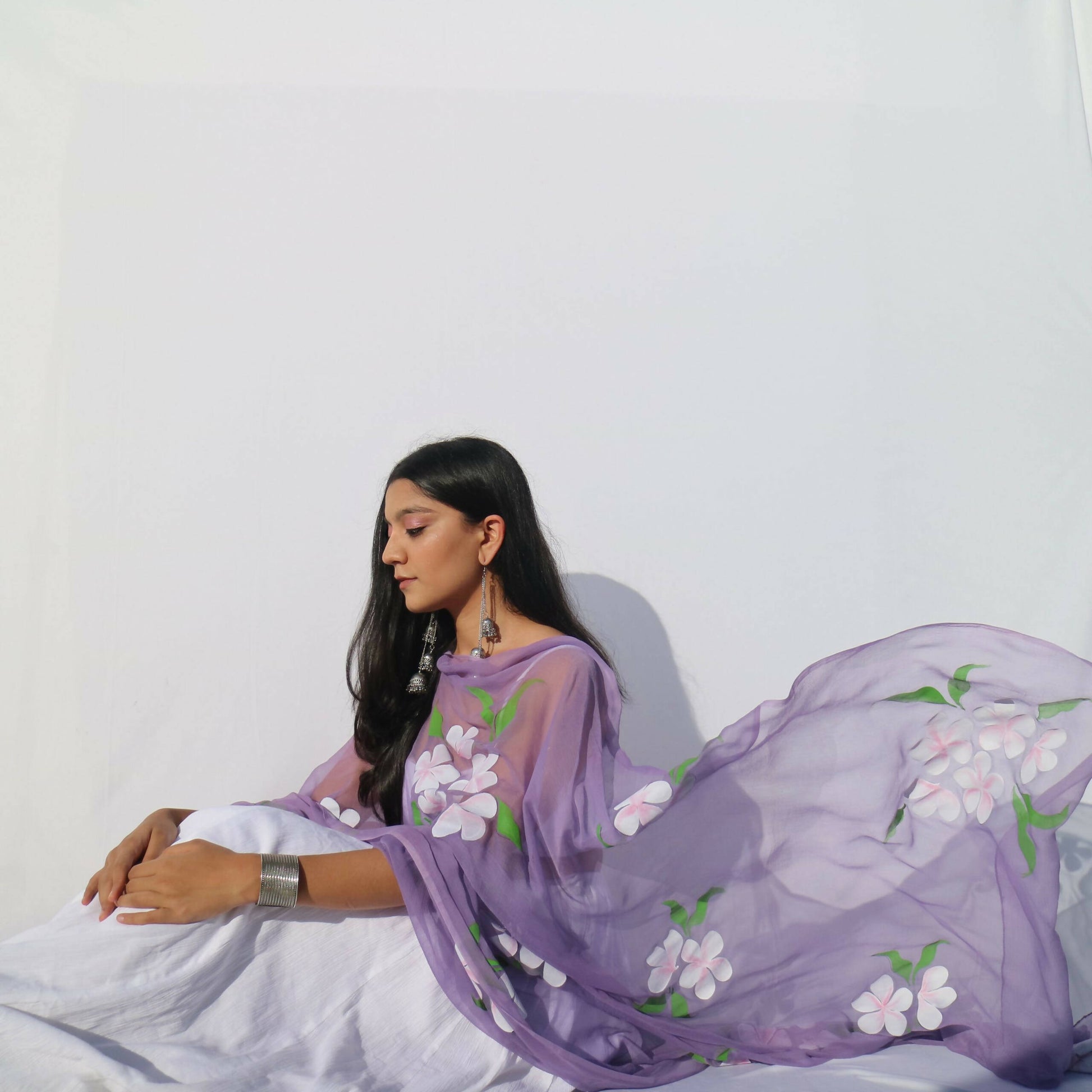 Lilac base chiffon dupatta hand-painted with champa flowers that can be paired with a monochrome outfit of your choice. Suitable for a casual outing or an intimate event, you can style this dupatta in multiple ways.