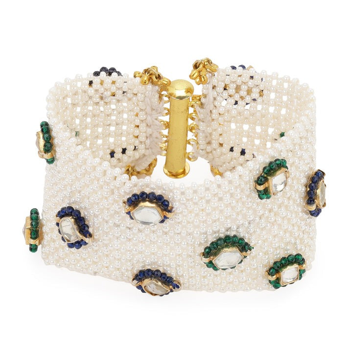The pearl meshwork has been done intricately by hand using very fine pearls and an age-old threadwork technique. The polkis have been framed by glittering garnet stones in blue and green to add a burst of colour to the piece.