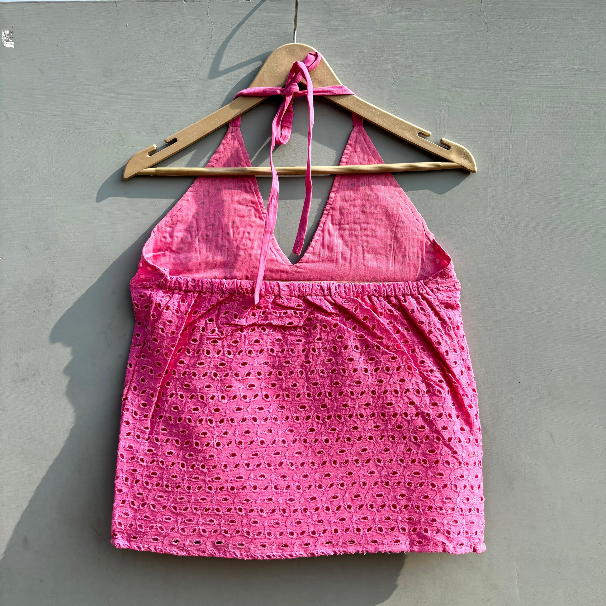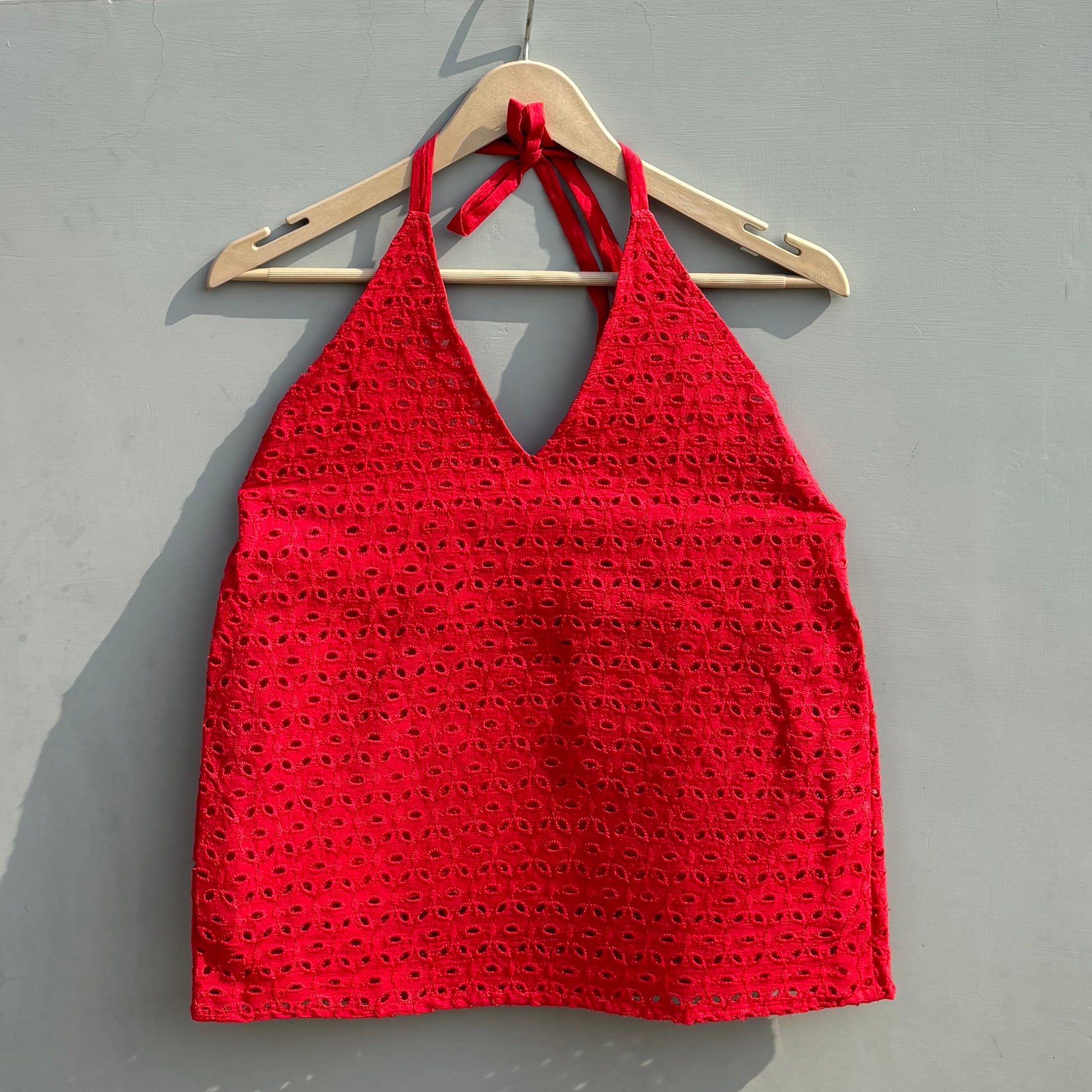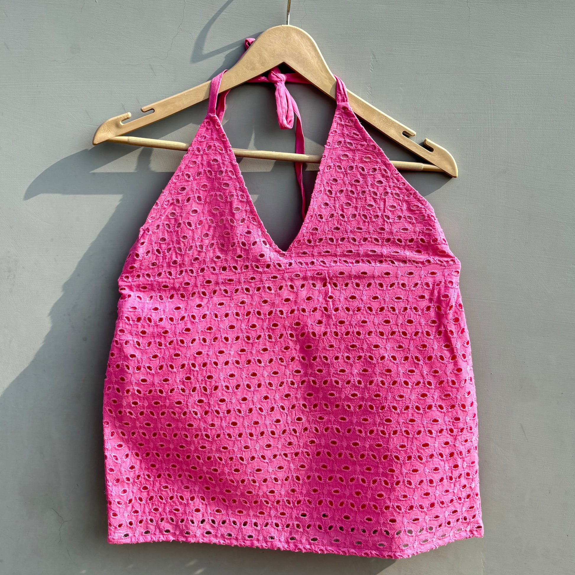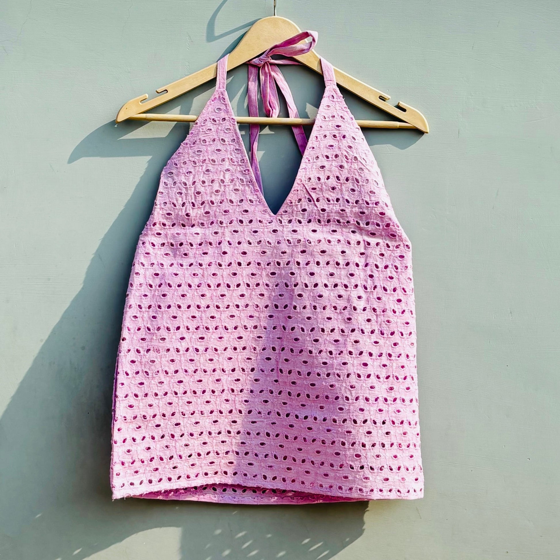 The Chikan Hakoba Halter Neck Cotton Top combines intricate craftsmanship with contemporary style. Made from soft, breathable cotton, it features delicate Chikan embroidery with a Hakoba texture, offering a refined, traditional touch. The halter neck design enhances its chic appeal, making it perfect for both casual and festive occasions. Light and airy, this top exudes timeless elegance, effortlessly blending comfort with intricate artistry.