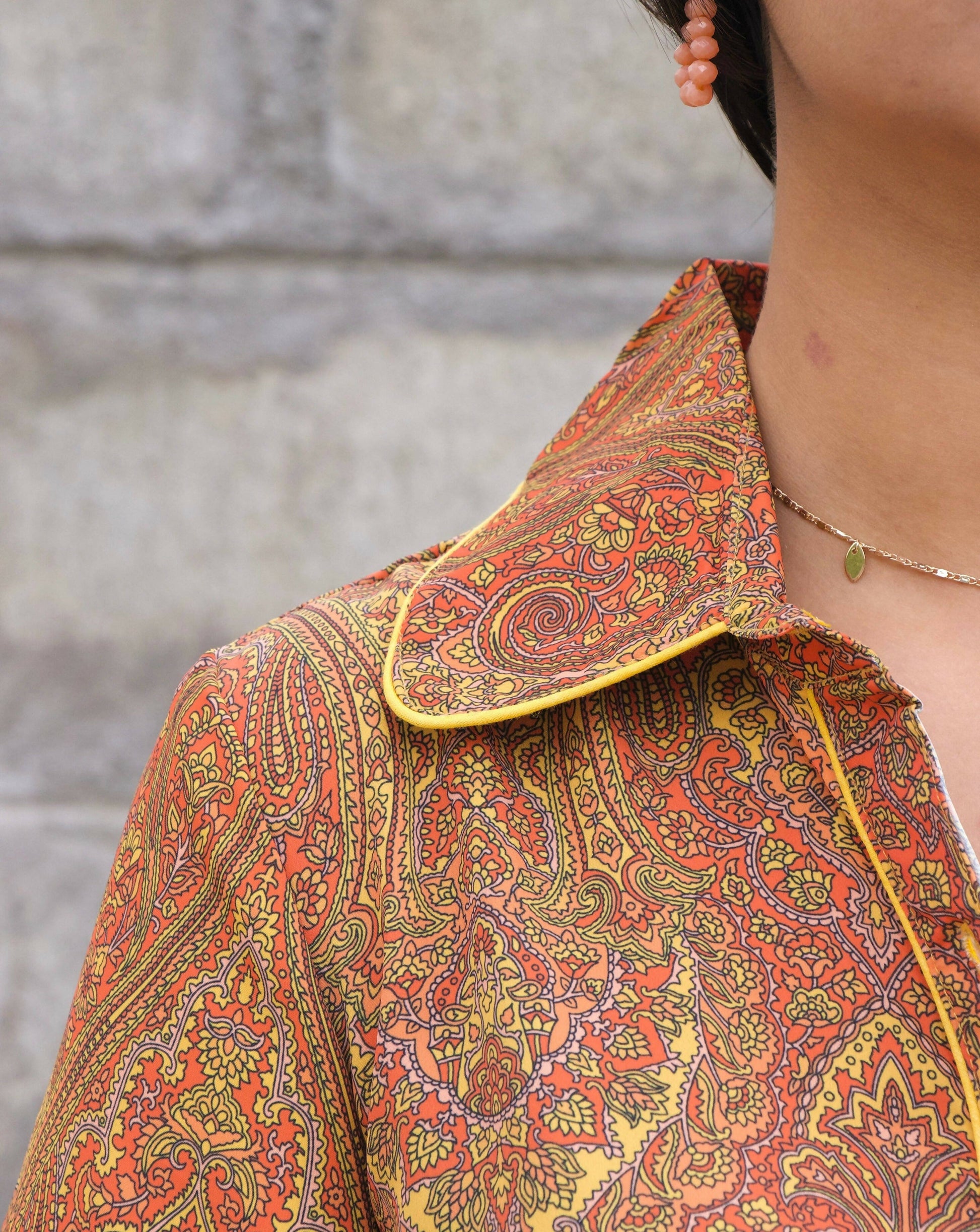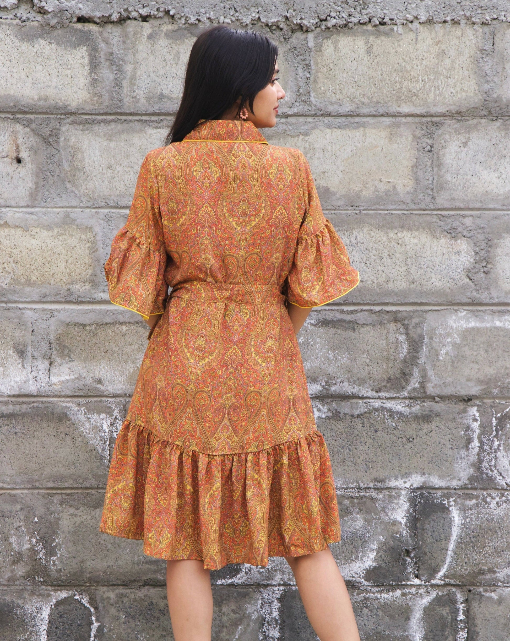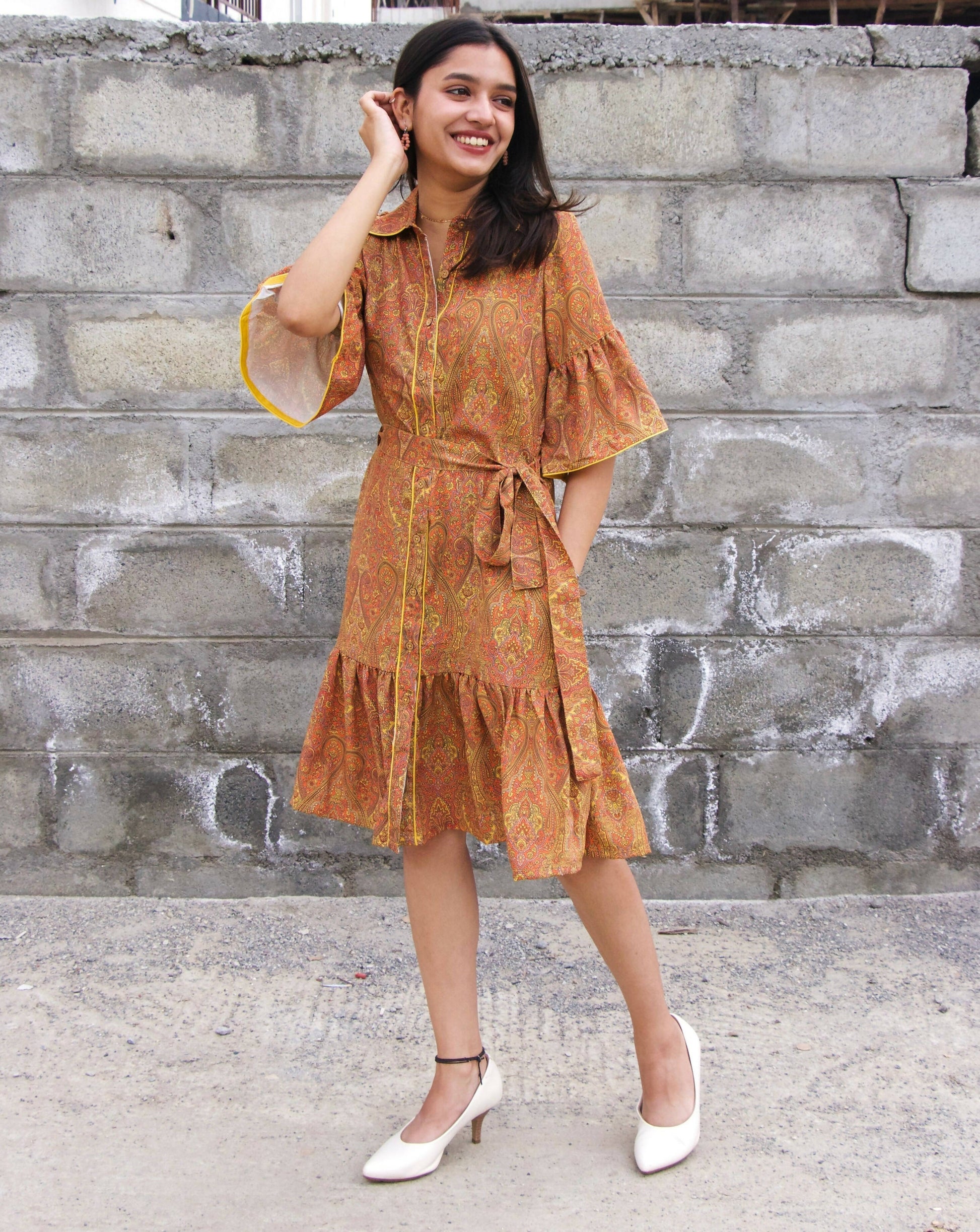 This orange paisley belt dress is a button down that adds a bright spark to your daily wardrobe. The cotton tensil fabric makes the dress flowy and breathable. The tier near the knees adds to the flow and makes it a cute dress we all need on summer days!