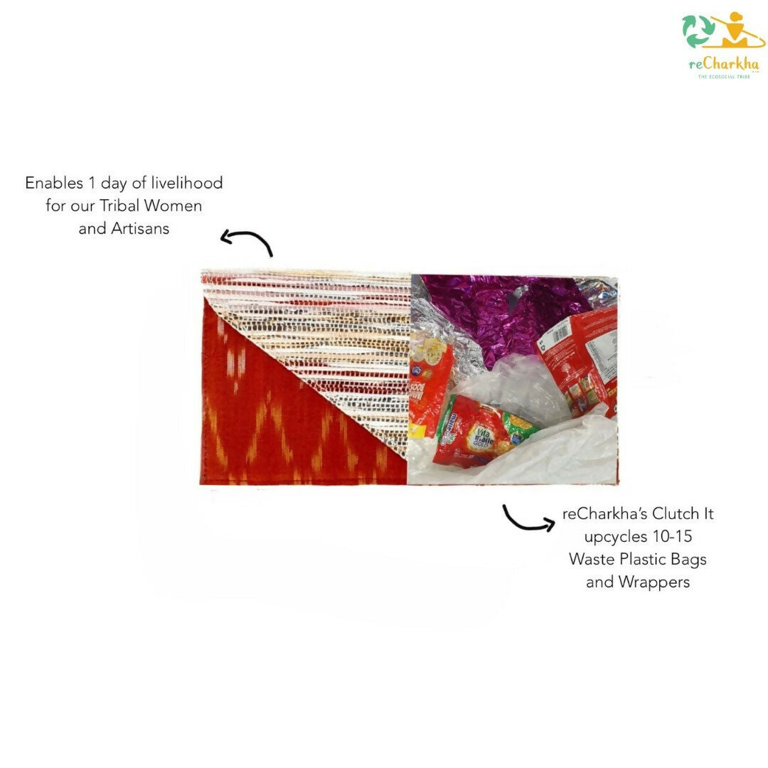 reCharkha's UPCYCLED HANDWOVEN Clutch-it comes in so many patterns, designs and colors that you’d want to make up reasons to flaunt it around!It’s a perfectly sleek size to carry your cell-phone, wallet, keys and make-up accessories in.