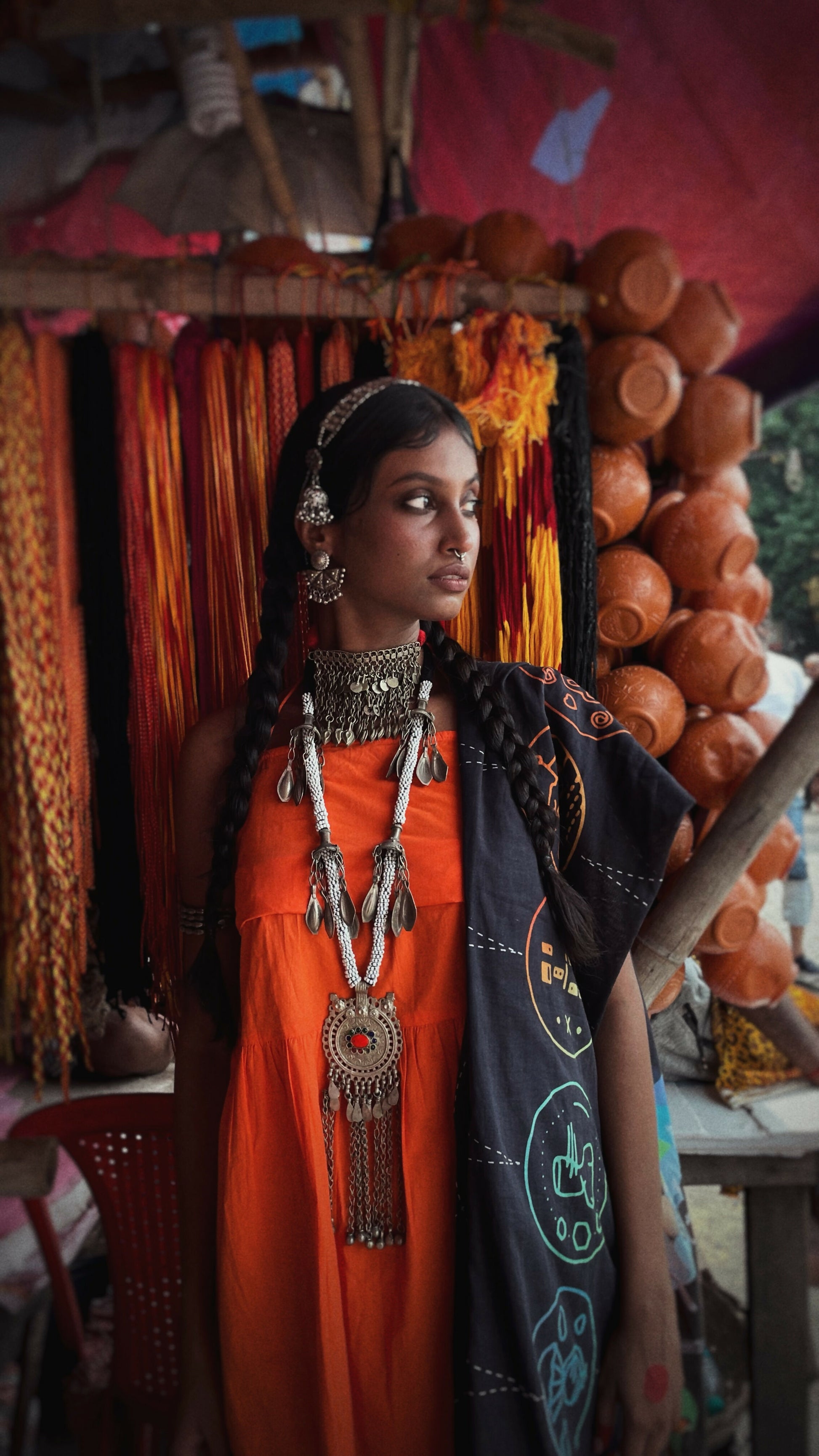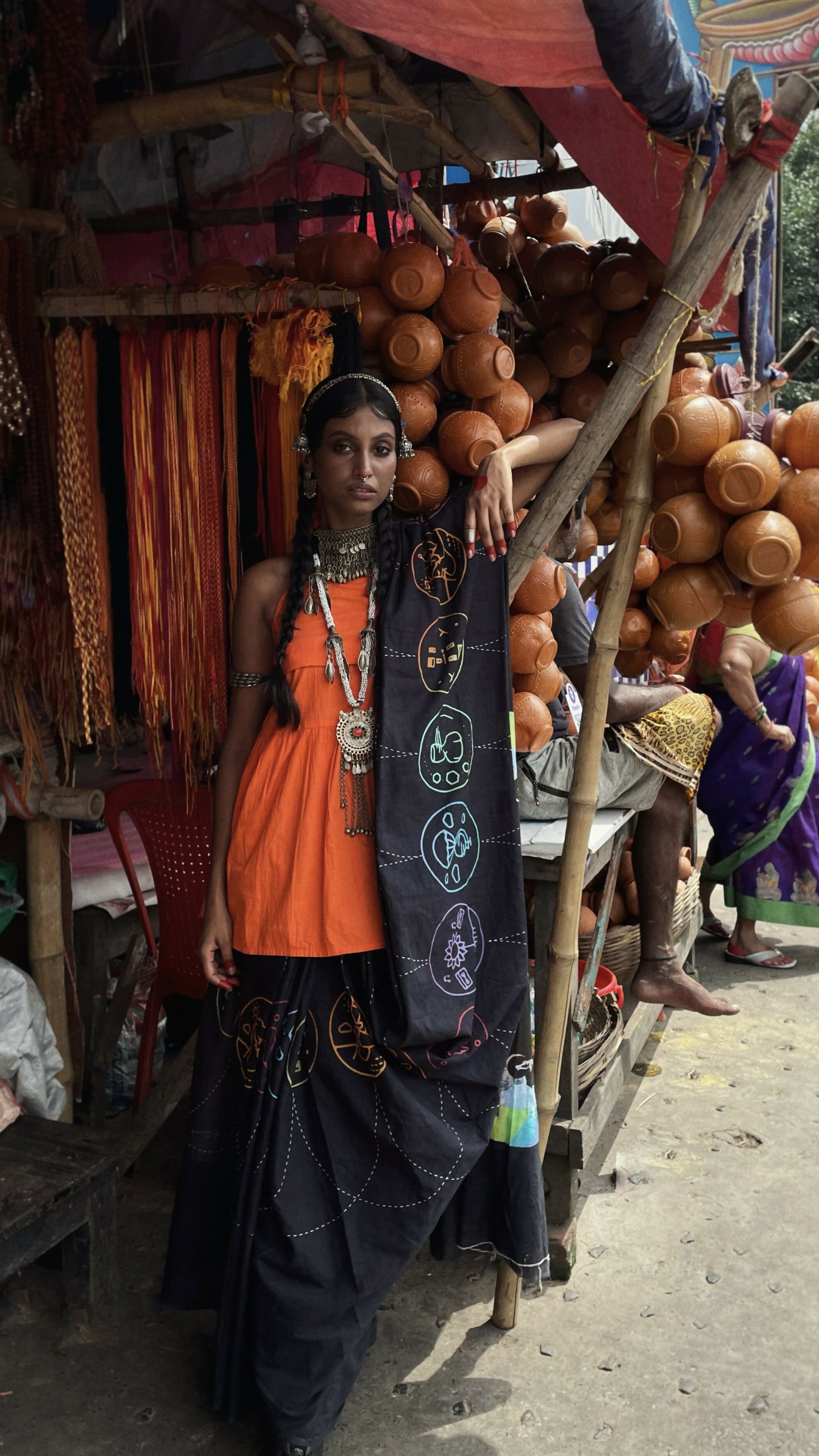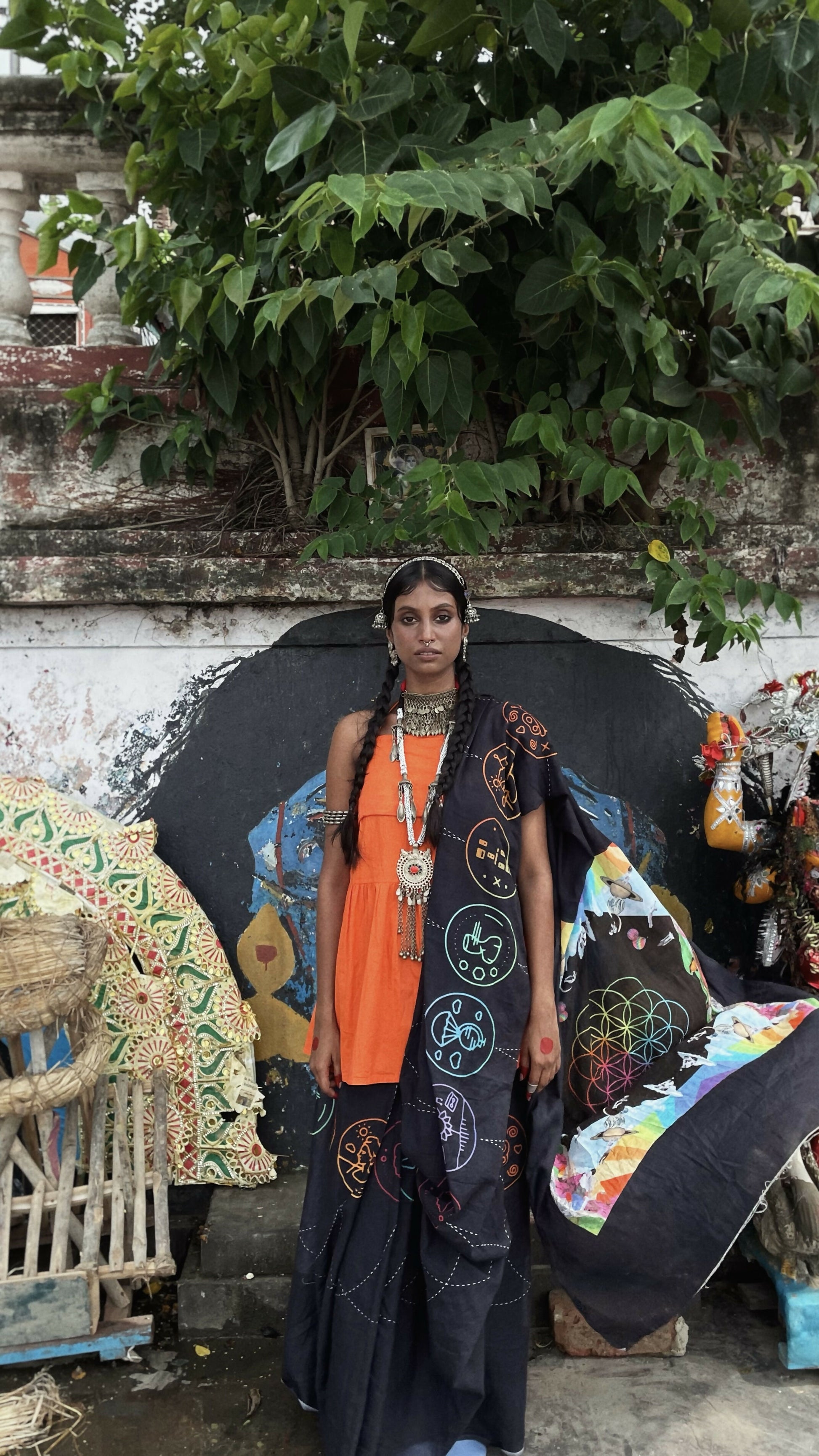 This saree is inspired from Coldplay's hit album, A Head Full Of Dreams. This black mul cotton saree is an absolute stunner! The coolestinfusionever. The body is black in color with cool motifs printed all over the body and the album cover of A Head Full Of Dreams is printed on the pallu.