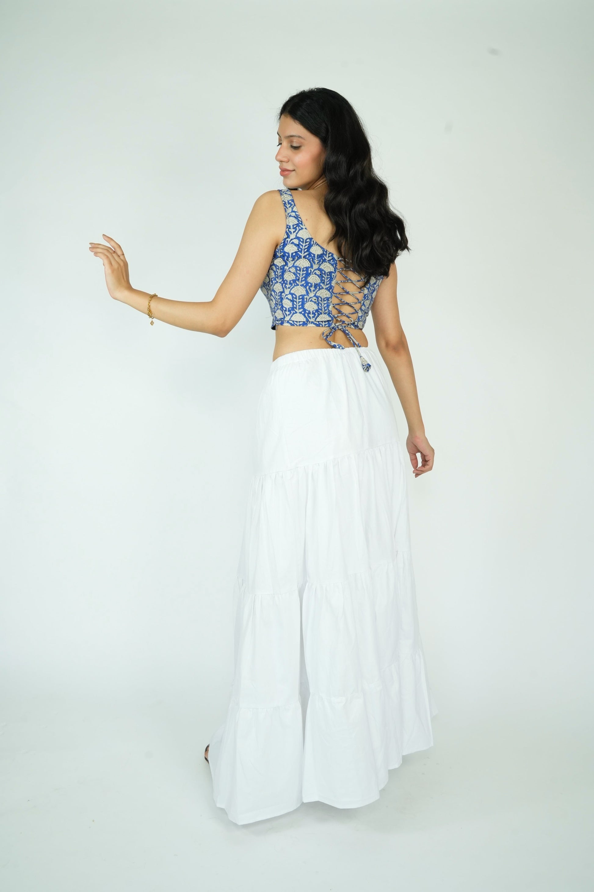 Comfortable all-day wear Handblock Print Corset Top, designed for a snug fit. Boning tape enhances shape, while silicon-covered tape adds durability, ensuring the corset keeps its form and functionality.