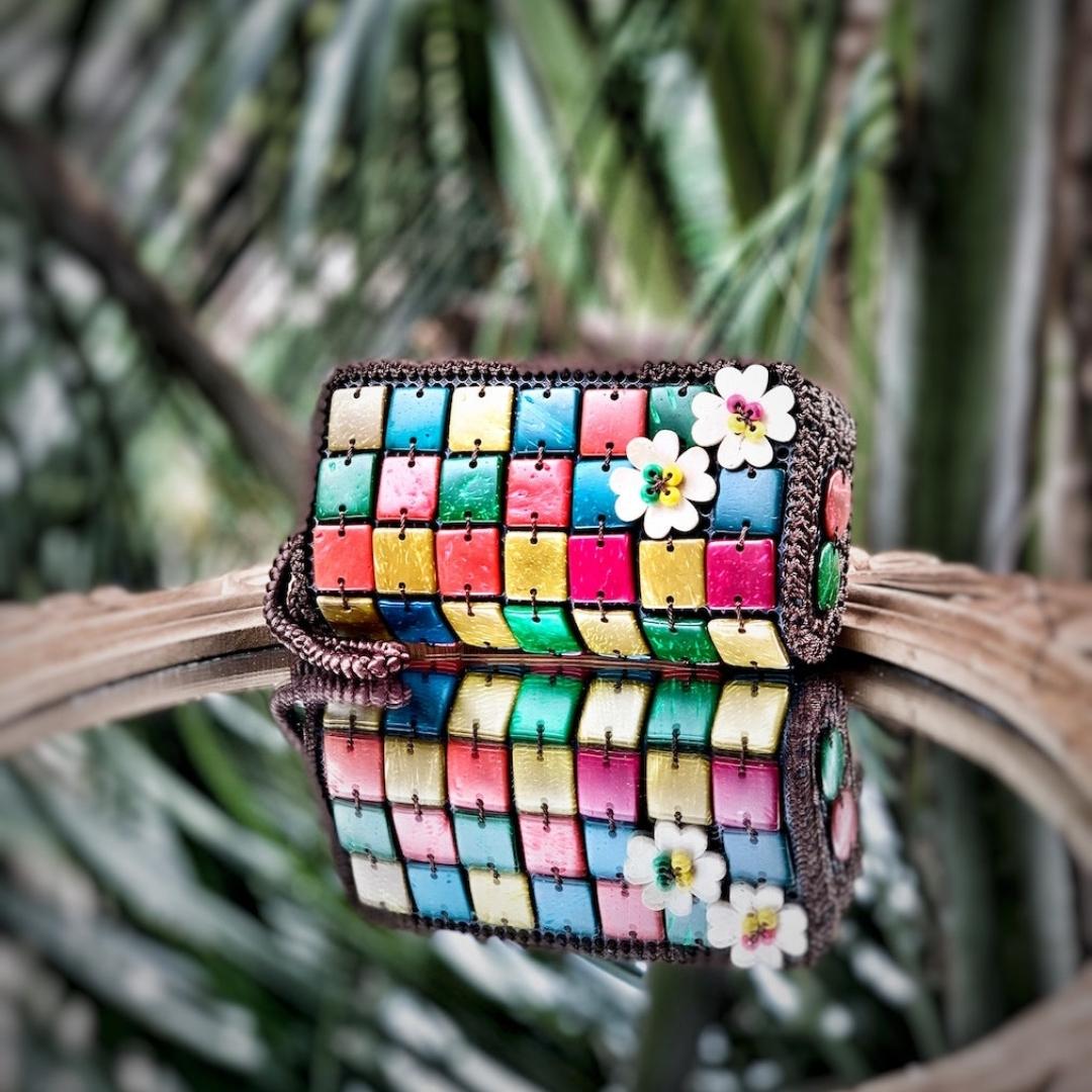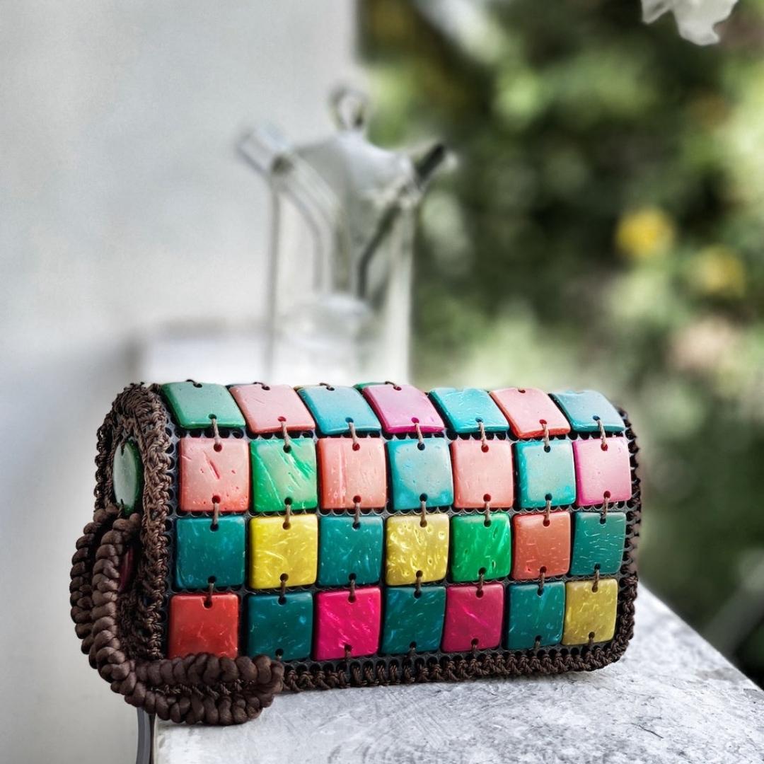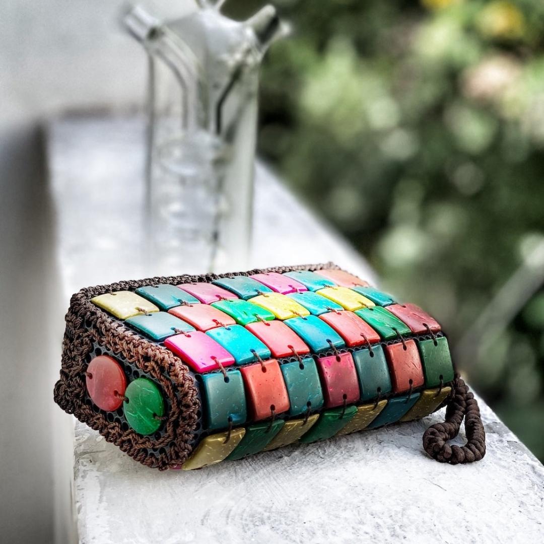 Natural coconut shells beautifully handcrafted into different shapes and sizes... floral motifs, ditsy buttons, discs and cubes. Hand stitched on recycled PU mesh with Korean silk seams and strap.