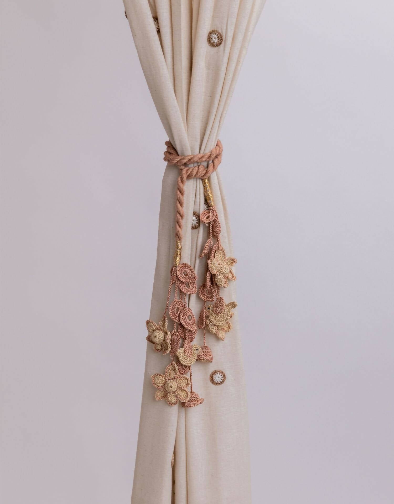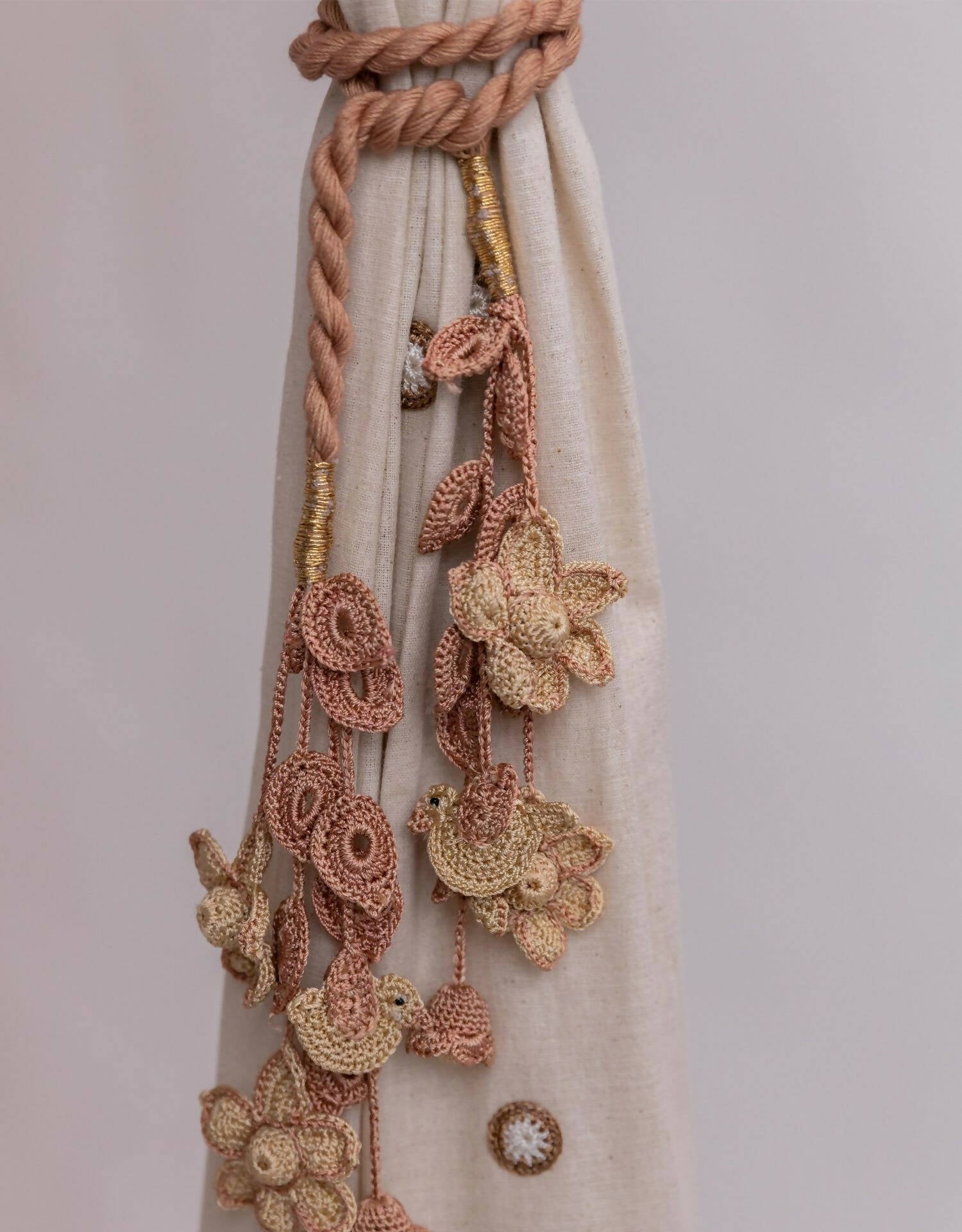 Crochet Curtain Tie Backs Set Kono Beige Flowers & Birds