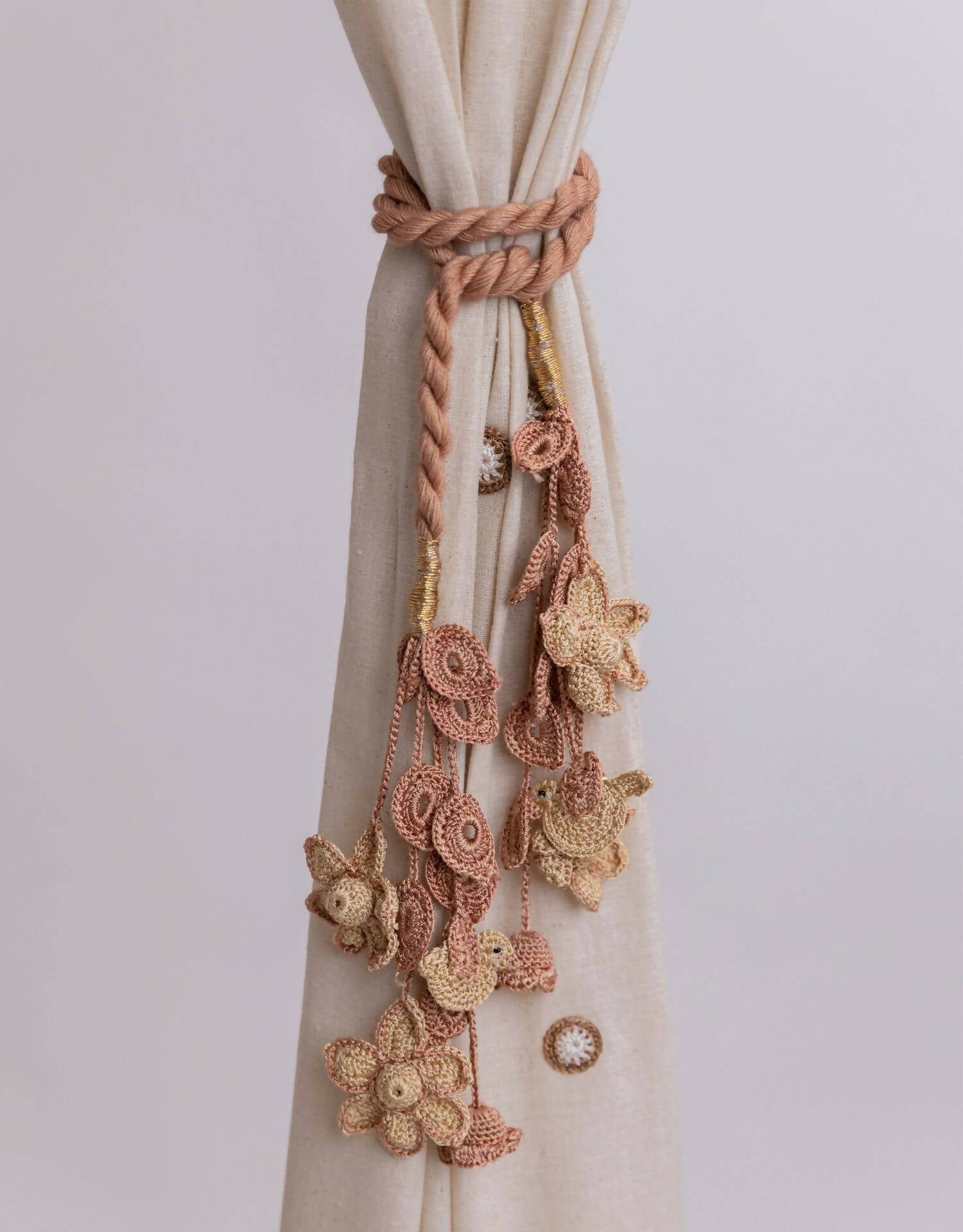 Kono translates to 'knot'. Worried about your curtains getting caught and tearing in the breeze? Use these elegant, and flexible curtain tie backs to knot them in place. They are handcrafted by our women crocheters of Gaya to complement our curtain collection or to add a designer touch to any plain drapes as well. Much like their natural floral motifs, they are functional curtain accessories while simultaneously flaunting their elegance. Take them home to say goodbye to flailing curtains and add an artisanal element to your space!
