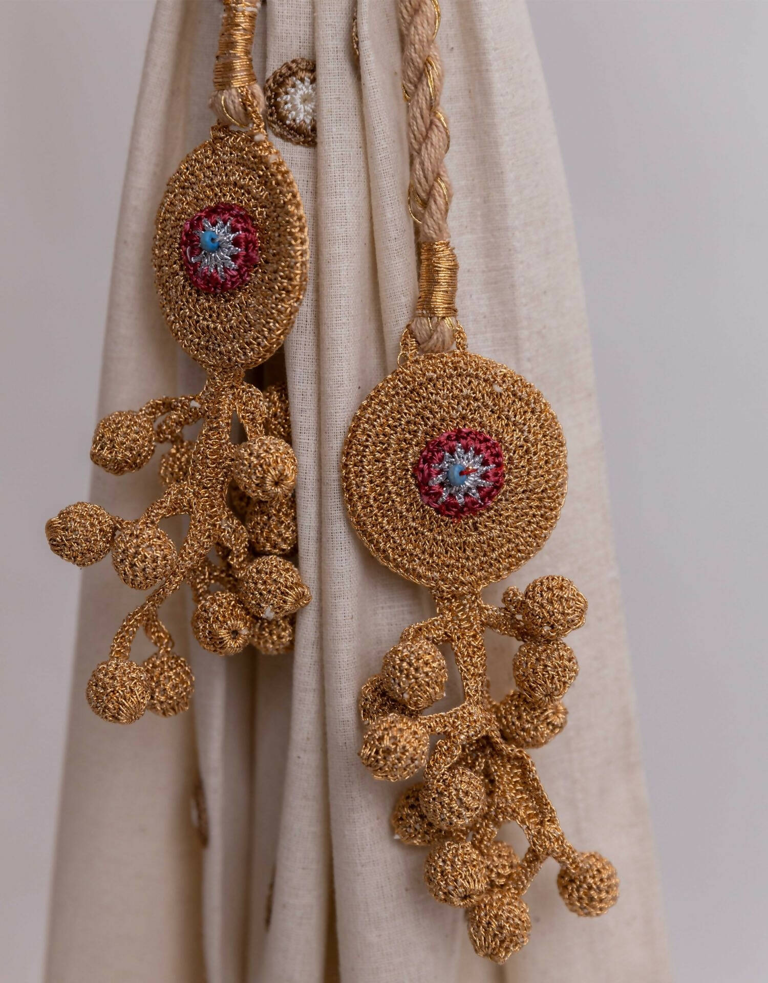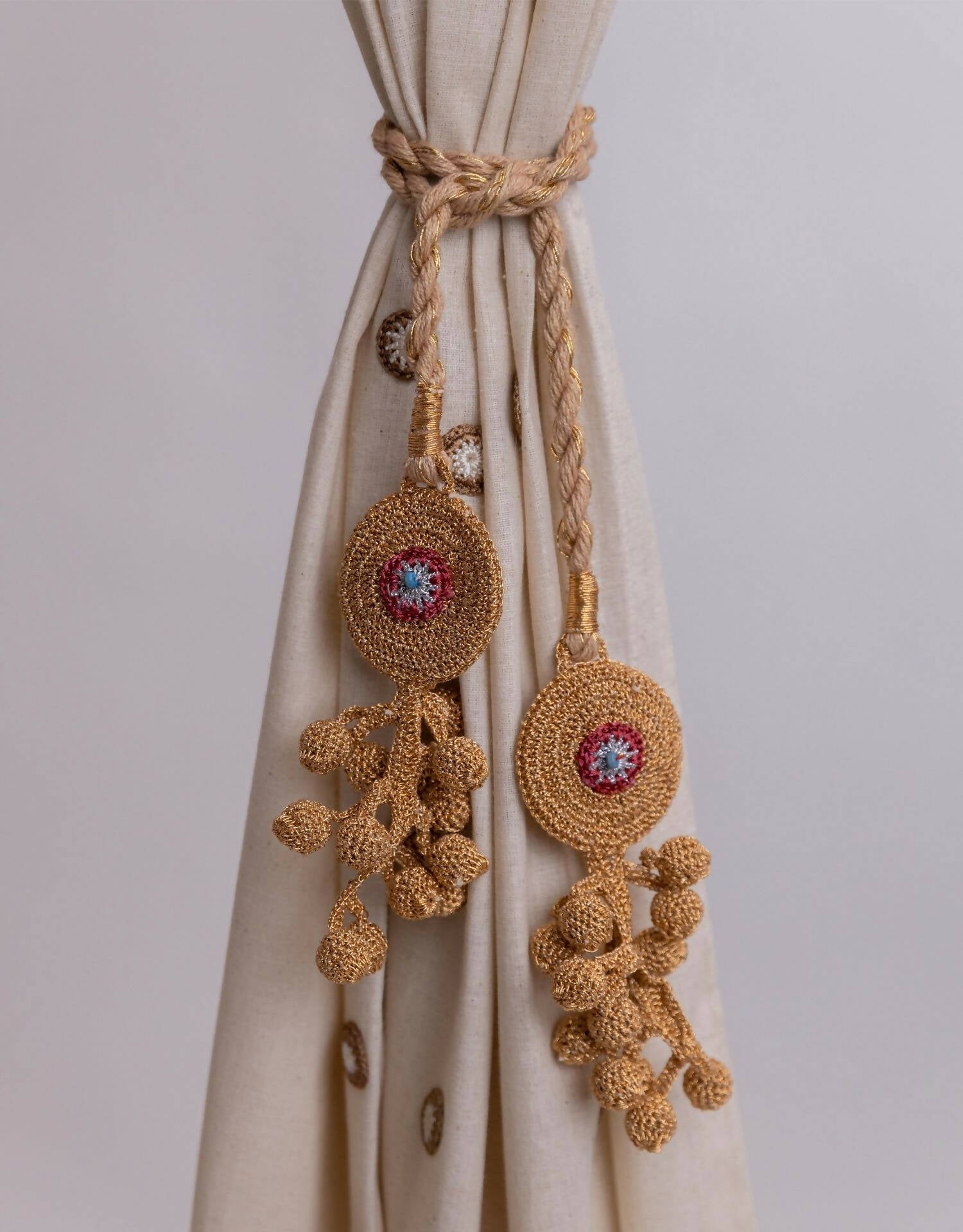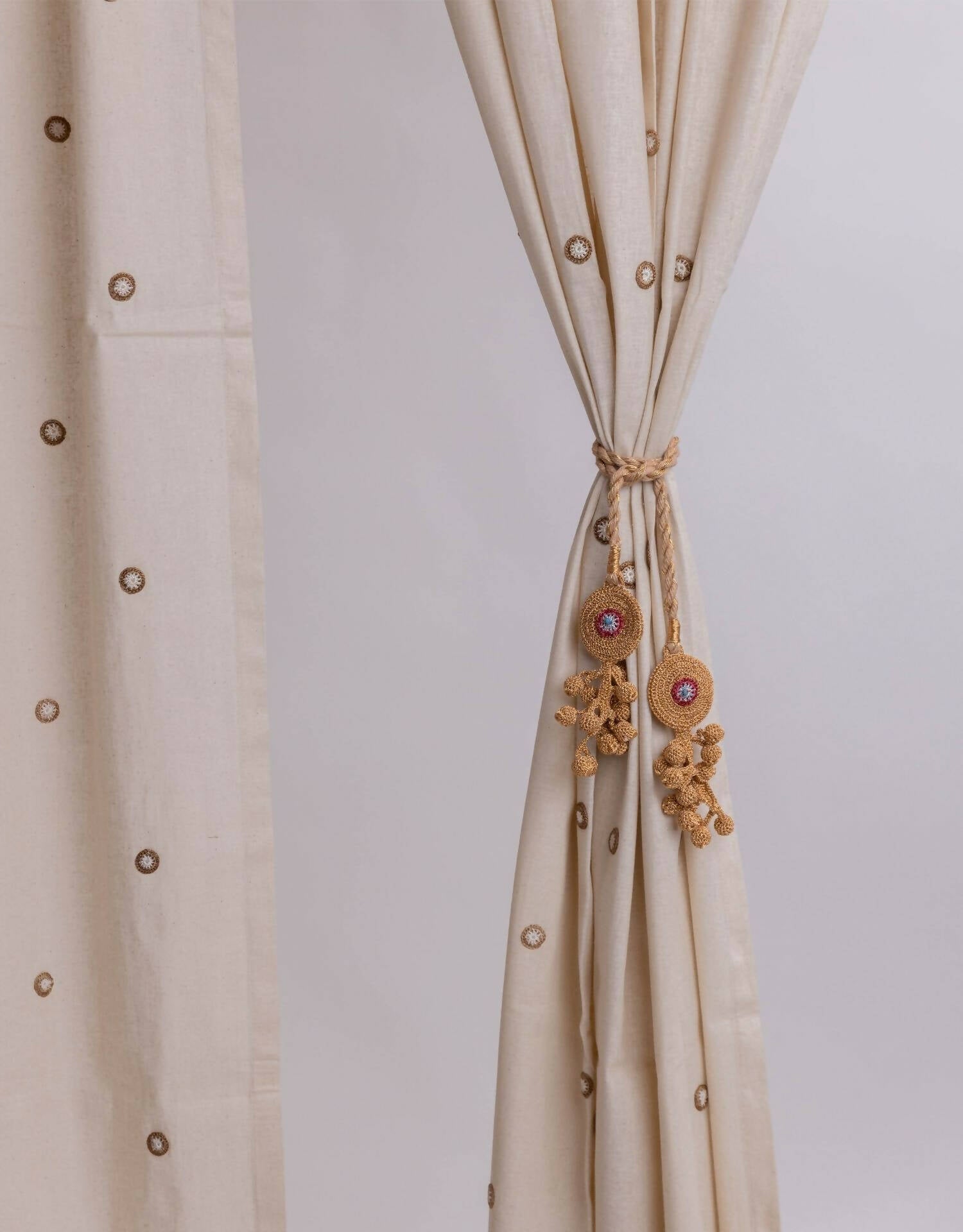 Kono translates to 'knot'. Worried about your curtains getting caught and tearing in the breeze? Use these elegant, and flexible curtain tie backs to knot them in place. They are handcrafted by our women crocheters of Gaya to complement our curtain collection or to add a designer touch to any plain drapes as well. Much like their natural floral motifs, they are functional curtain accessories while simultaneously flaunting their elegance. Take them home to say goodbye to flailing curtains and add an artisanal element to your space!