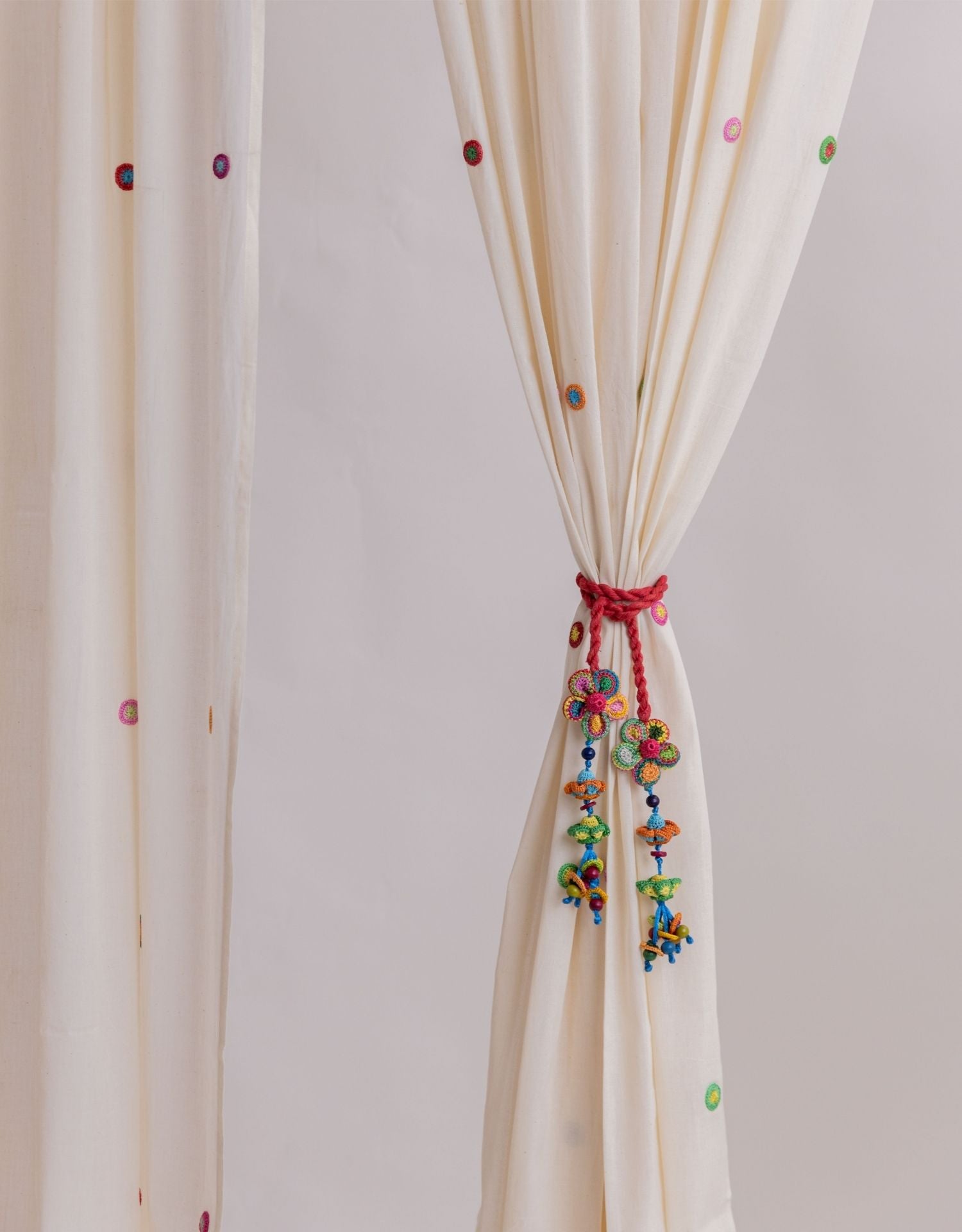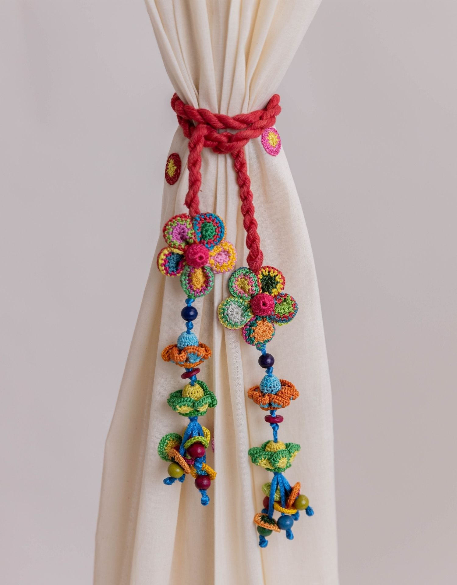 Kono translates to 'knot'. Worried about your curtains getting caught and tearing in the breeze? Use these elegant, and flexible curtain tie backs to knot them in place. They are handcrafted by our women crocheters of Gaya to complement our curtain collection or to add a designer touch to any plain drapes as well. Much like their natural floral motifs, they are functional curtain accessories while simultaneously flaunting their elegance. Take them home to say goodbye to flailing curtains and add an artisanal element to your space!