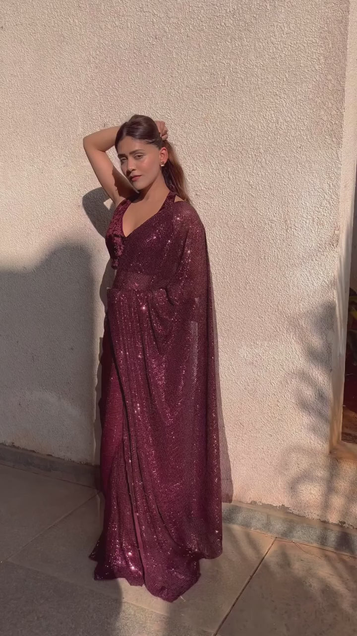 Shine bright this festive season and beyond in our wine-hued sequin saree. It’s a 6-meter long saree that is heavily embroidered with crushed sequins. It’s made using premium net fabric. Style it with minimal jewellery for that chic look!