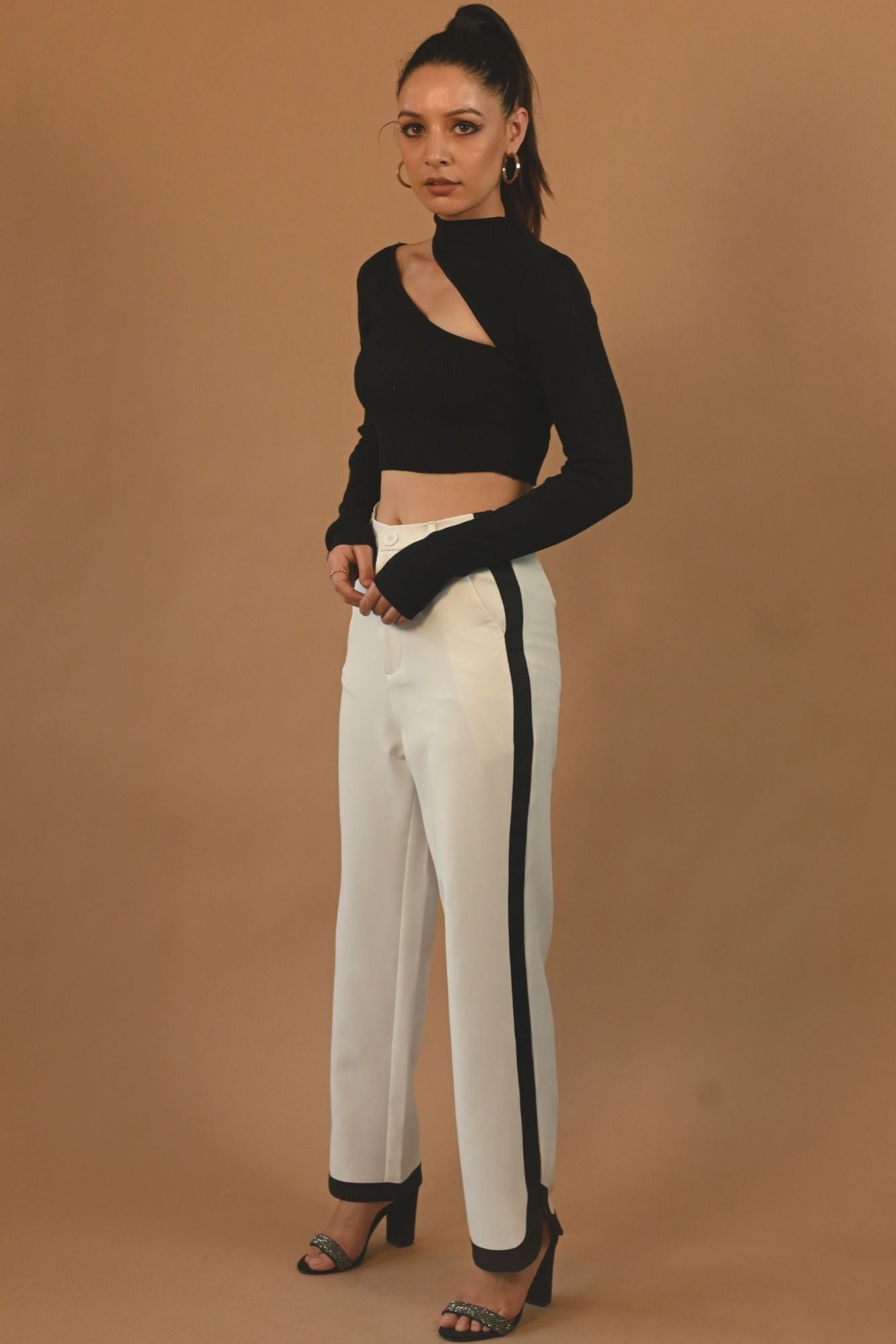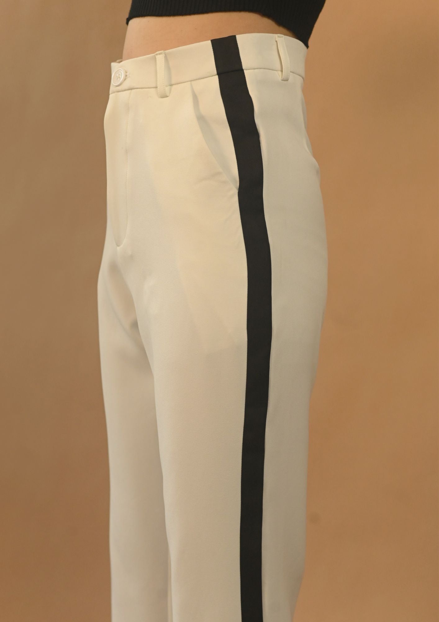 High waist straight pants with a curved hem from one side. Featuring dart details, black strap details on the sides, pockets and hem, fly zip and button fastening on the front.