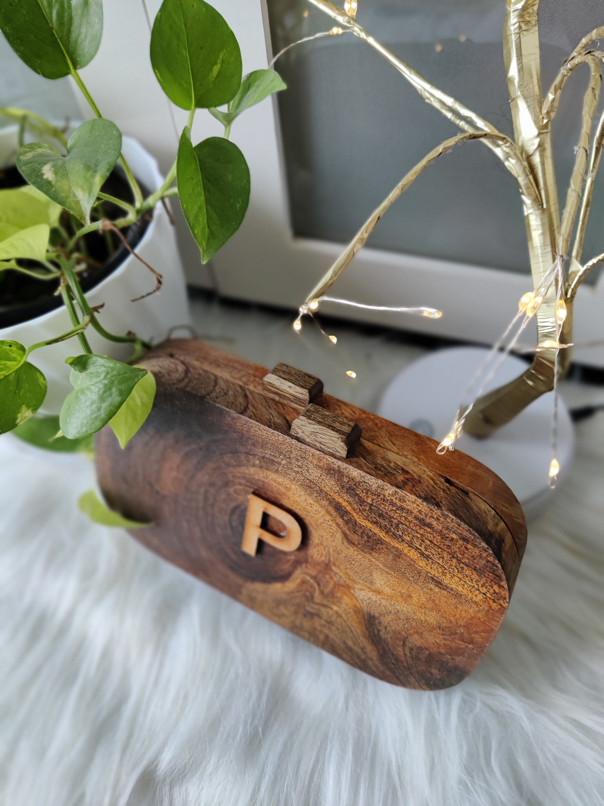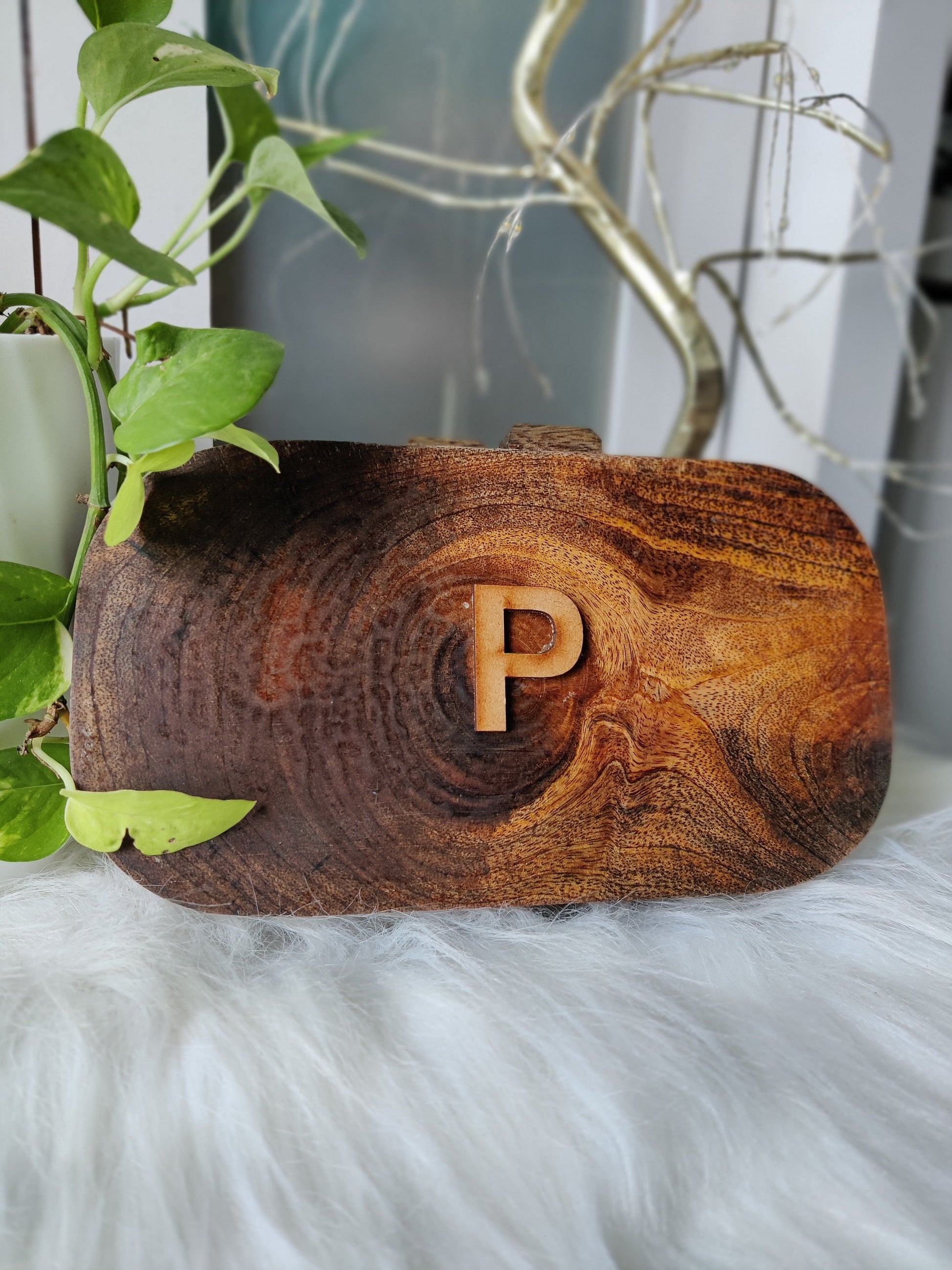 This expertly handcrafted bag showcases a sleek rectangular shape with soft, rounded edges and a personalized name initial. Crafted from durable acacia wood and secured with a magnetic closure, it combines elegance with functionality. The black velvet interior adds a luxurious touch, making it a refined accessory for any occasion.