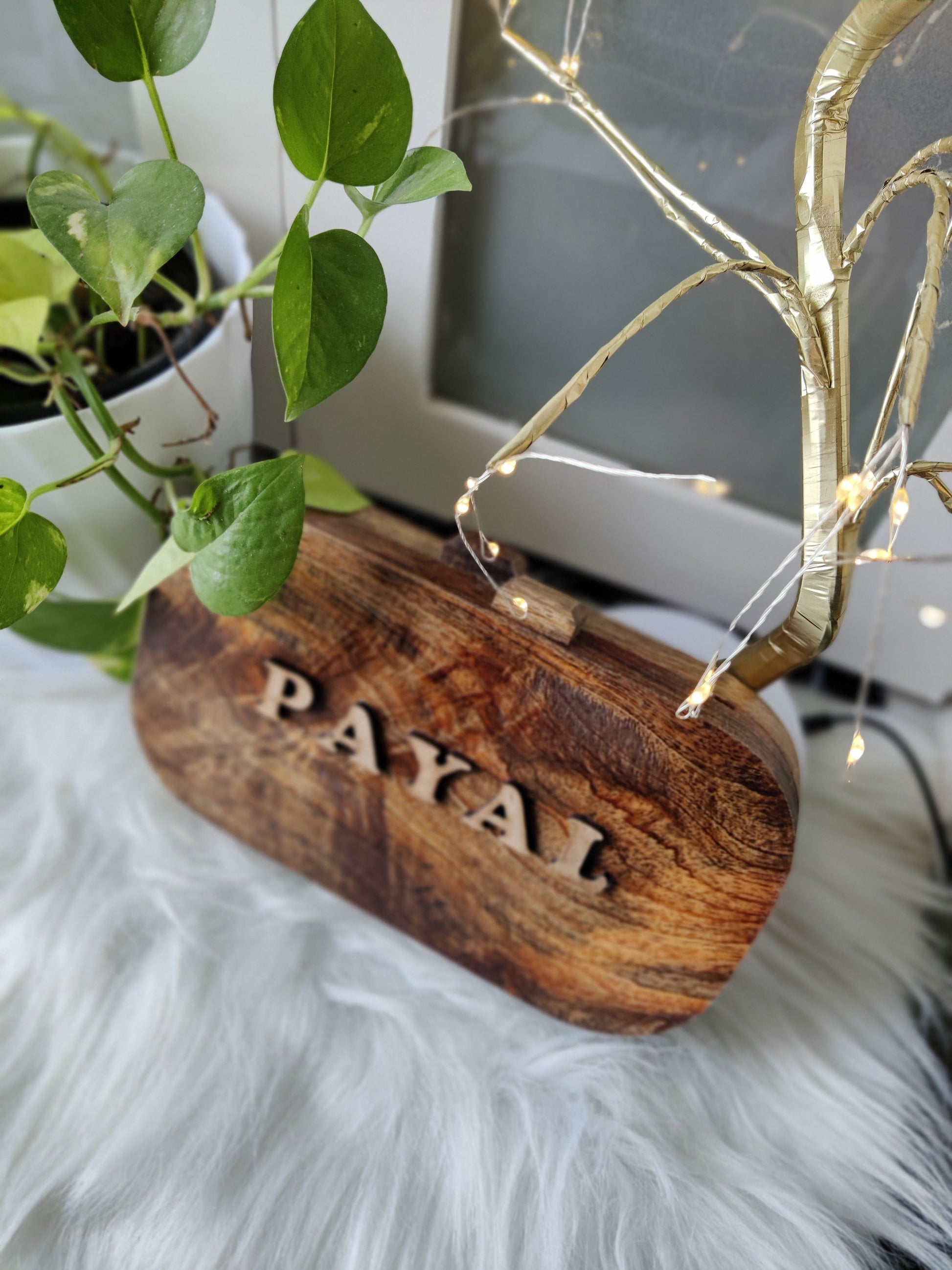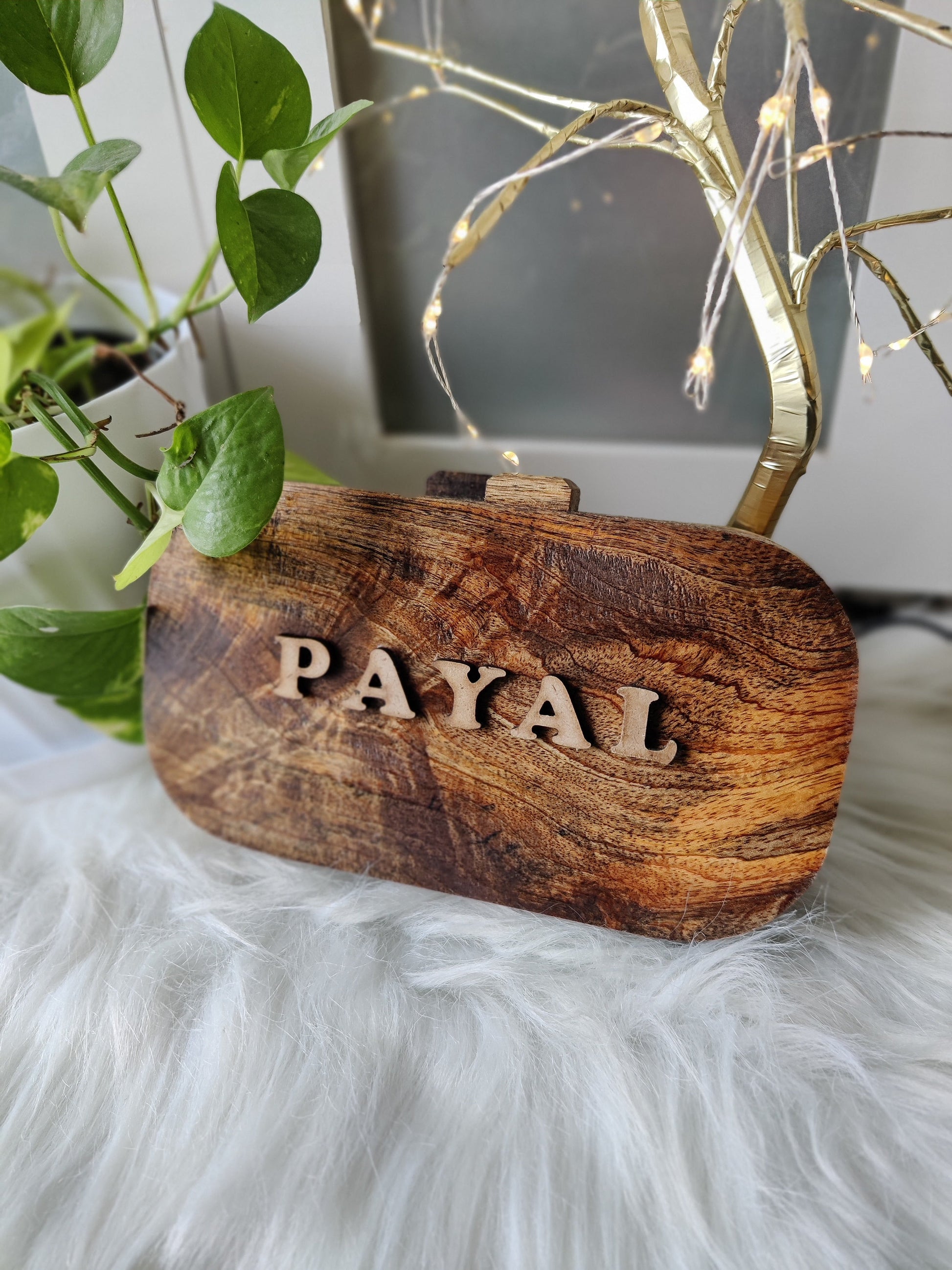 This personalized wooden bag is crafted in a refined rectangular shape with rounded edges from solid acacia wood, and can be customized with your name. It features a magnetic closure for easy access, while the interior is lined with soft black velvet, providing both elegance and protection for your essentials.