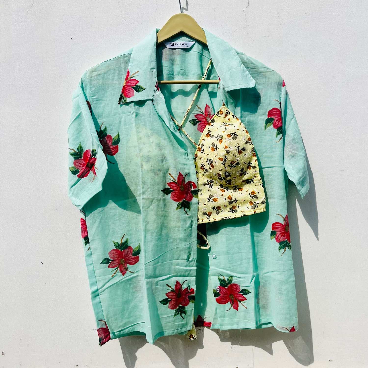 Add an Artistic charm to your wardrobe with the Cyan Blue Hand-Painted Mul Shirt with Bralette Combo. This exquisite set features a lightweight mul fabric shirt in a refreshing cyan blue shade, adorned with intricate hand-painted designs, paired with a coordinating bralette for comfort and style, This combo combines effortless sophistication with artisanal craftsmanship.