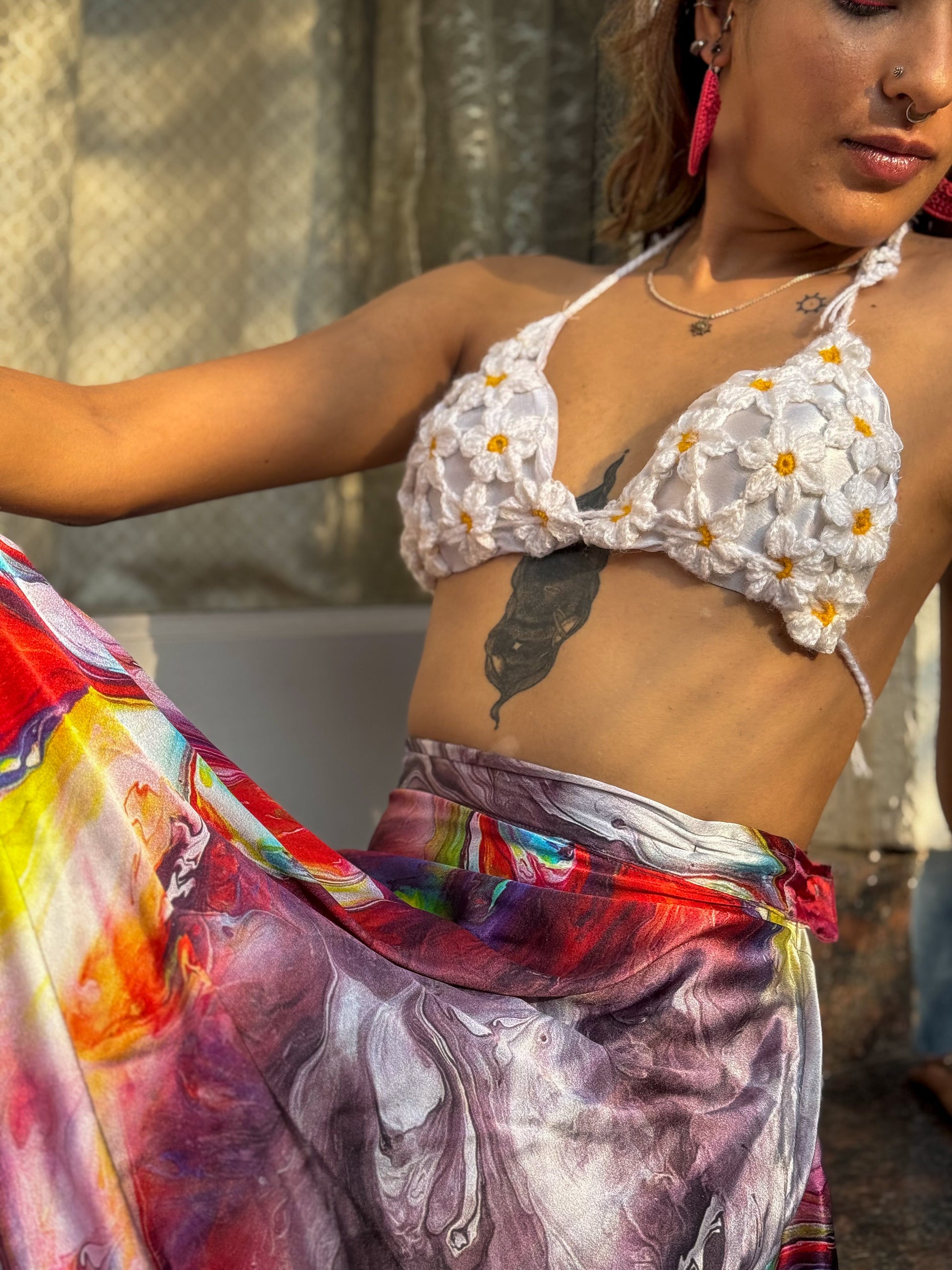Add a touch of artisanal elegance to your swimwear collection with this handcrafted crochet bikini bralette. Each daisy is meticulously crocheted and stitched together, offering a vibrant, one-of-a-kind design. Padded for comfort and lined with soft satin, this bikini provides luxurious support, while its durable acrylic yarn ensures lasting color and style.