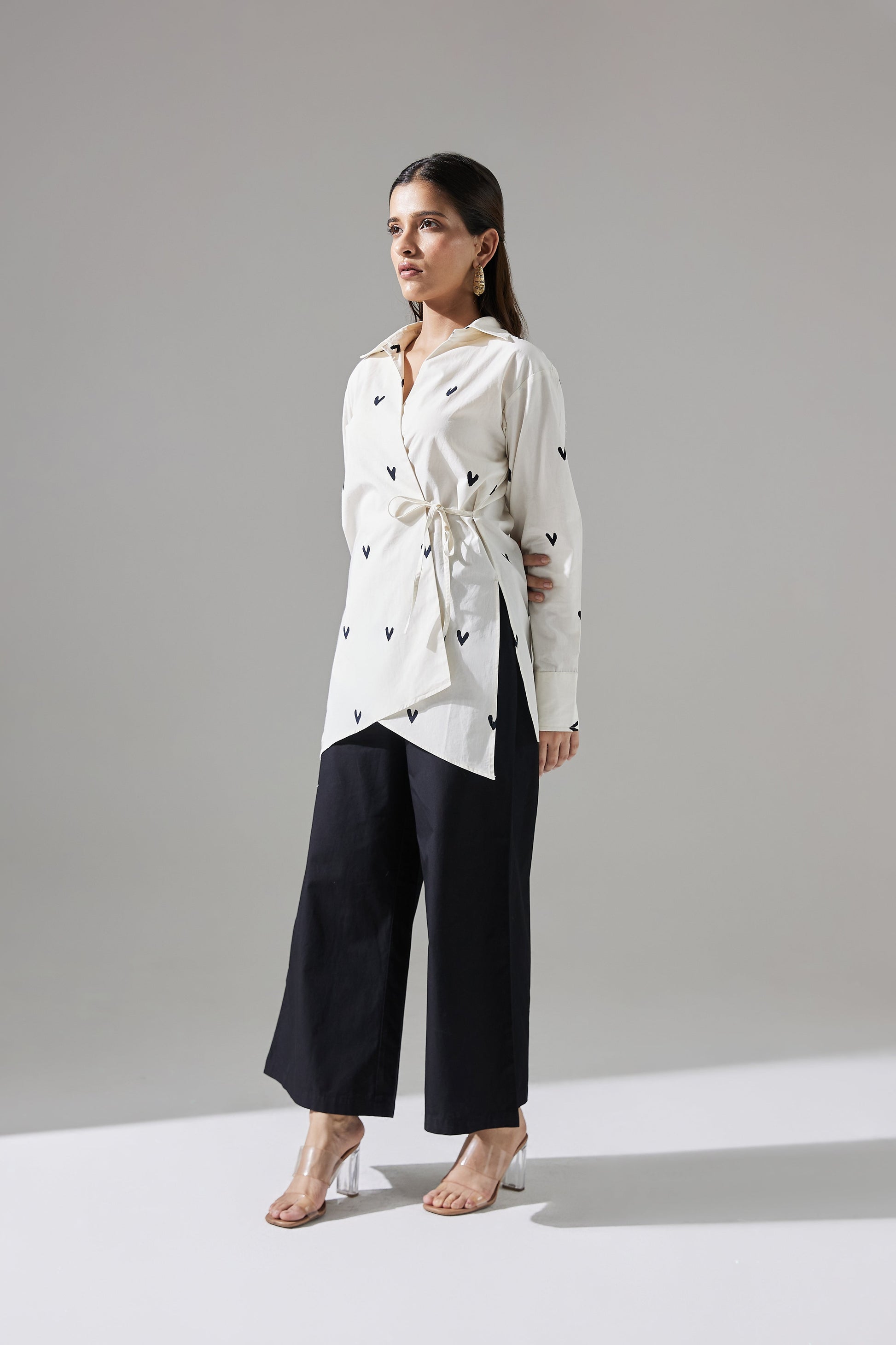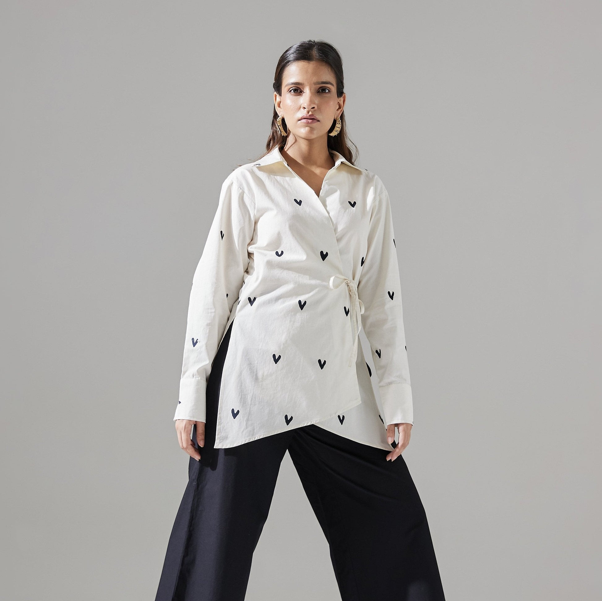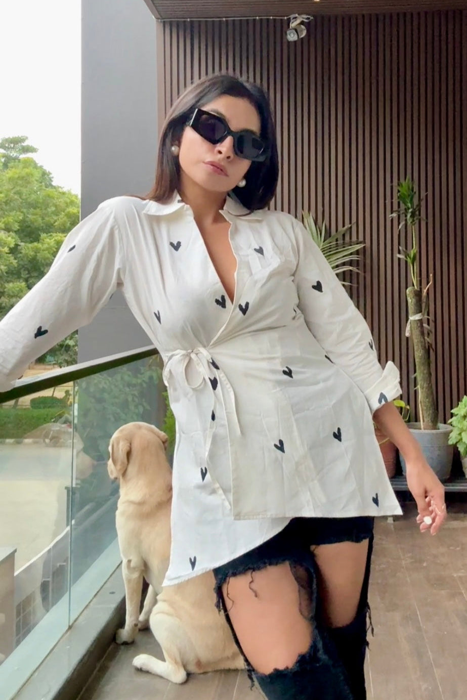 Step into summer with effortless charm in the adorable Daisy Shirt. Featuring a white wrap-up shirt adorned with playful black hearts, designed for both comfort and style. Crafted from light, breezy fabric, it’s perfect for staying cool and chic on sunny days.
