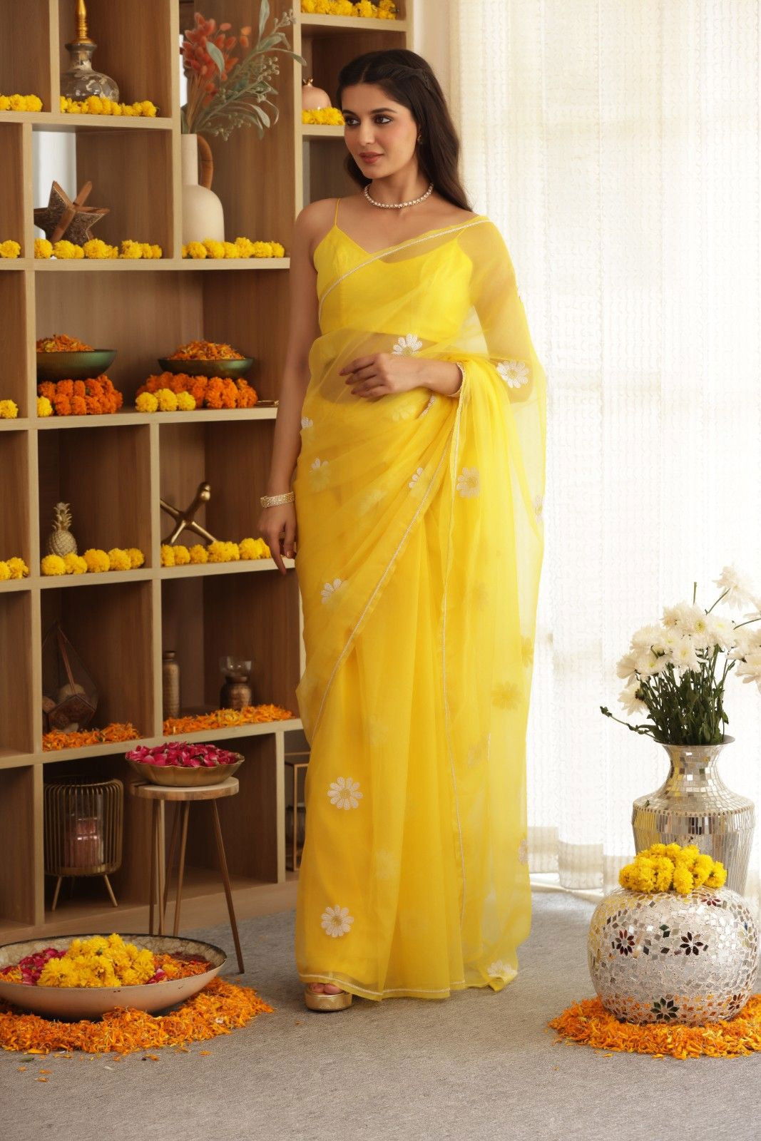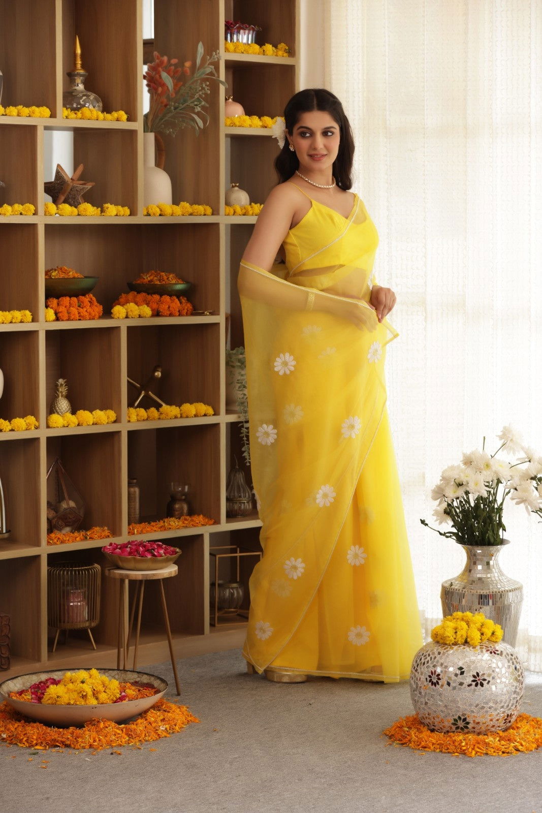 Daisy Yellow Hand-Embroidered Silk Organza Saree