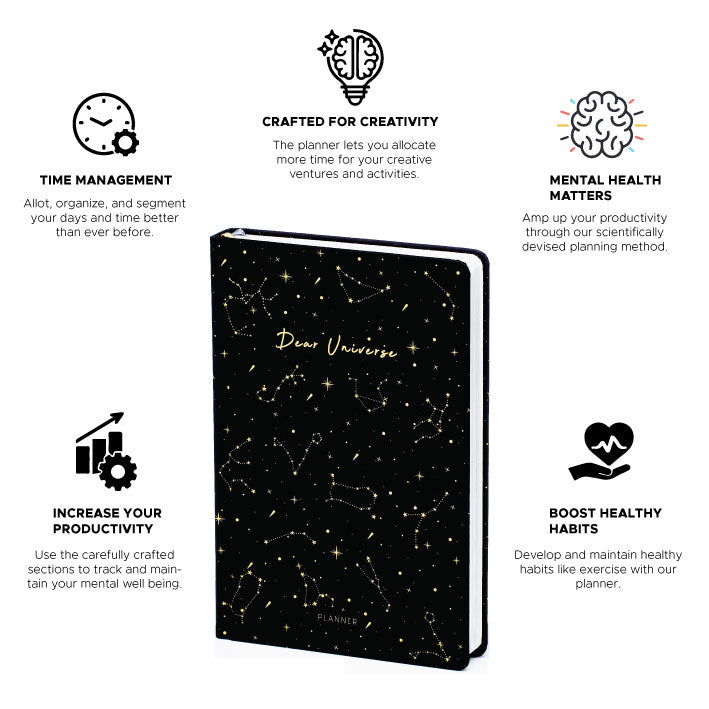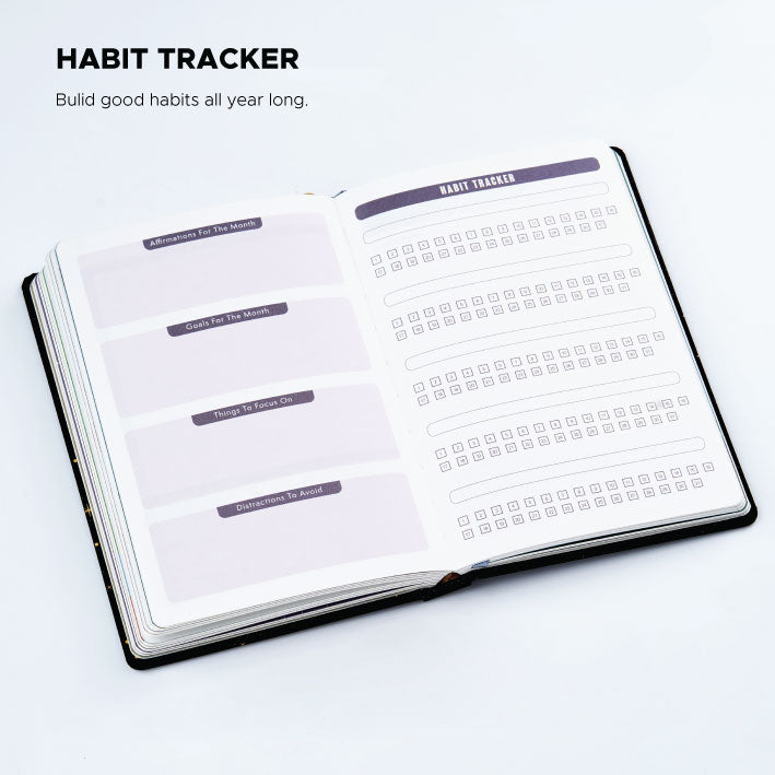 Sneak peek: 8 Sheets Stickers | Habit Trackers | Monthly stress-buster activities | Improvement Plan| Letter to Future Self| Vision Board | Sleep Trackers | Bucket & Anti-Bucket List | Budget Tracker | Monthly Dividers to motivate you| Self-Exploration Prompts to get to know yourself better | Monthly Affirmations | Mood Trackers | Monthly Reflections | Weekly reflection | Monthly Meal Planning | Shopping List | Reminders | Reading & Learning List | Movies & Series Watchlist | Wishlist | Possessions List | Annual Vacation Plan | 3 Bookmark ribbons | Inner pocket for storage