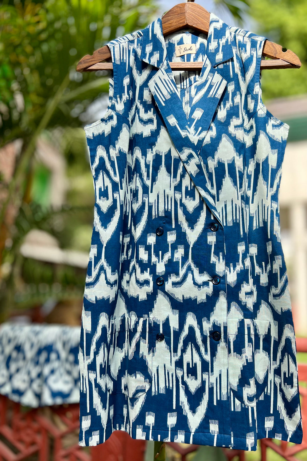 A Deep Blue Ikkat Sleeveless Double Breast Long Blazer with Pants Co-ord set, for an effortlessly chic vibe.
