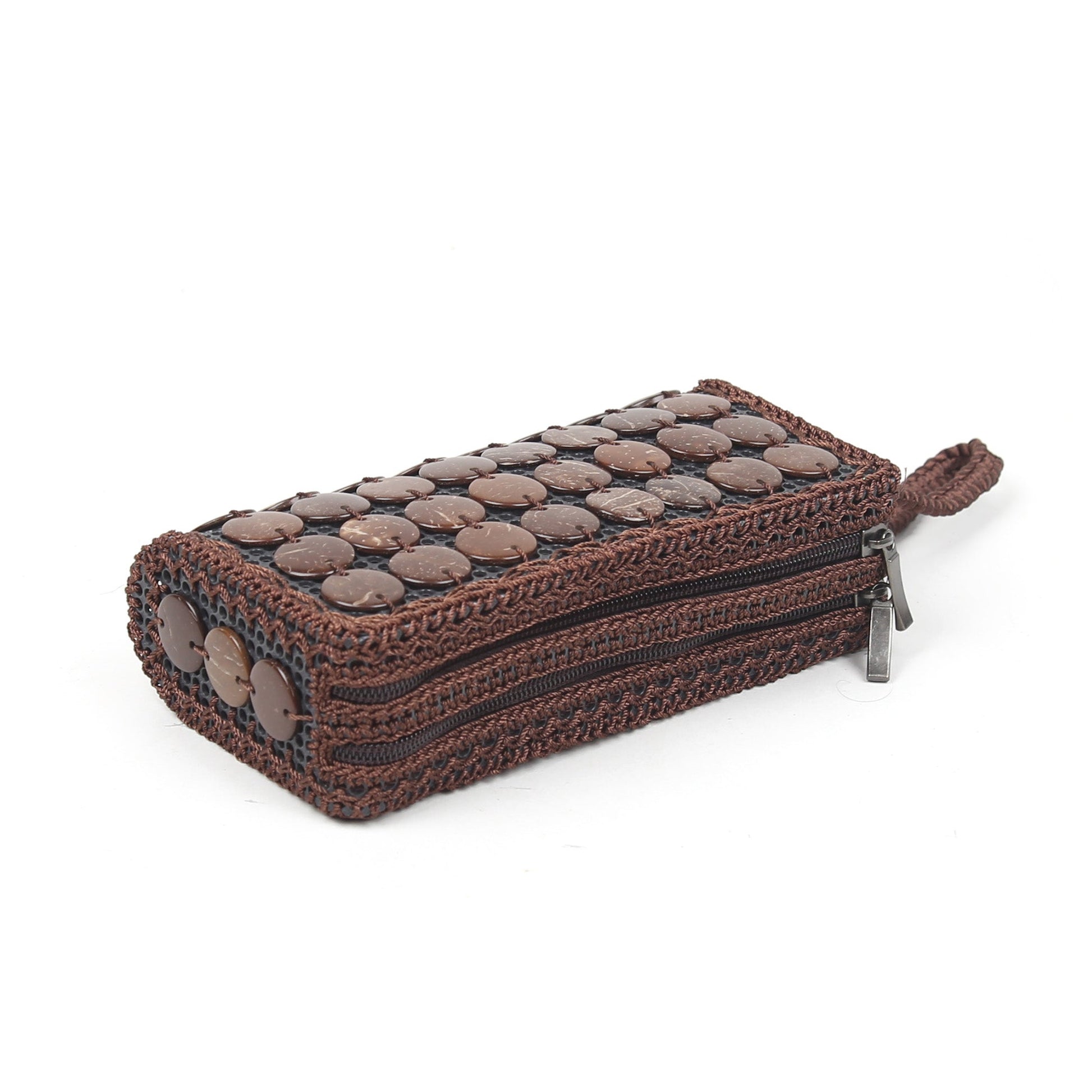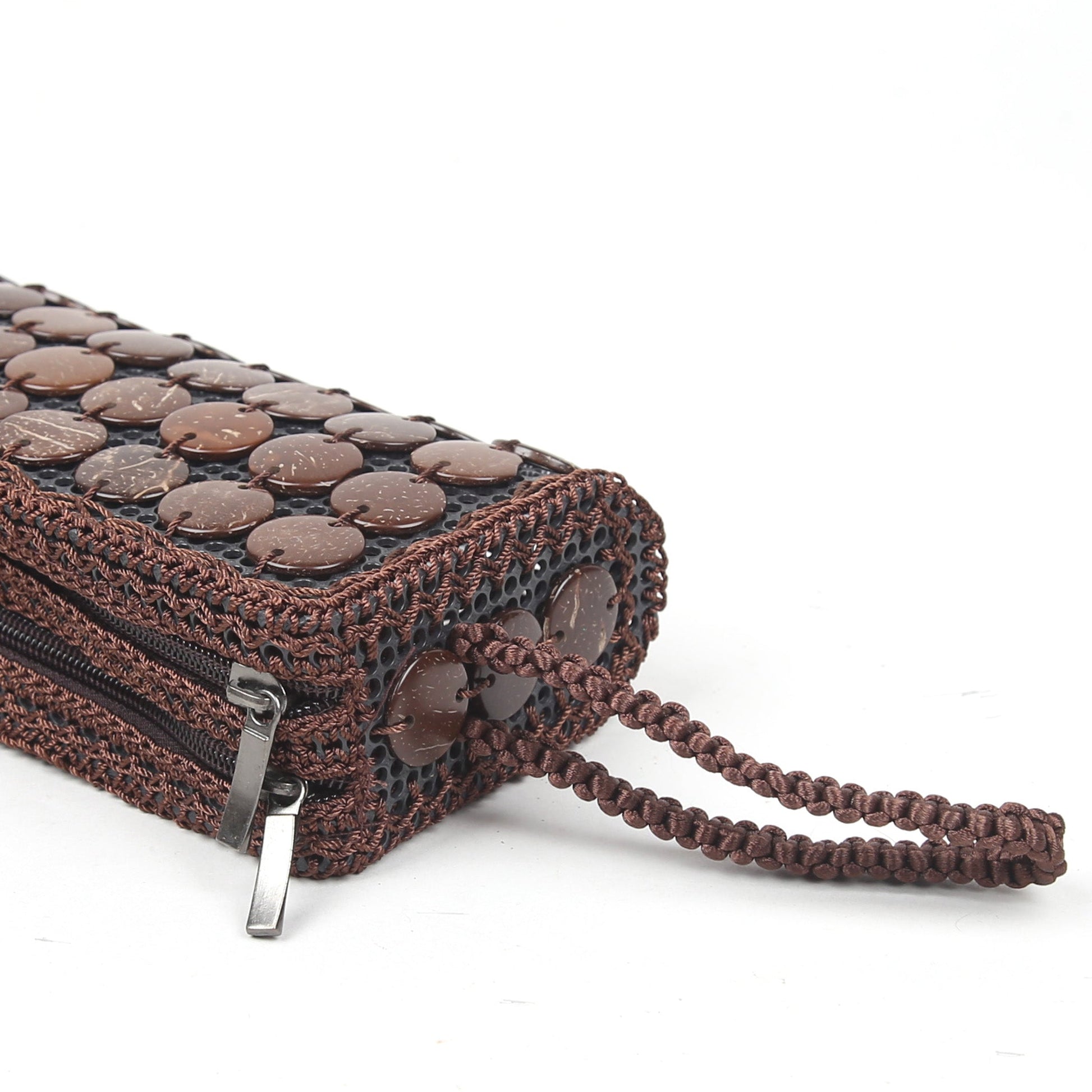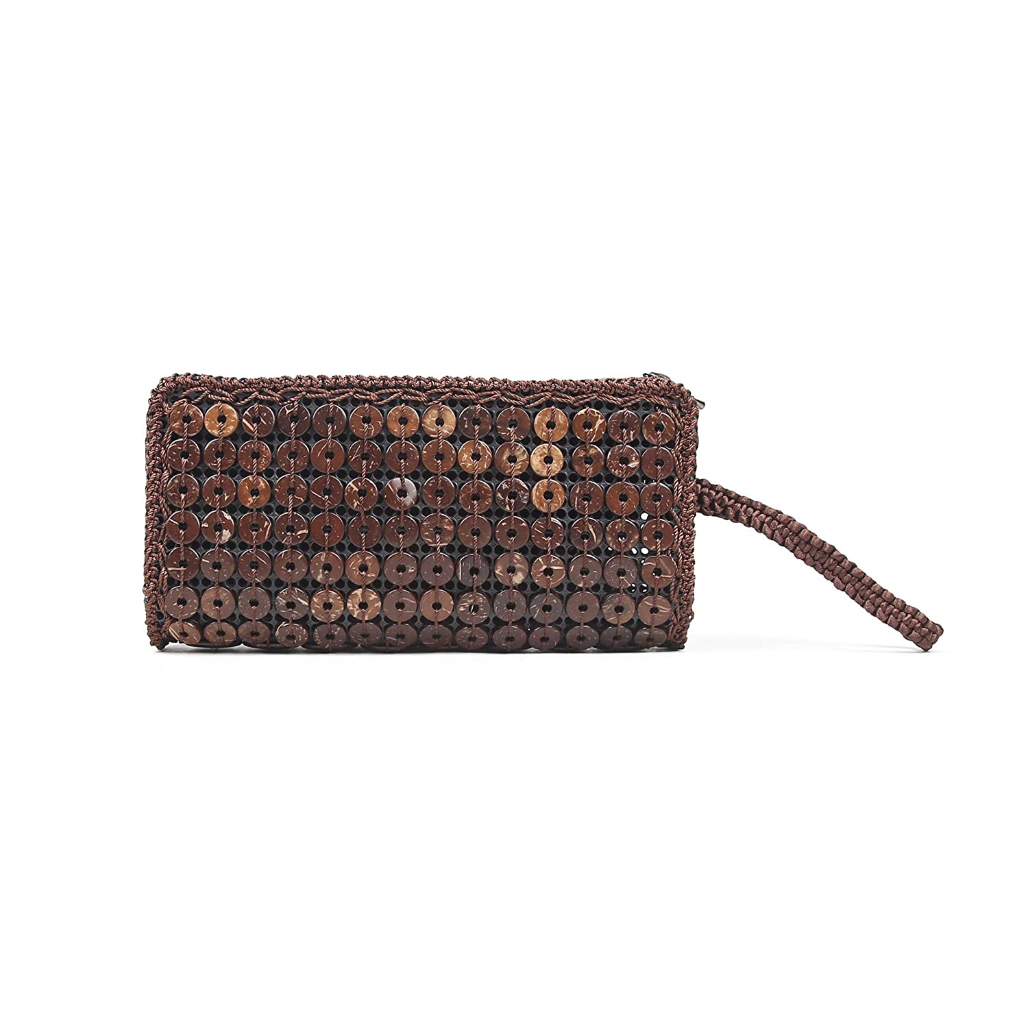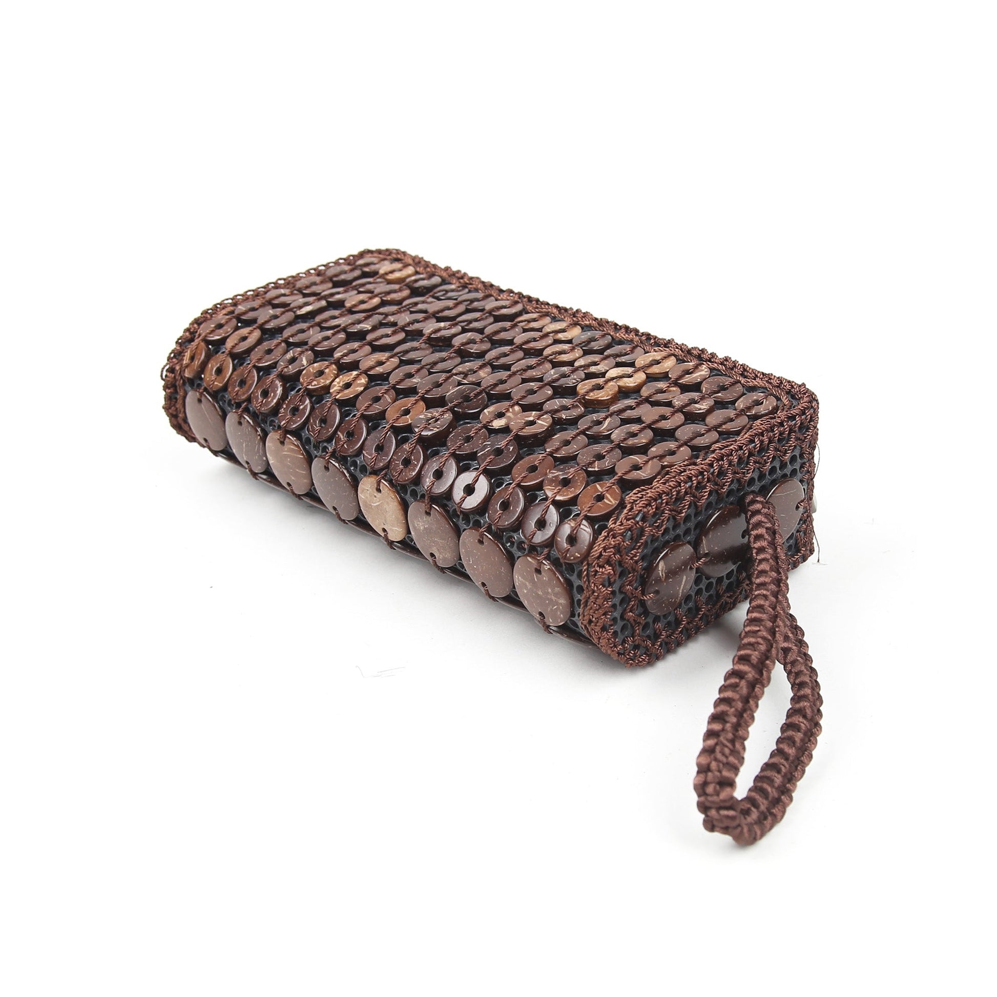 It is a compact double pocket clutch with a strap for secure grip around the wrist. Strong, heavy zip-chain and premium quality coconut shells with a smooth, glowing finish.