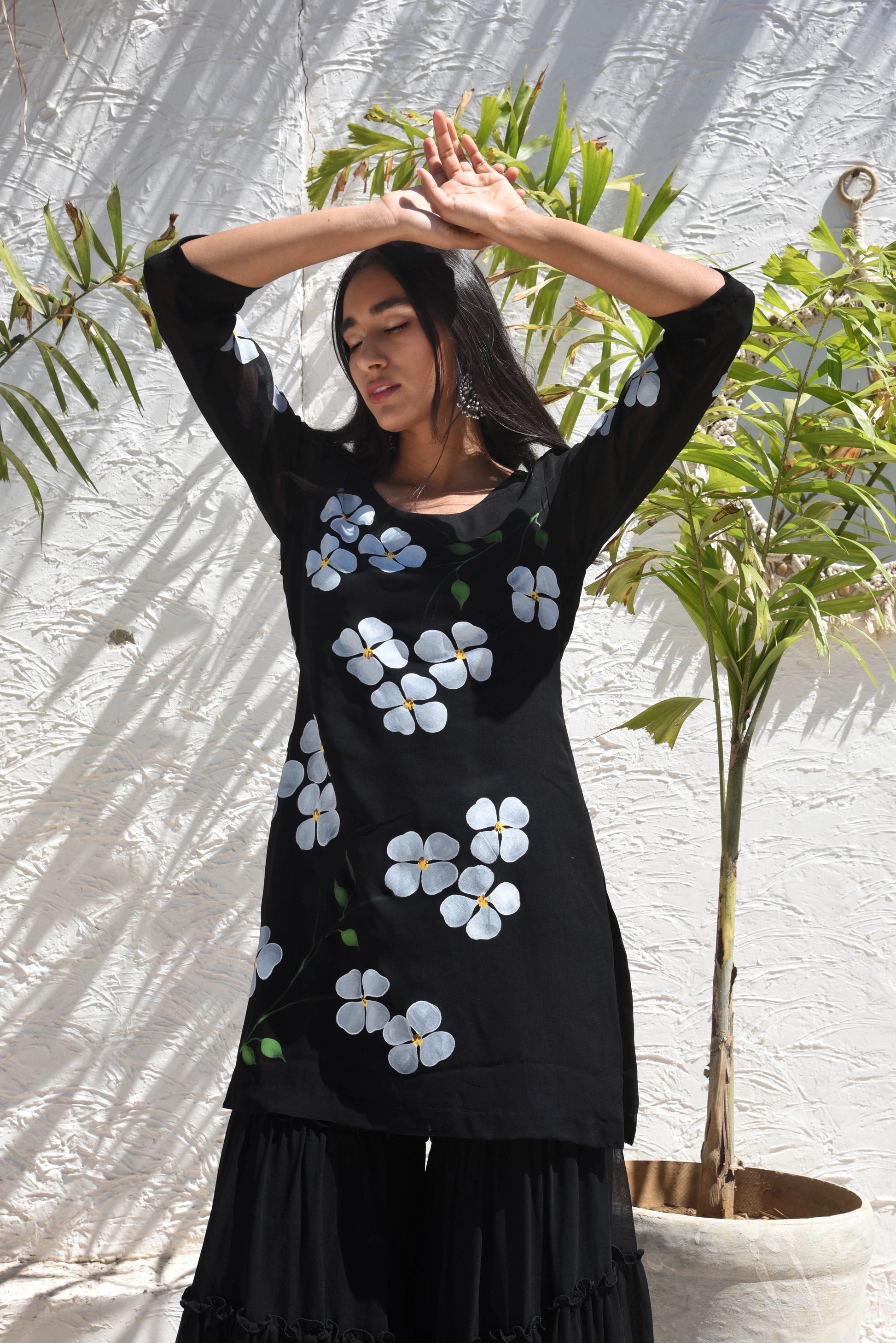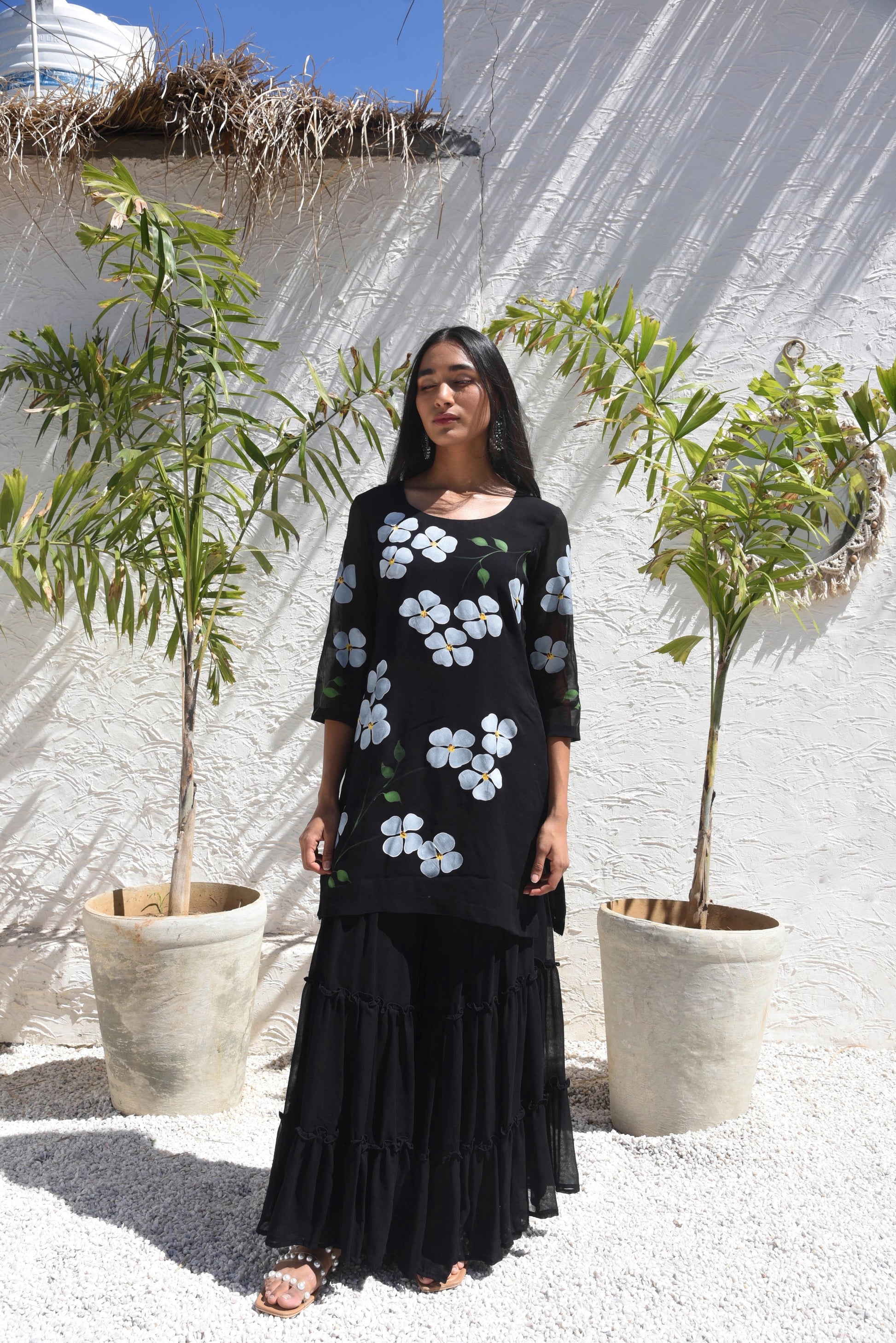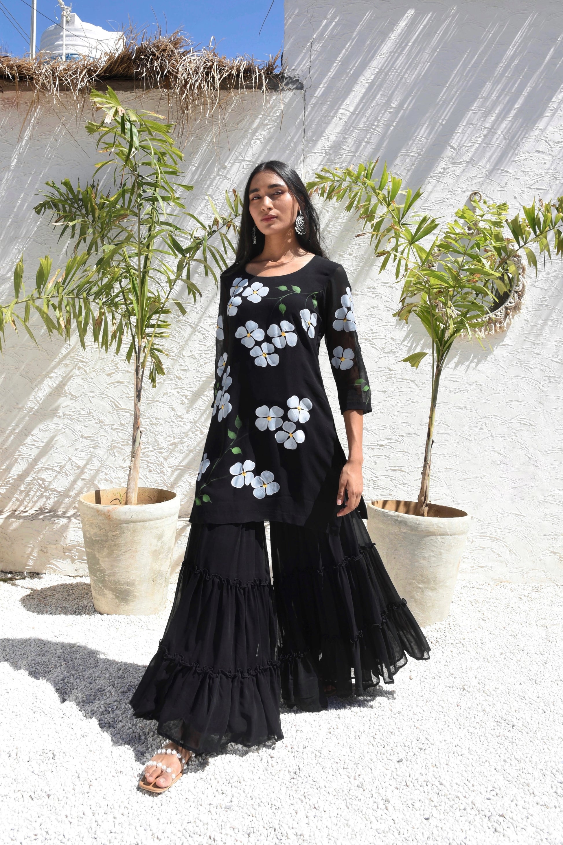 Exuding timeless elegance, the Dogwood Sharara Set in Black is a perfect fusion of tradition and modern sophistication. Designed with a flattering silhouette, this set features a finely detailed kurta paired with flowy sharara pants for effortless grace. The rich black hue, complemented by intricate embroidery, makes it an ideal choice for festive occasions, celebrations, and evening gatherings. Pair it with statement jewellery and classic heels to complete the look with refined charm.