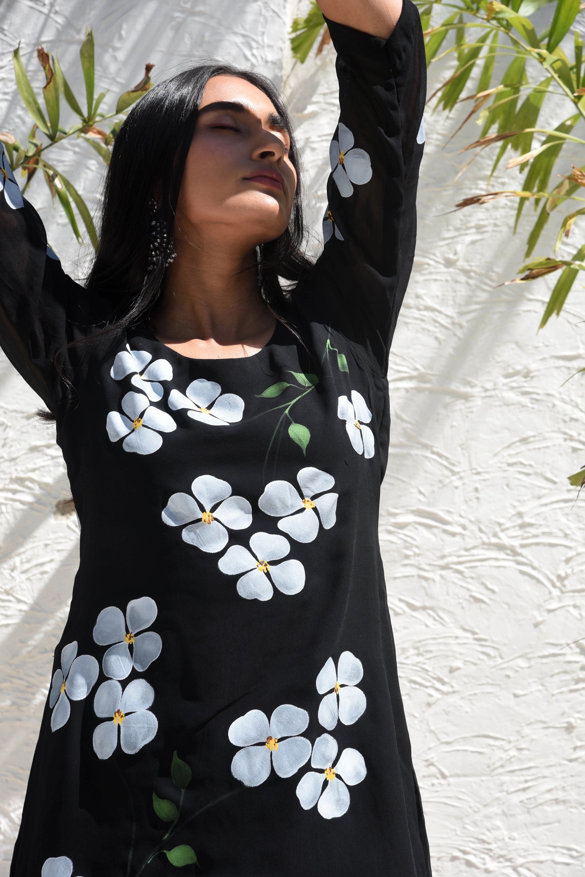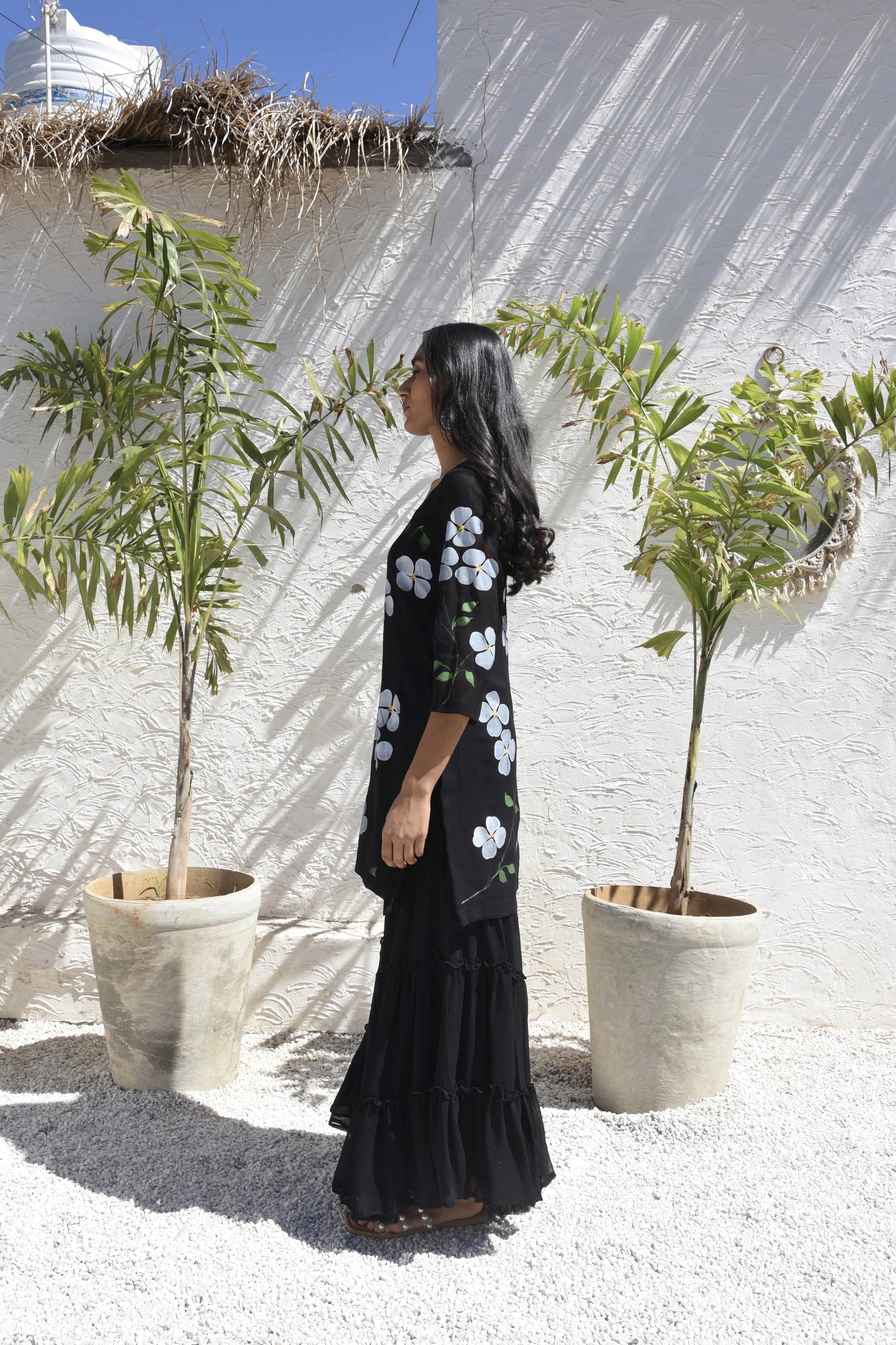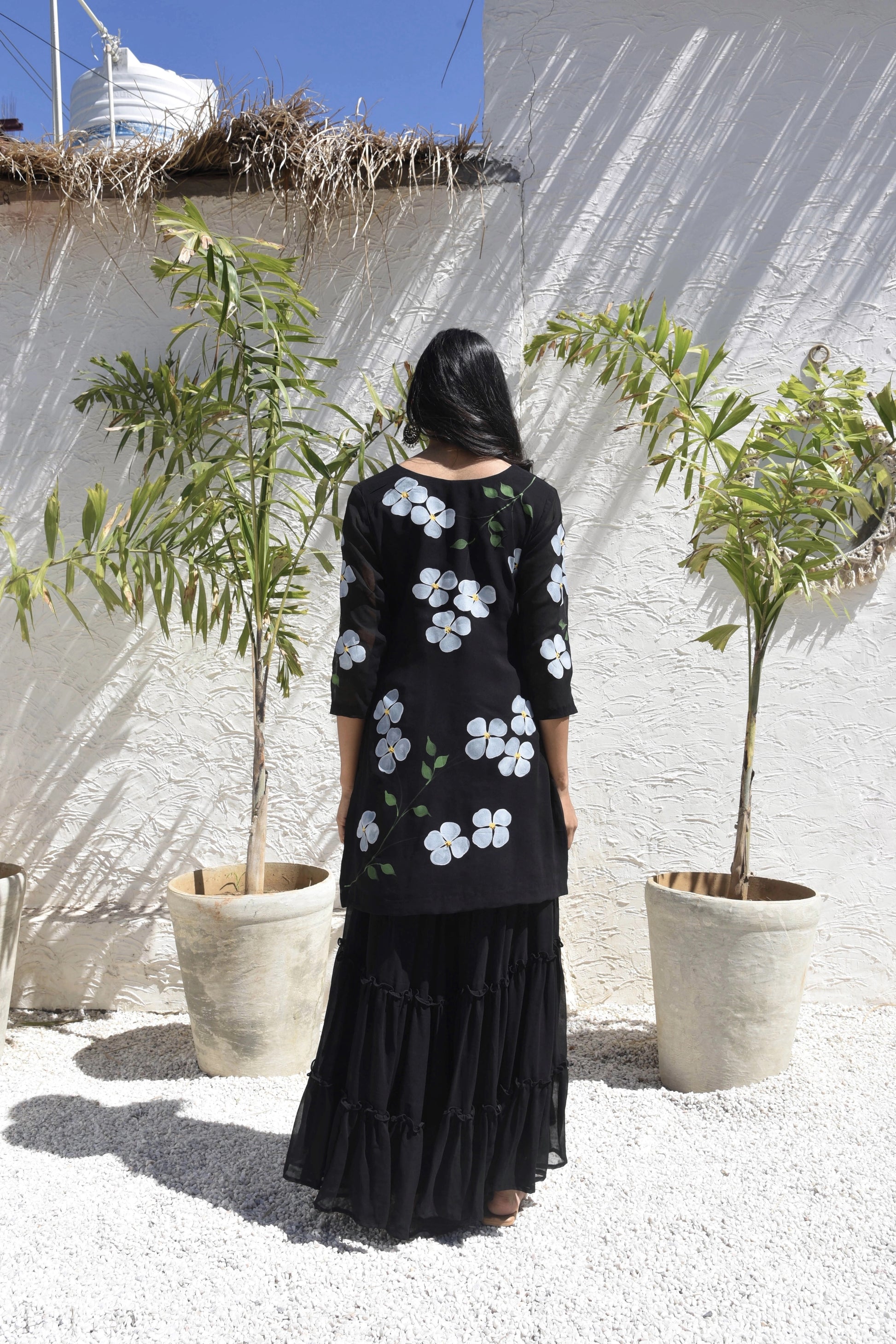 Exuding timeless elegance, the Dogwood Sharara Set in Black is a perfect fusion of tradition and modern sophistication. Designed with a flattering silhouette, this set features a finely detailed kurta paired with flowy sharara pants for effortless grace. The rich black hue, complemented by intricate embroidery, makes it an ideal choice for festive occasions, celebrations, and evening gatherings. Pair it with statement jewellery and classic heels to complete the look with refined charm.
